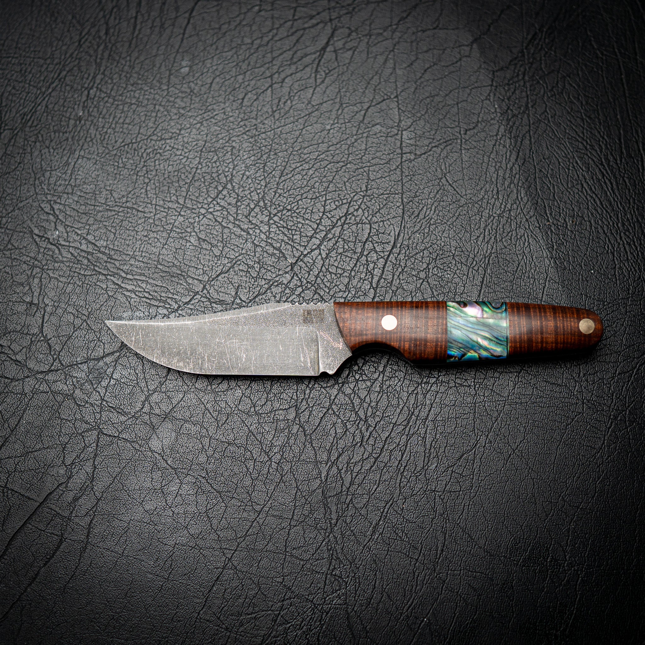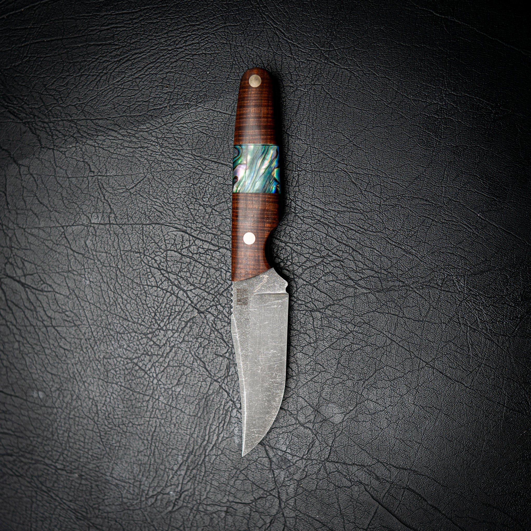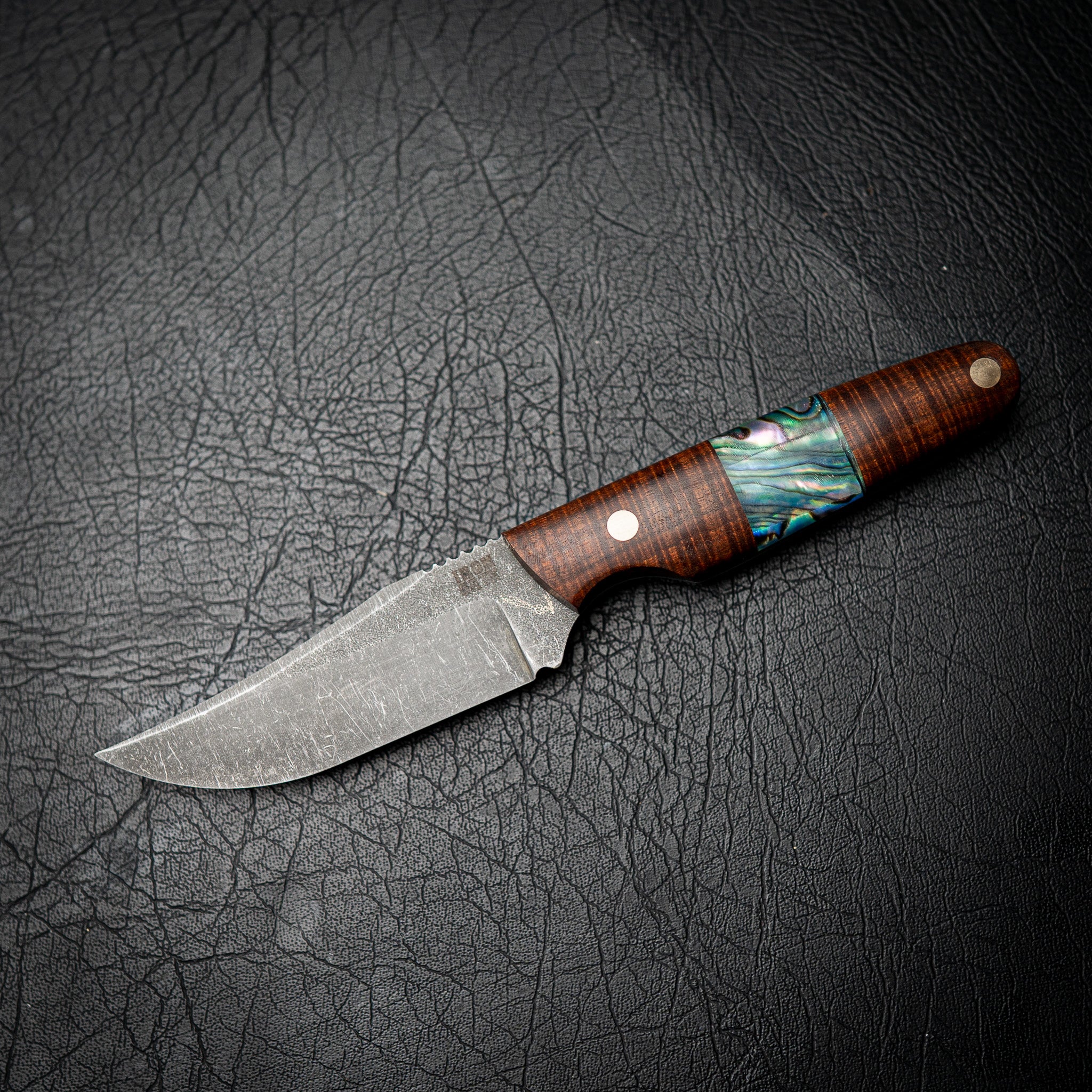 This version features a Ringed Gidgee handle — one of Australia’s most premium hardwoods — paired with a striking natural abalone shell inlay. The combination of rich timber grain and iridescent shell gives this knife a timeless, high-end finish that stands out without sacrificing toughness.