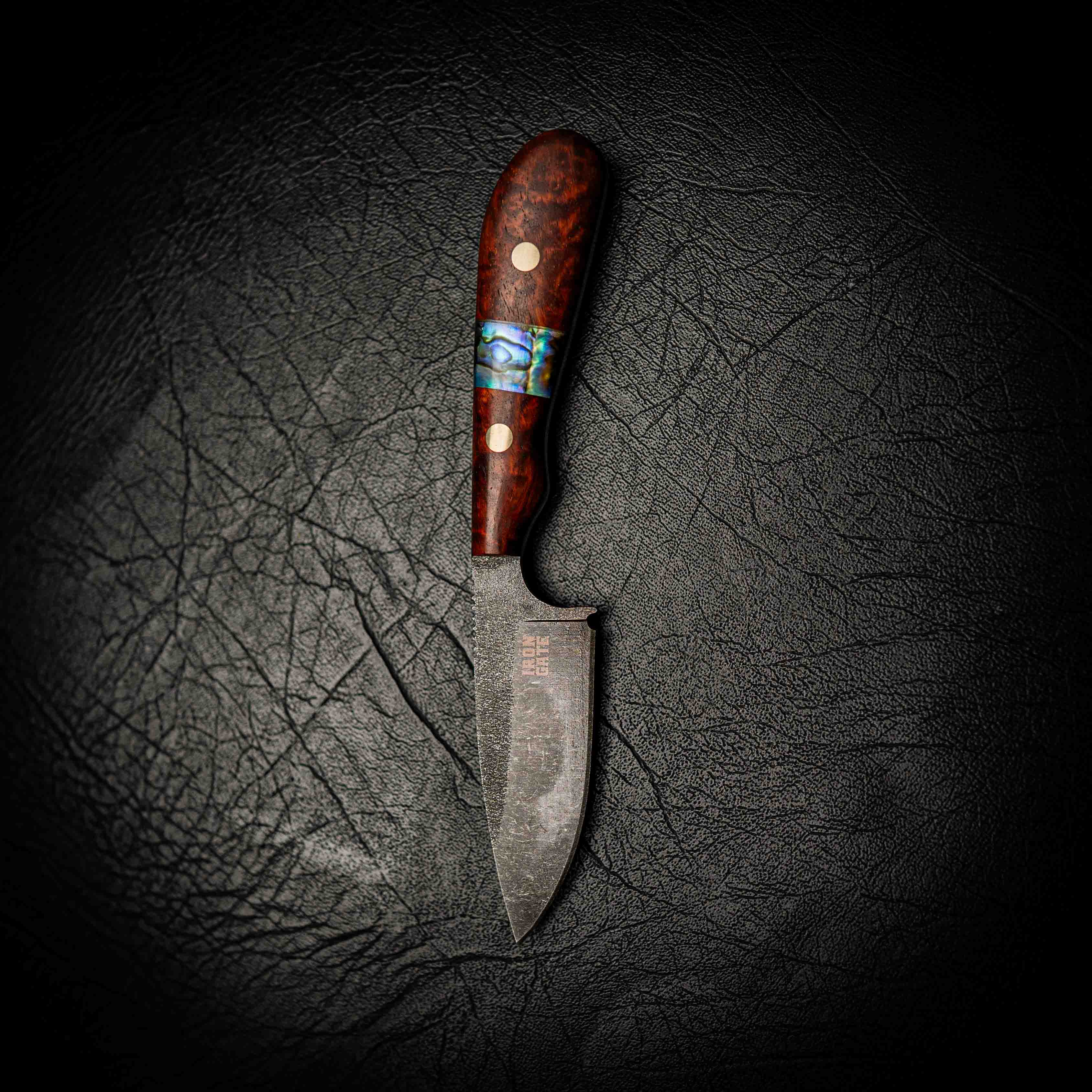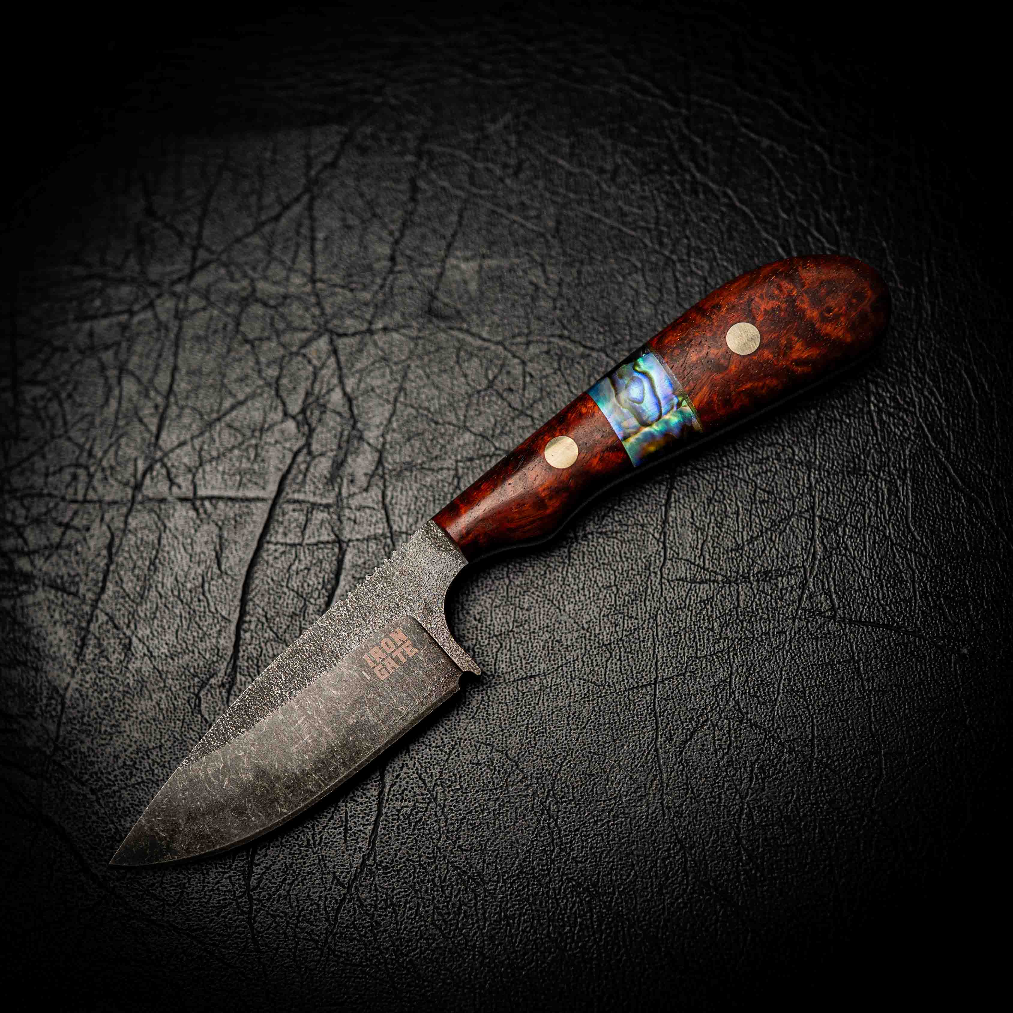 The stonewashed finish gives the blade a rugged, matte texture that hides wear while highlighting the handcrafted grind lines. The handle is made from richly toned Rosewood, featuring a natural Abalone shell inlay that shimmers with depth and colour. Each handle is hand-shaped, polished, and finished to perfection — no two knives are ever the same.
