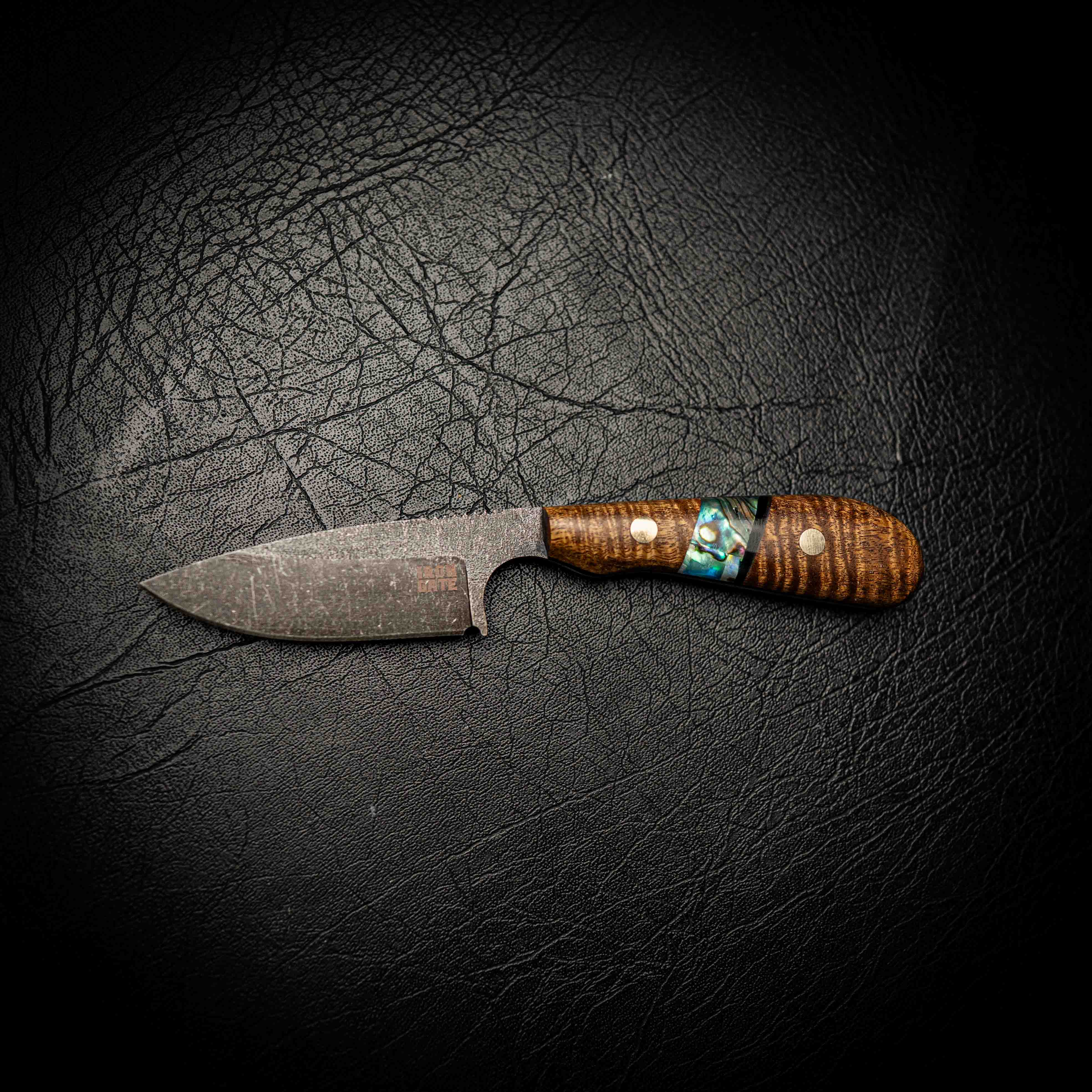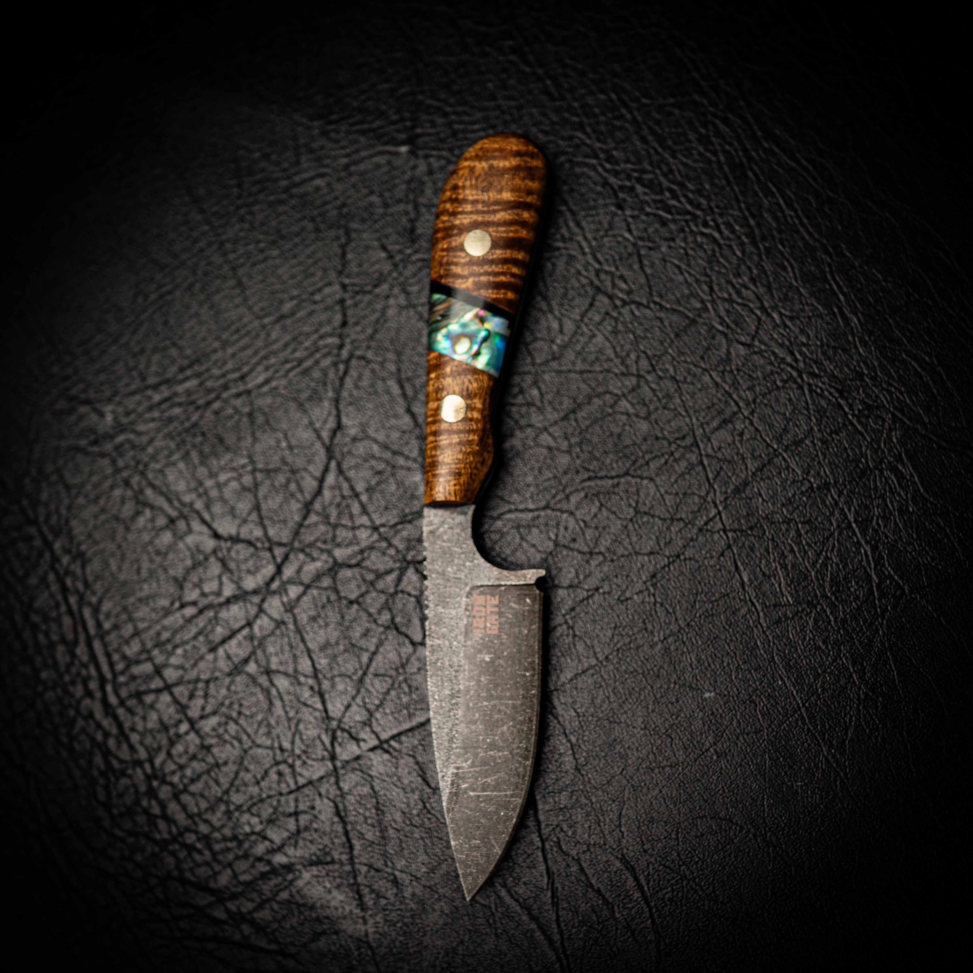 The stonewashed finish gives the blade a rugged, matte texture that hides wear while accentuating every handcrafted grind line. The handle features Stabilised Ringed Acacia, one of Australia’s most stunning native timbers, fitted with a natural Abalone shell inlay that shimmers with ocean-like depth and colour. Each knife is shaped, finished, and polished by hand — no two are ever the same.