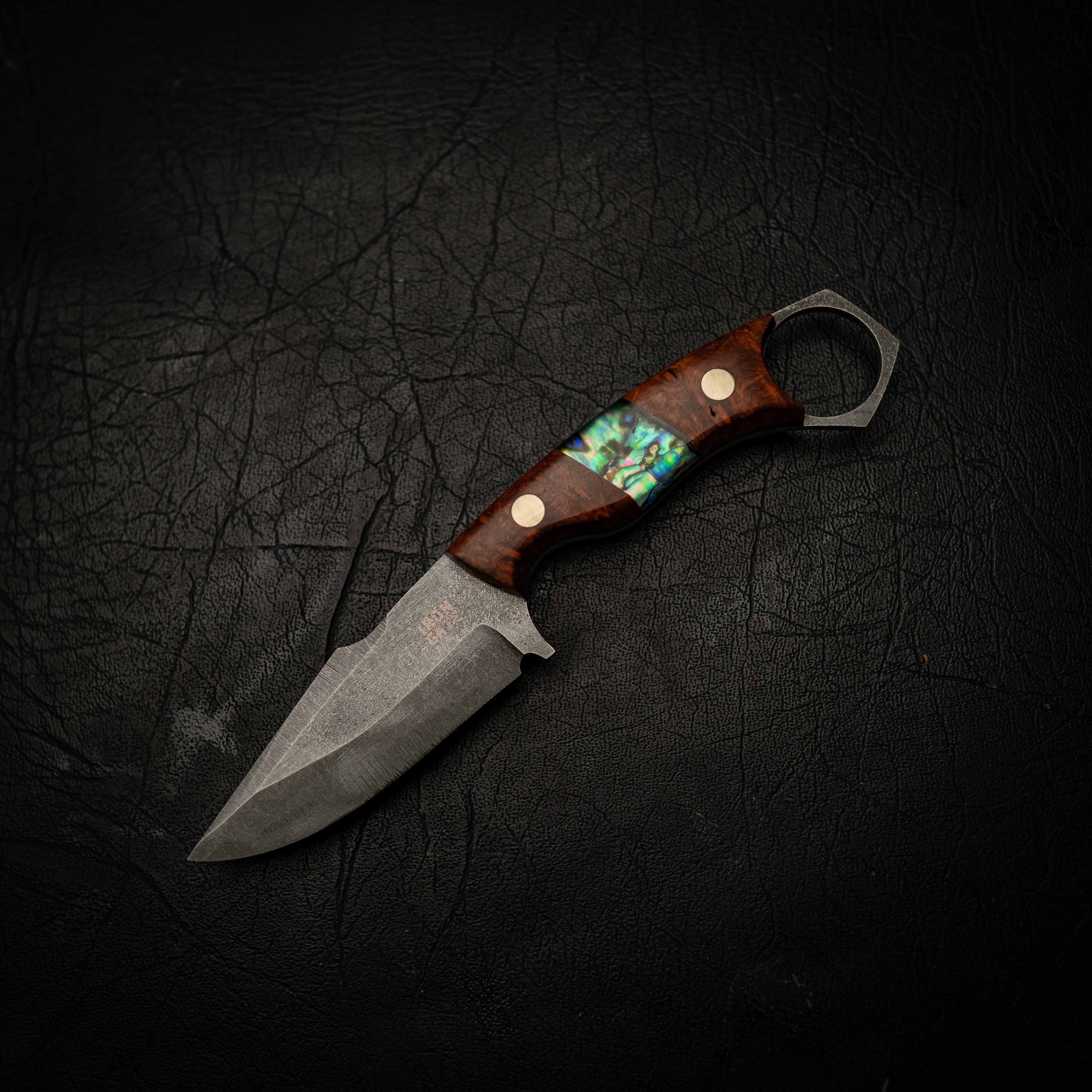 This knife is 100% handmade in our Anna Bay workshop by a small crew of Aussie makers. No mass production. No factory lines. This build features an N690 stainless steel blade with an etched and stonewashed finish, paired with red Amboyna burl with abalone inlay, making it a one-off in this drop. Once this exact knife is gone, it’s gone.