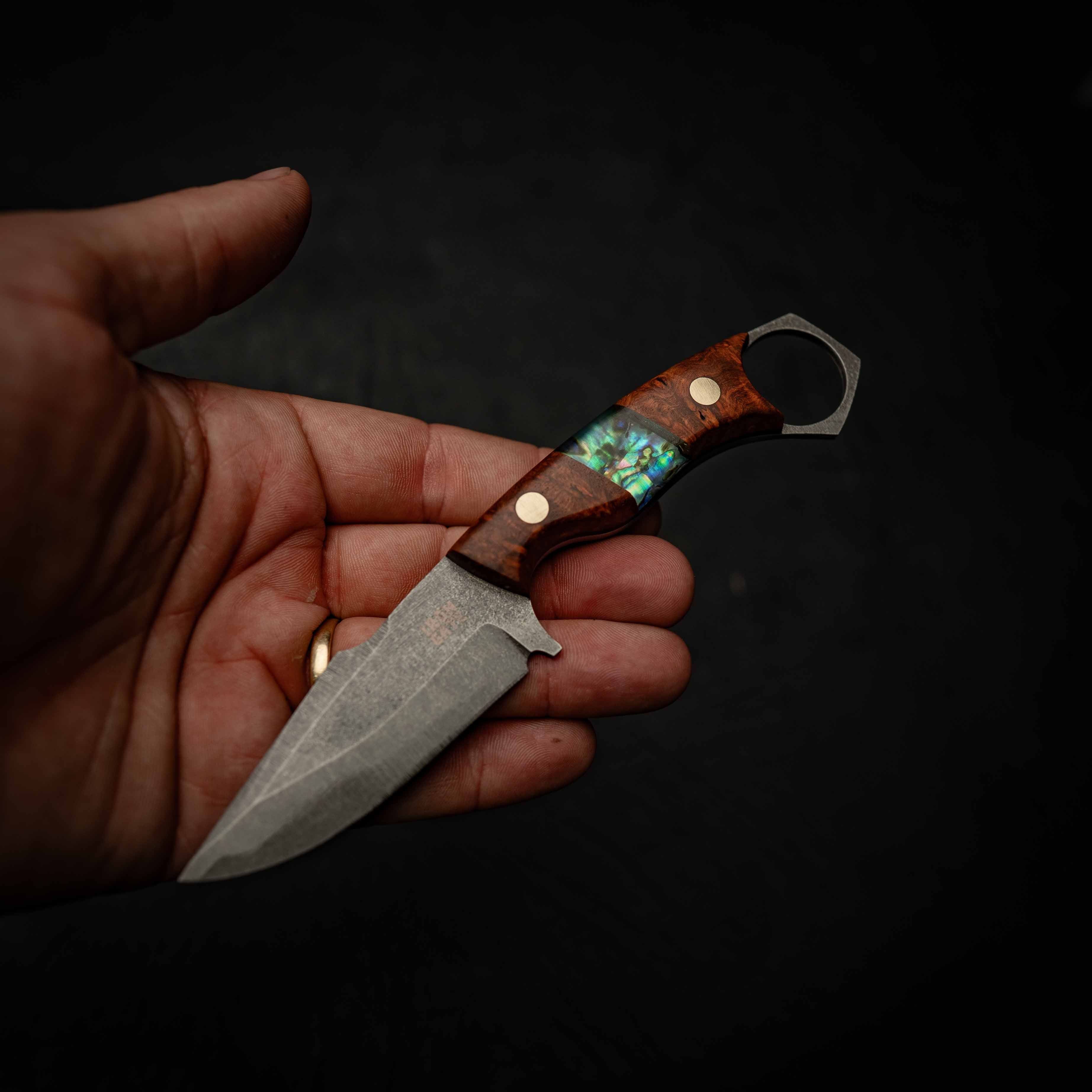 Red Amboyna burl brings deep colour and natural figure, while the abalone inlay adds a subtle detail and visual contrast. The result is a unique handle that still holds up to real-world use.