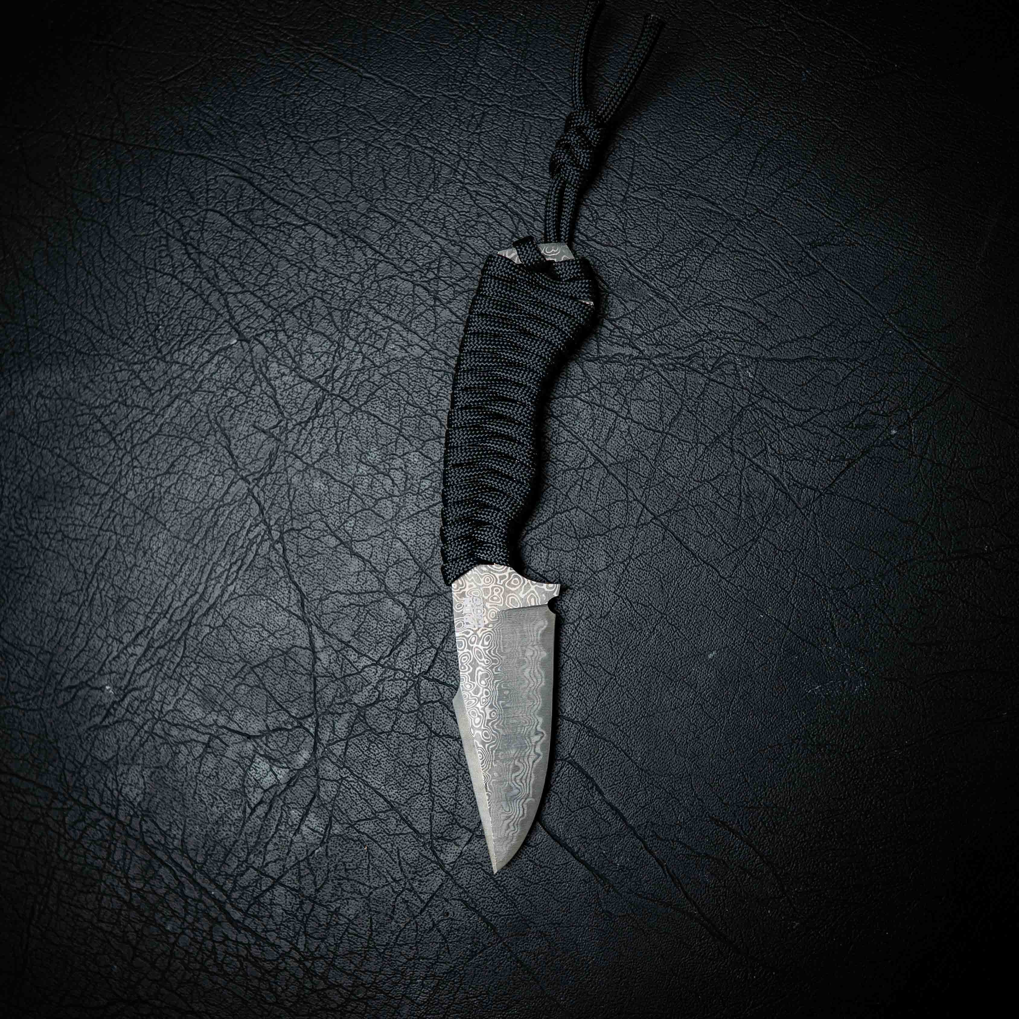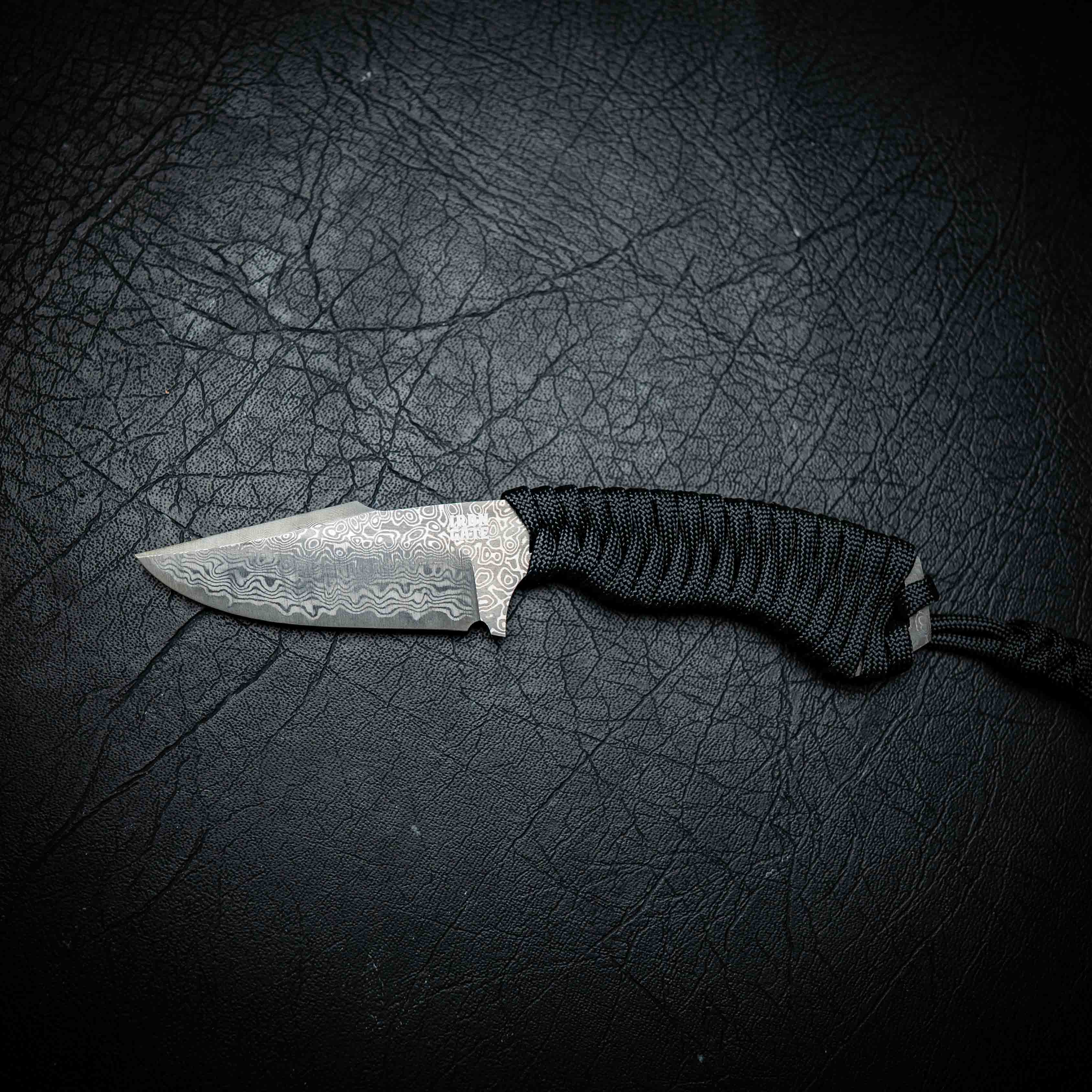 This Mini Hunter features a stainless Damascus San Mai blade with a random-layered pattern, paired with a black paracord handle wrap for a secure, lightweight grip. Stripped-back and functional, it’s designed for those who value simplicity, performance, and reliability.