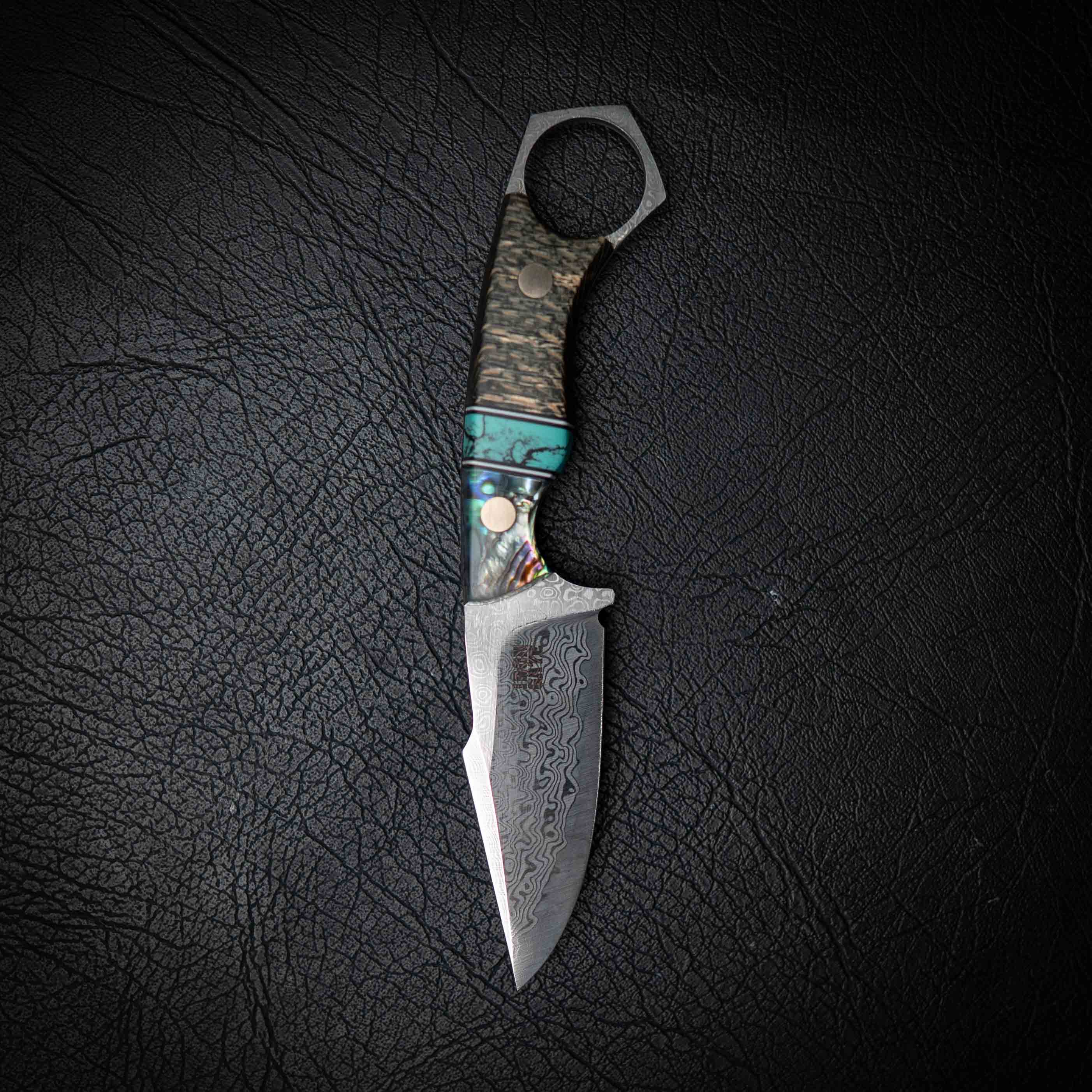 This Mini Hunter features a stainless Damascus San Mai blade with a random-layered pattern, paired with a handle of natural abalone shell, Trustone, and stabilised Pagoda wood. Every element is chosen for its beauty, strength, and individuality.
