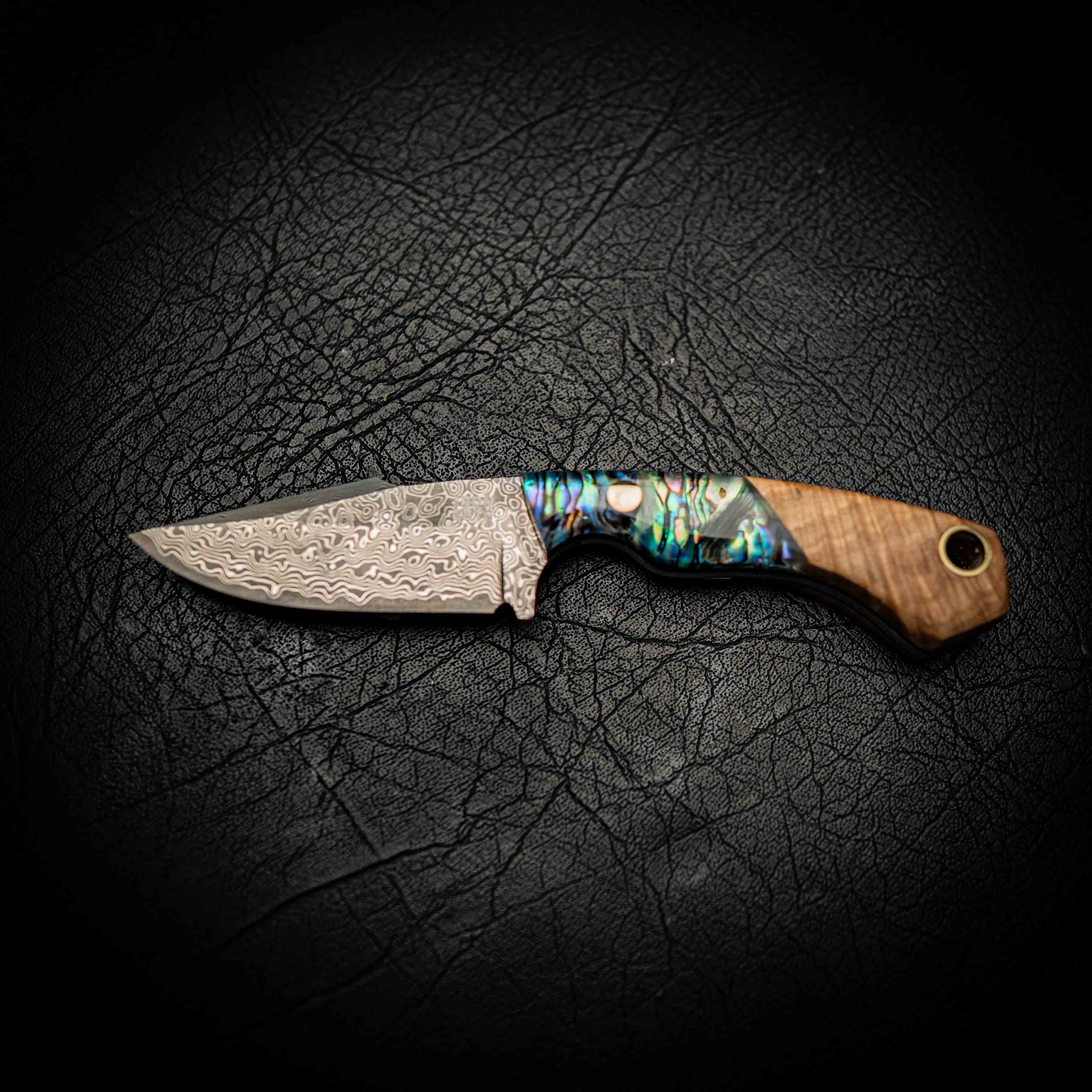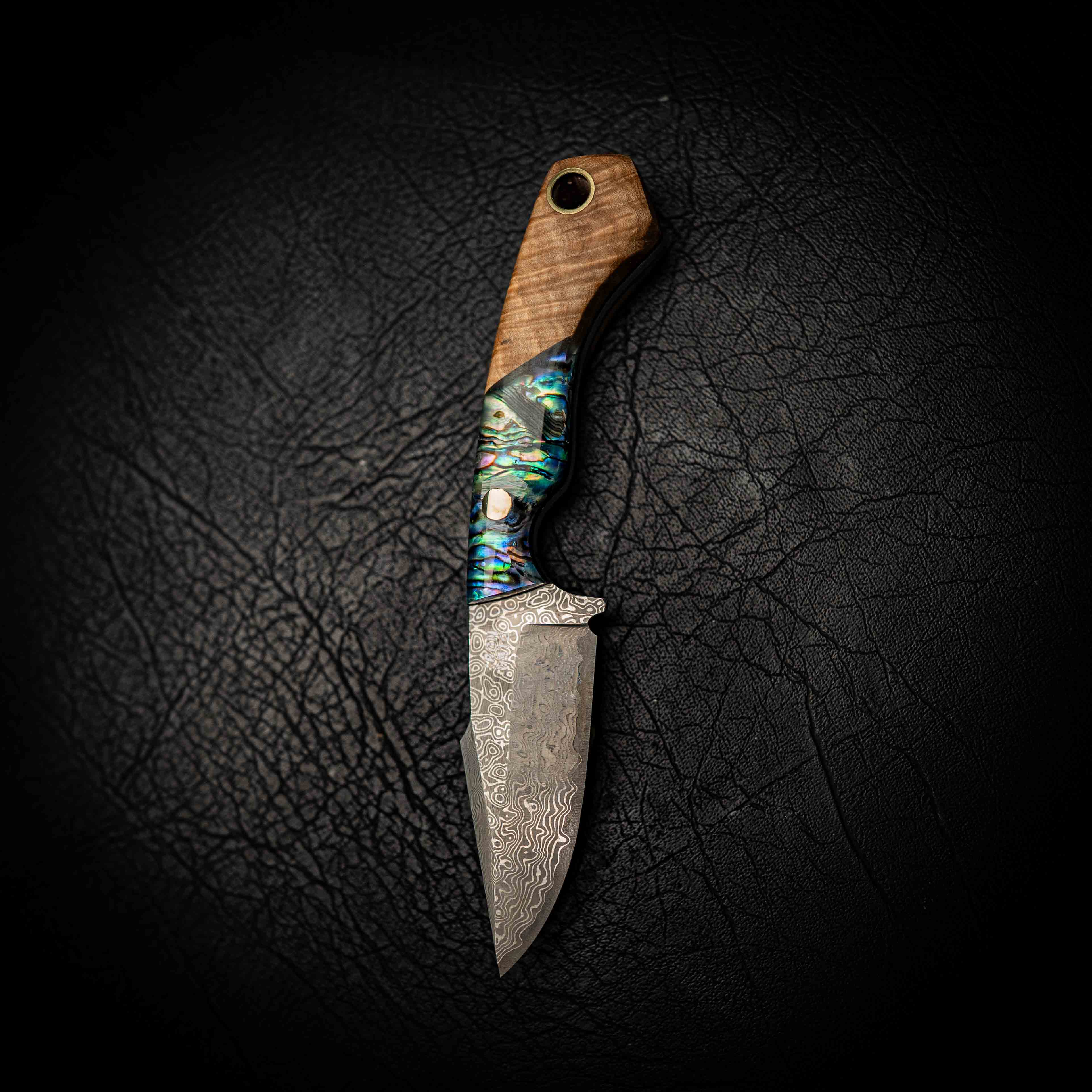 The handle combines beautifully Figured Maple with a natural Abalone shell inlay, hand-fitted and polished to perfection. The result is a lightweight, balanced knife that feels alive in the hand — equal parts tool and art piece.