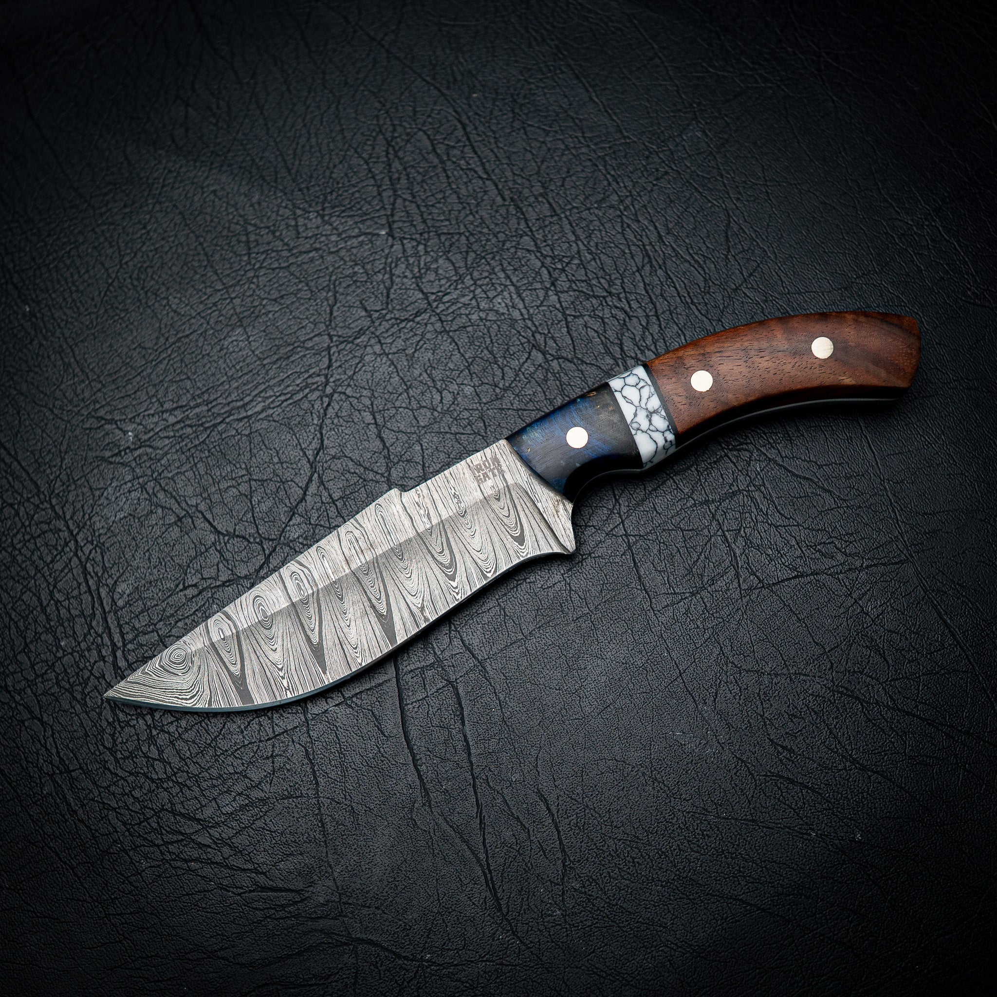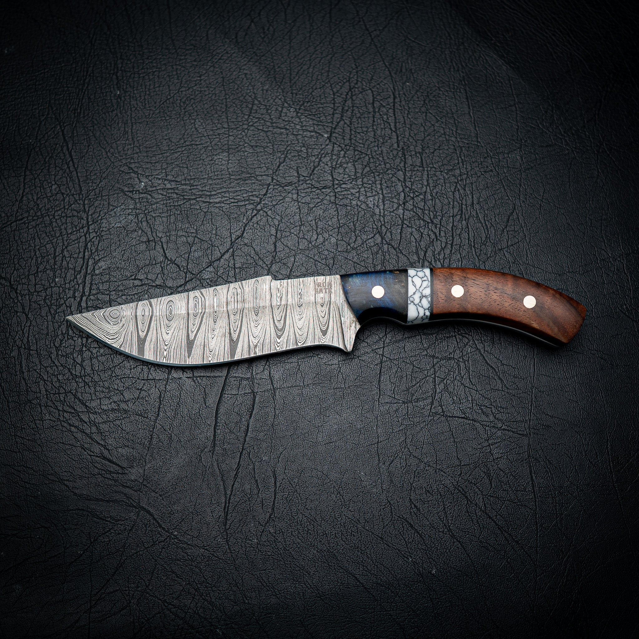 This Hunter profile knife is forged from High Carbon Ladder-Pattern Damascus, giving it incredible cutting performance and a beautifully rippled texture through every layer of steel. The profile is balanced and versatile — ideal for field work, outdoor use, or collection display.