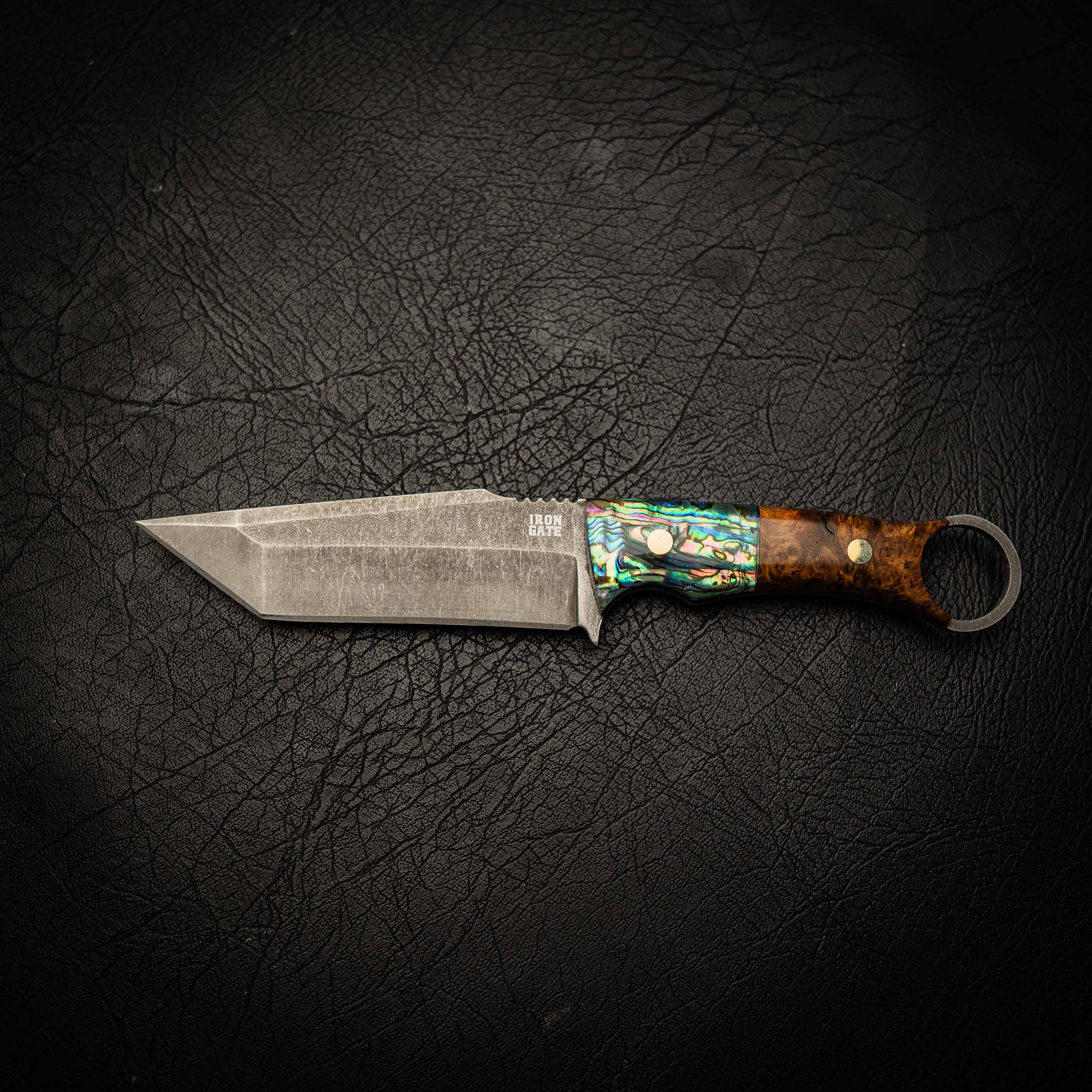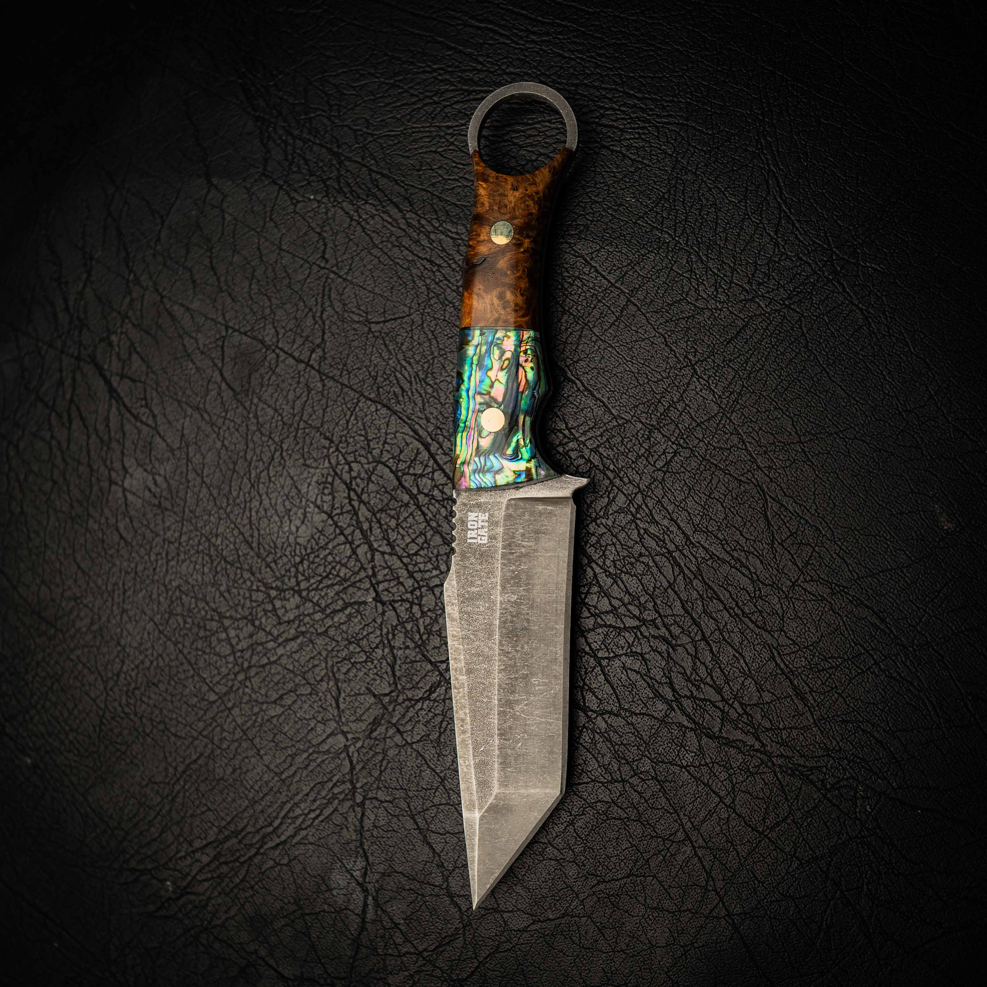 A striking, high-performance Tanto paired with a vibrant paua shell and rich Golden Amboyna Burl handle — tough, sharp and completely unique.