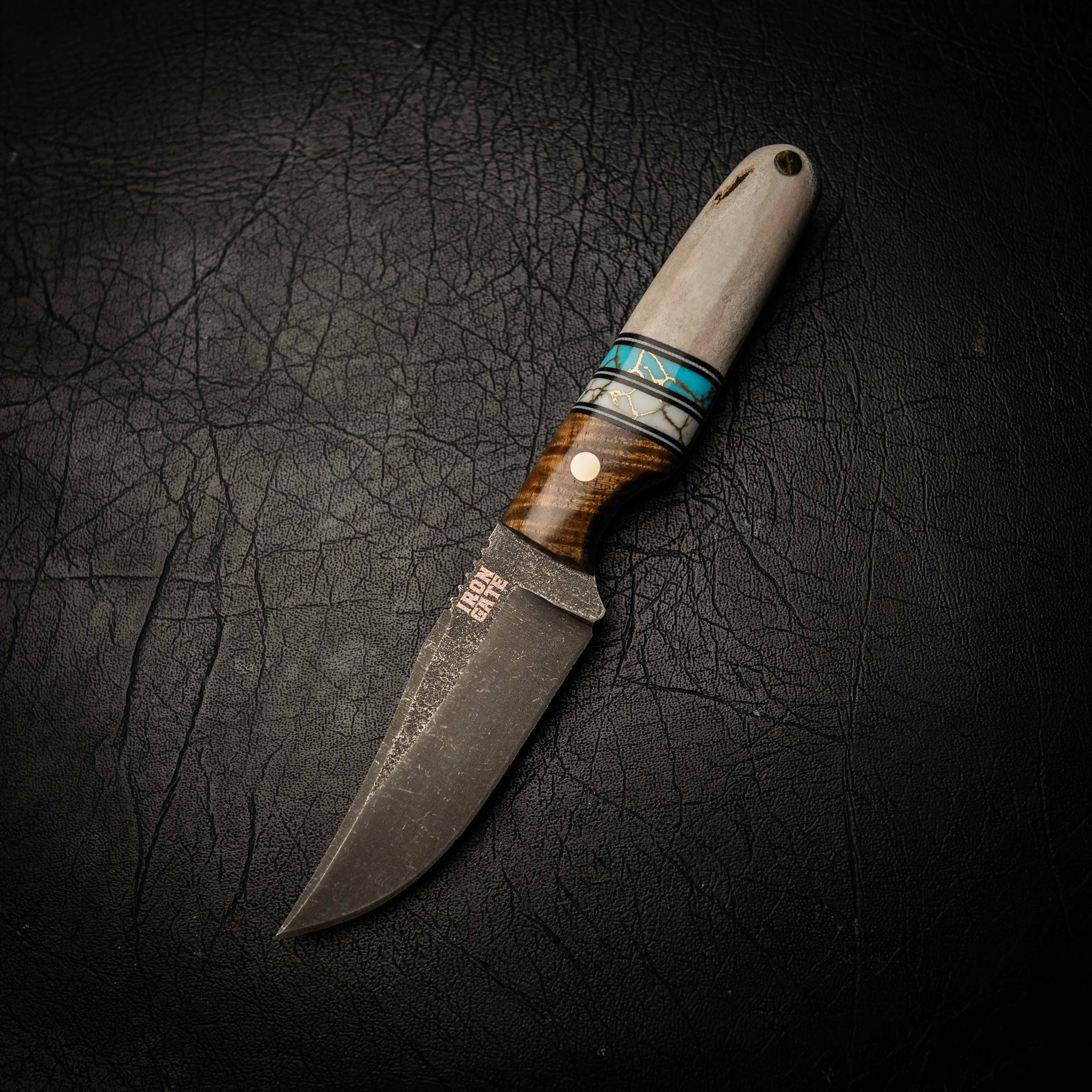 A rugged, lightweight Scout knife with a beautifully figured acacia handle, accented by double Trustone spacers and genuine fallow deer antler.