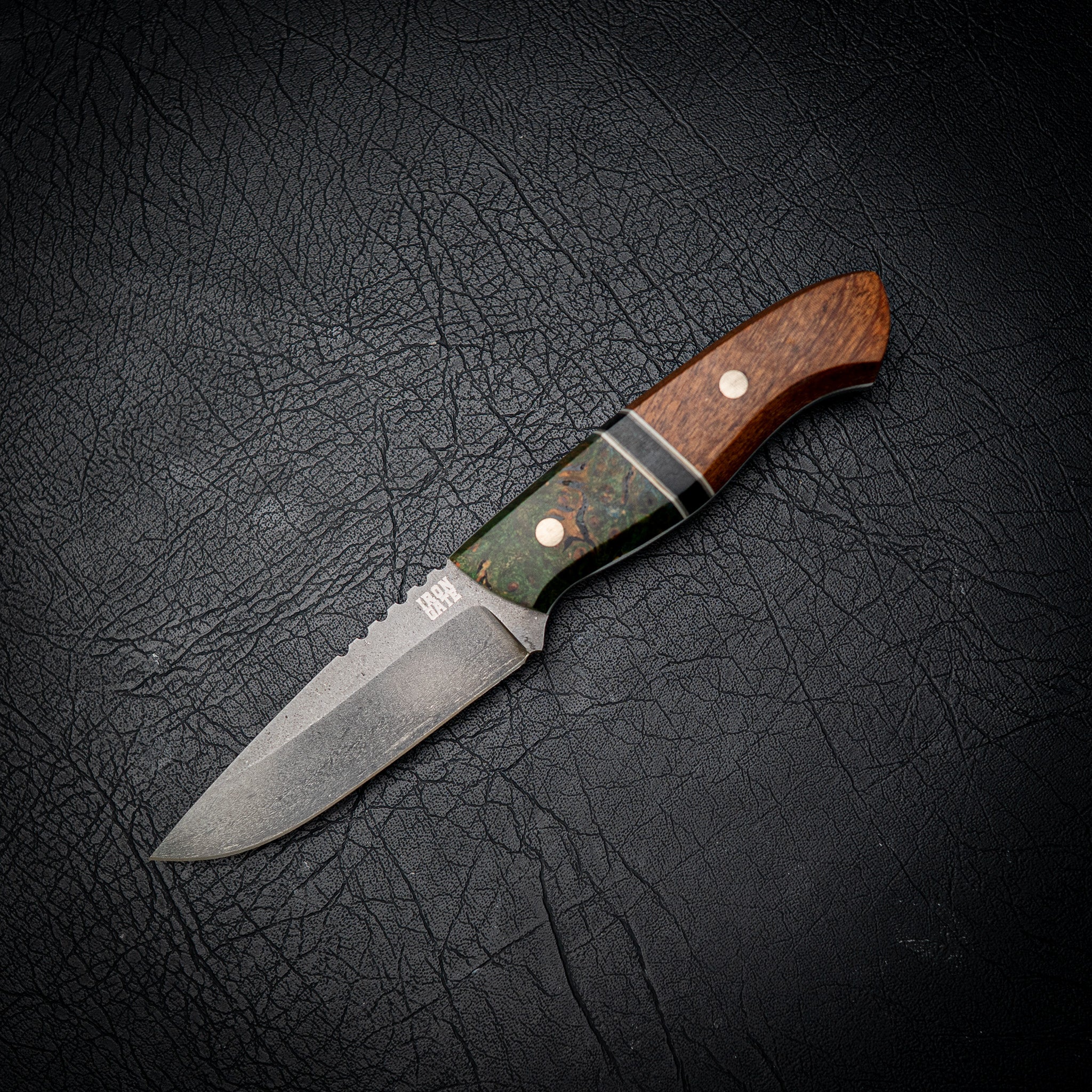 This Bushcraft knife is forged from D2 stainless steel and finished in a dark stonewash, giving it that rugged, battle-worn look that hides wear and stands up to serious work in the field.