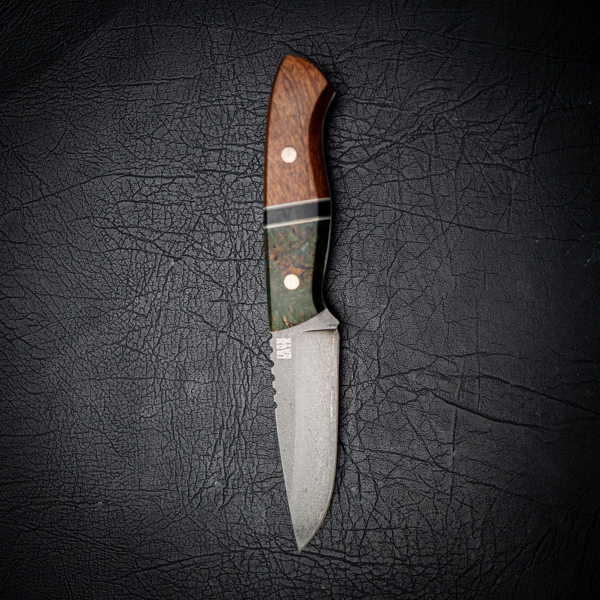 The handle is a handcrafted blend of Dyed Amboyna Burl, Dyed Lacewood spacer, and Wenge wood — rich contrasts, deep colour, and texture that feels incredible in hand. Every knife is shaped, finished, and sharpened by hand in Anna Bay, NSW, making each one truly one-of-a-kind.