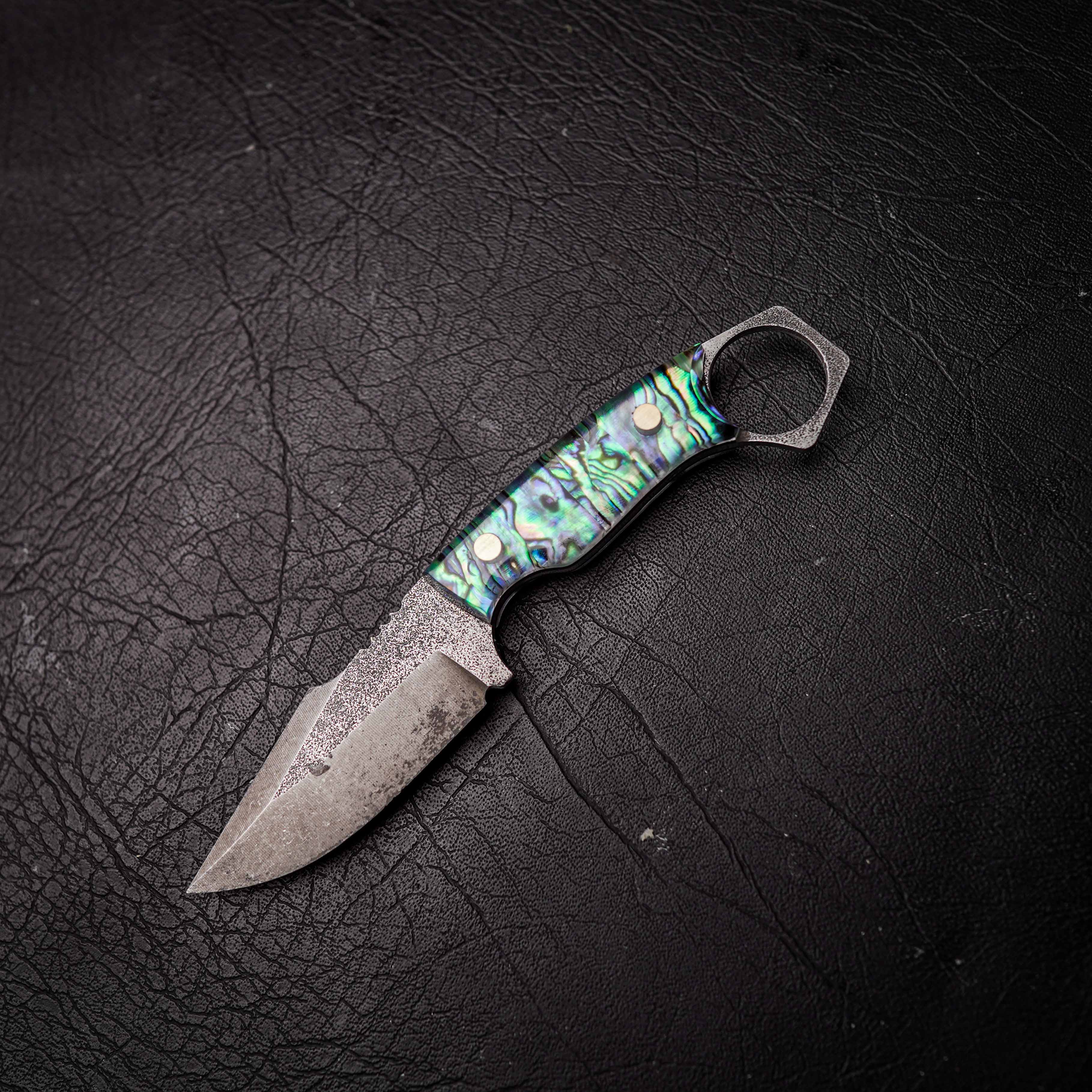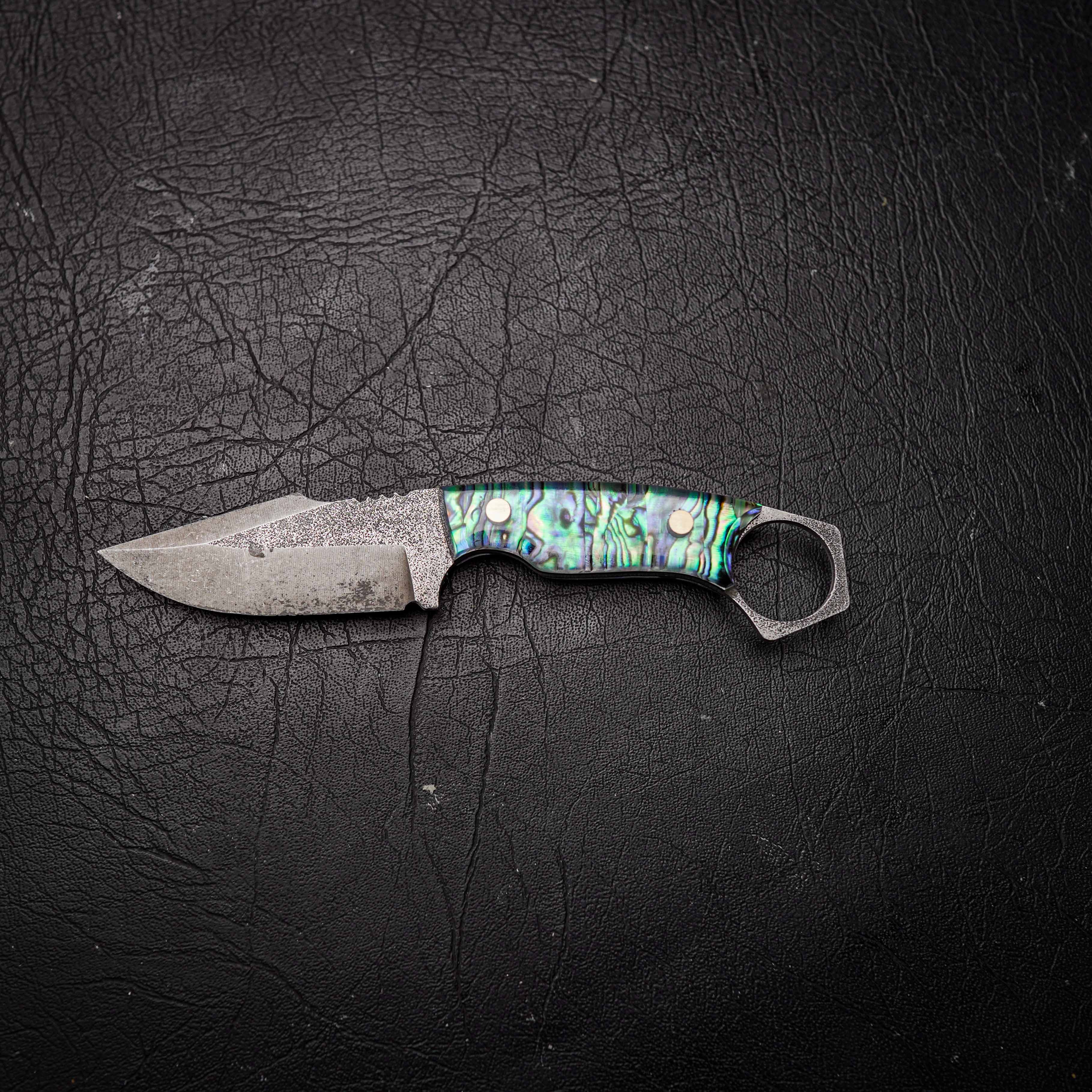 Fitted with a full Abalone handle, this piece stands out as both functional and visually striking. The shell’s natural iridescence gives each knife a unique pattern and depth, with colours shifting beautifully in the light. Stabilised and hand-shaped for durability and comfort in the hand.