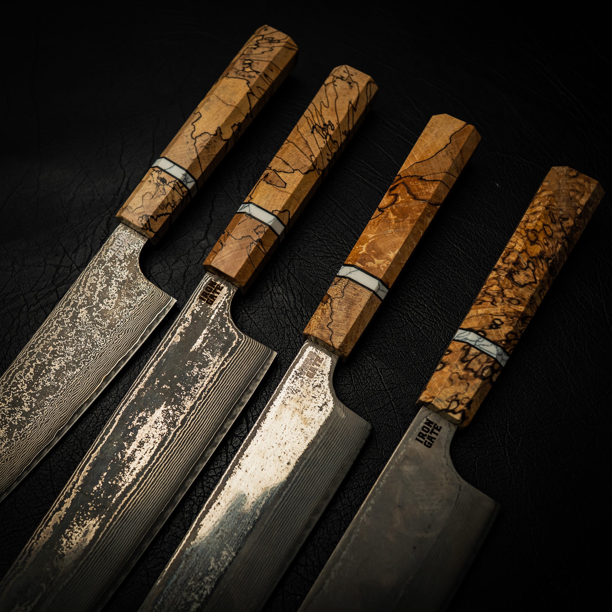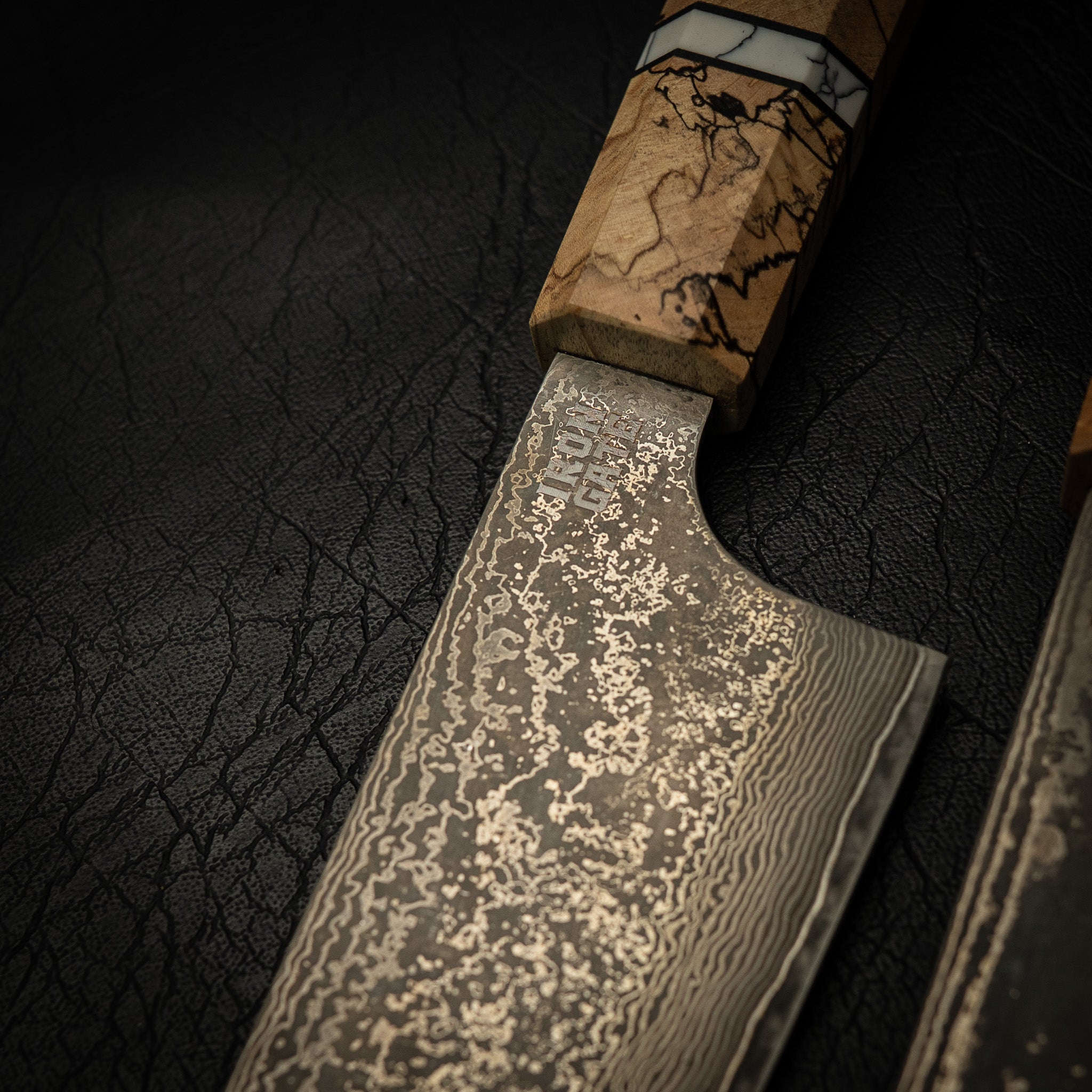 Each knife is forged from 67 layers of straight Damascus steel folded around an AUS-8 high-carbon stainless core.