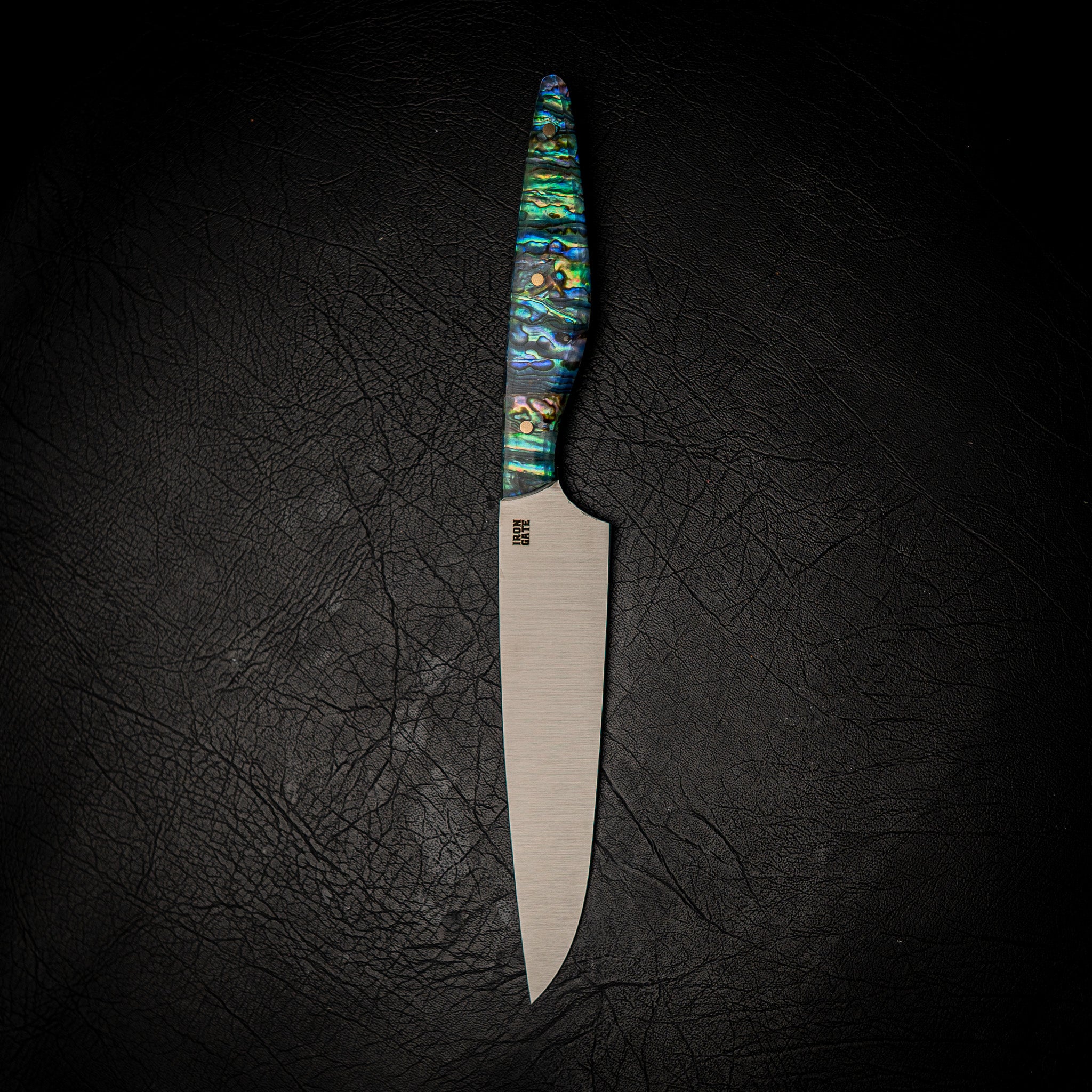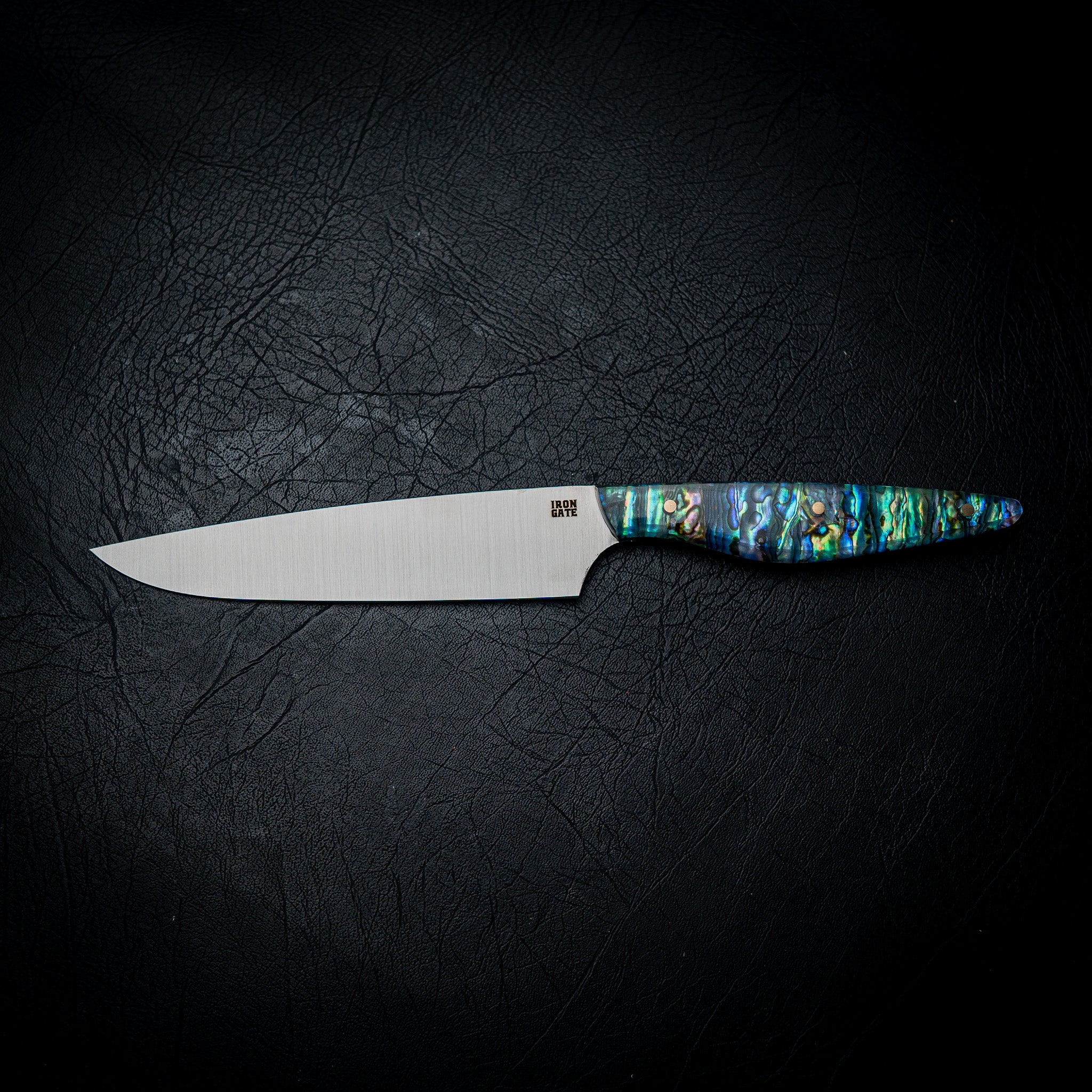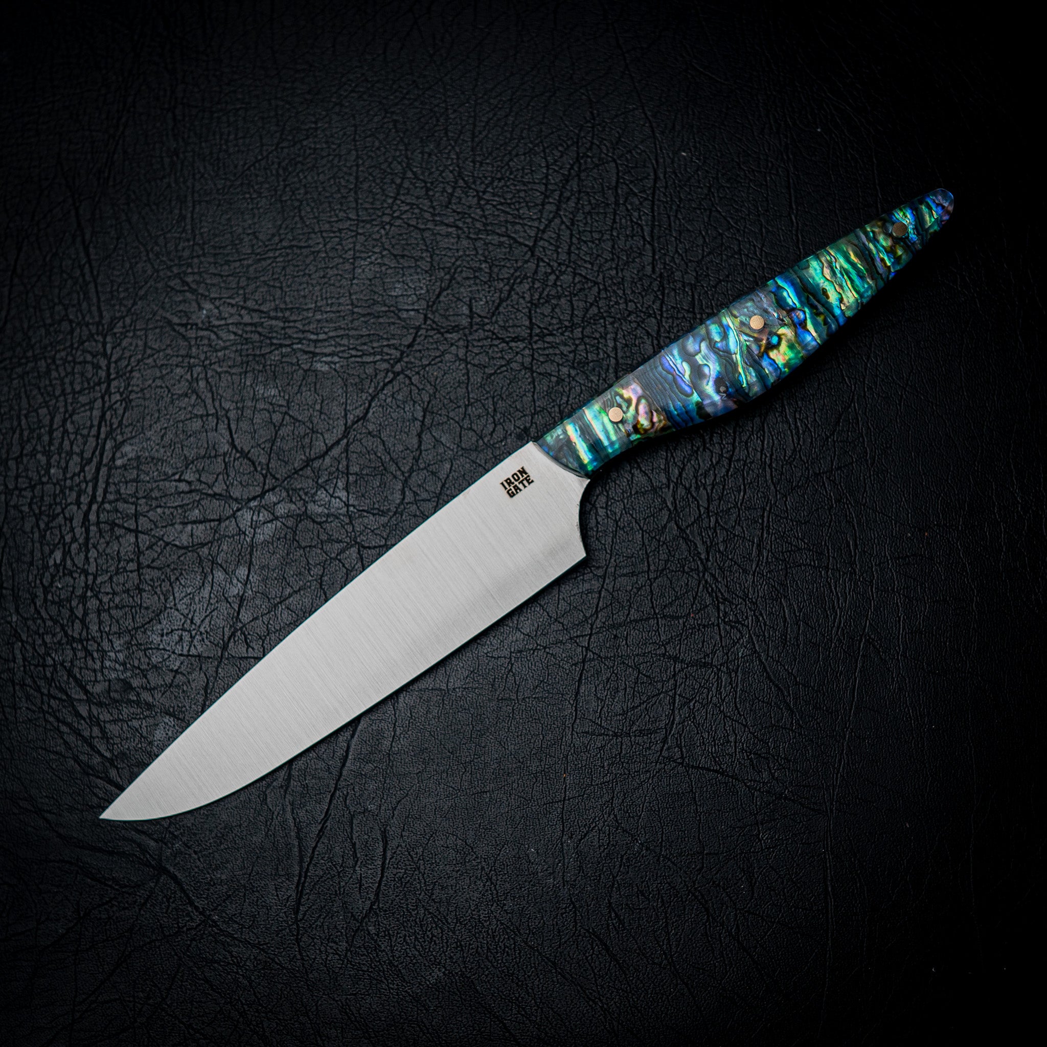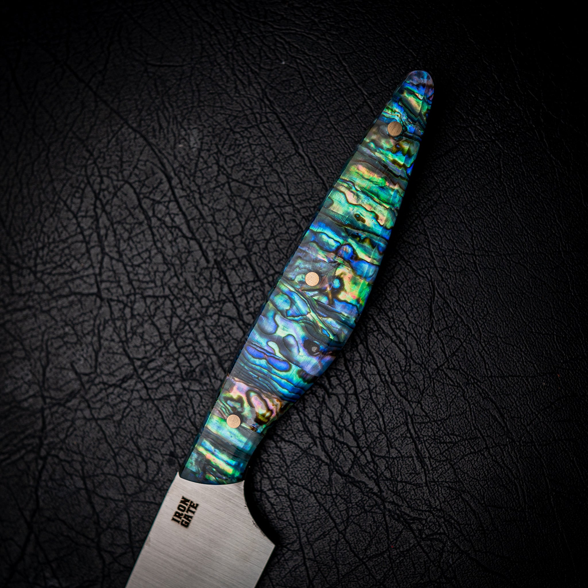 This build features a stainless steel blade for durability and low maintenance, paired with a full Abalone shell handle that shimmers with natural iridescence. Every handle is unique, making each knife a true one-of-a-kind showpiece.