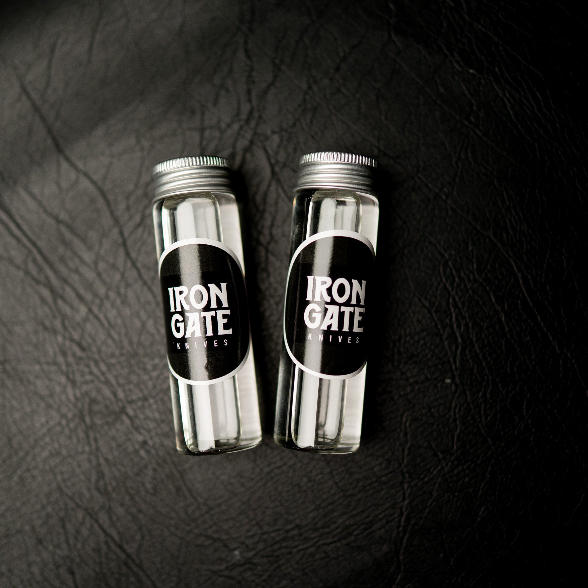 Our Iron Gate Mineral Oil is 100 % pure, food-grade oil packaged in a reusable 80 ml amber glass jar. It’s designed to hydrate and preserve wood, antler, and bone handles while preventing cracking, dullness, and moisture damage.