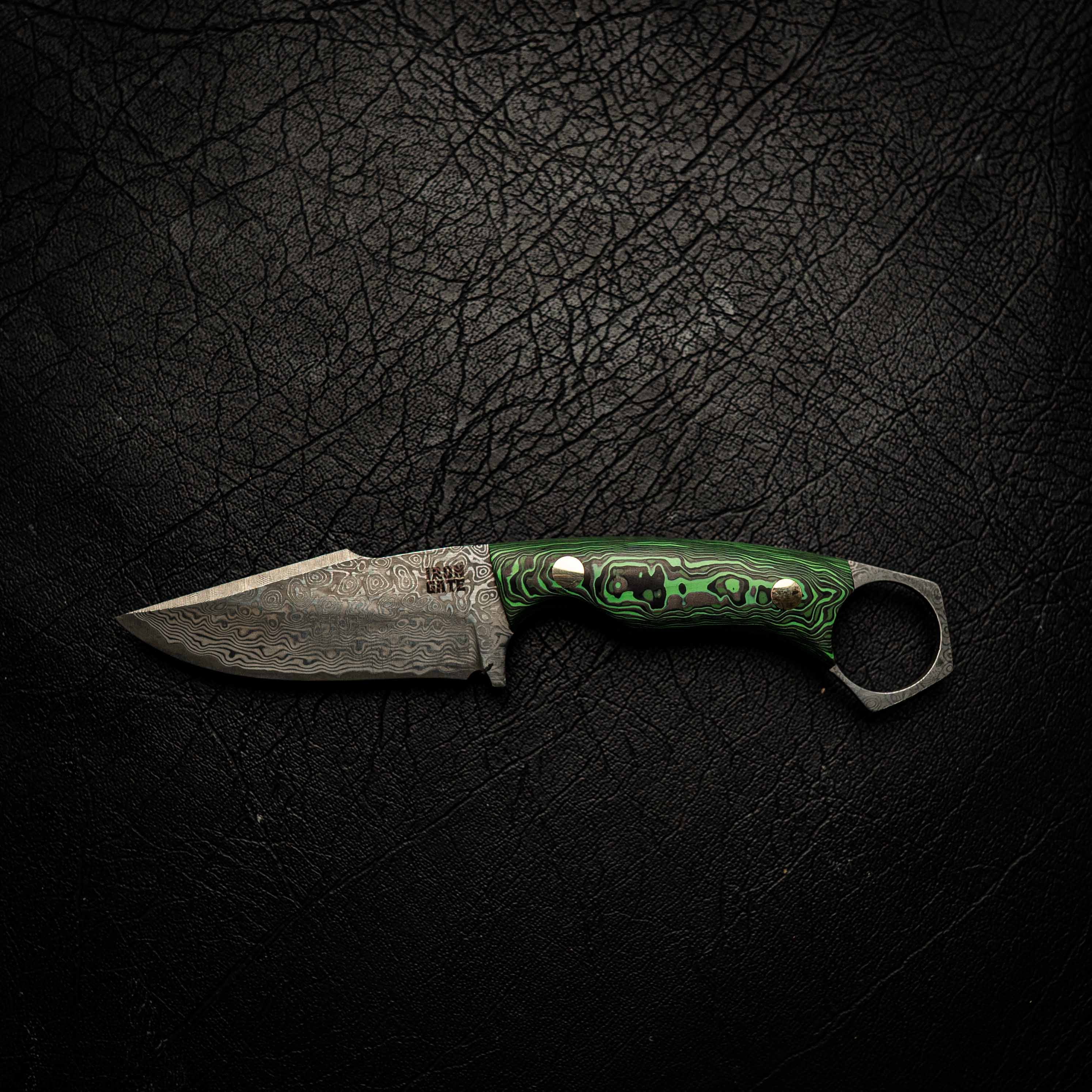 This Damascus Mini Hunter is a bold, modern build with a handle that absolutely pops.