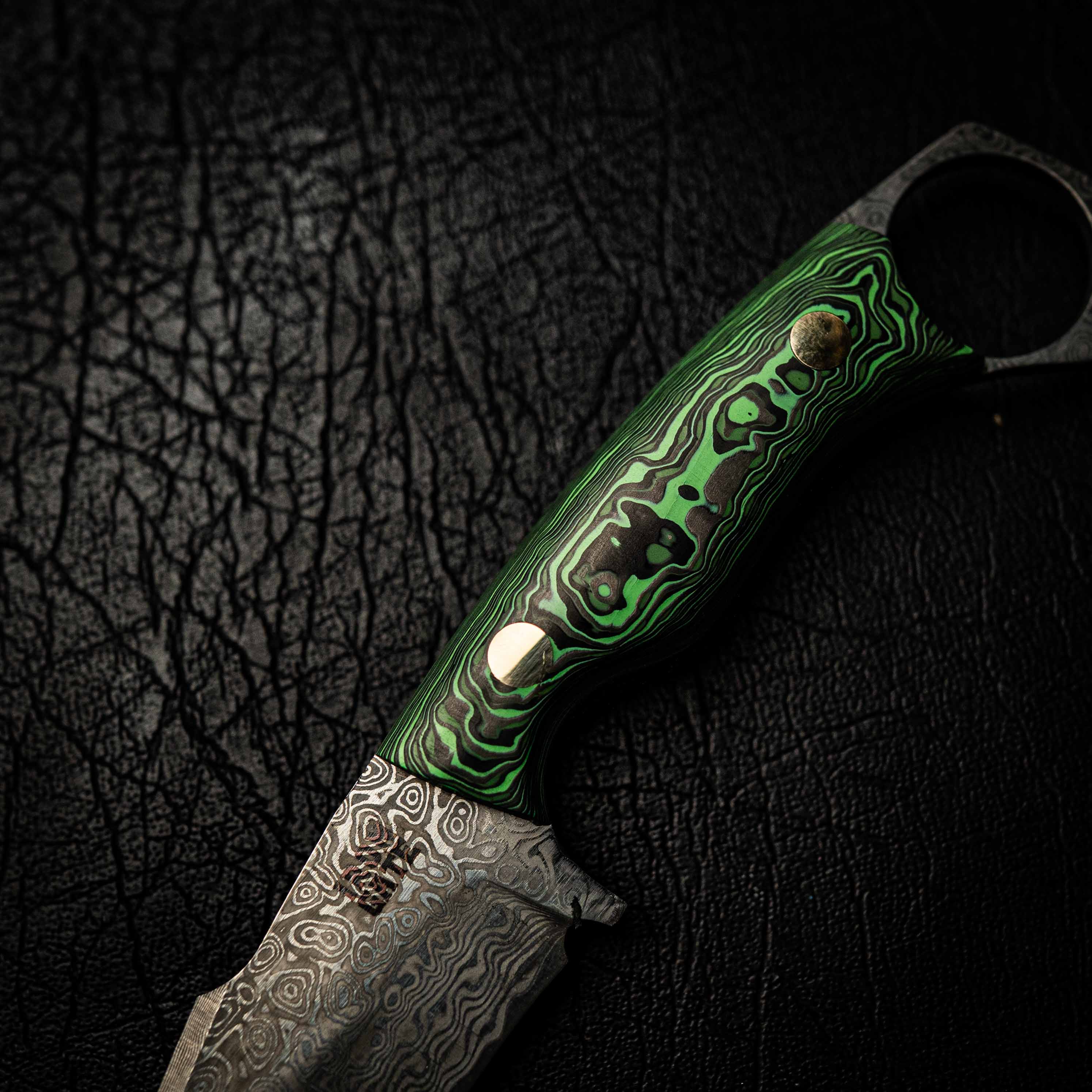 The handle features green carbon fiber, creating layered texture, metallic depth and a forged-steel aesthetic with a bright high-performance look. Lightweight, incredibly strong and visually striking, it brings serious attitude in a compact package.