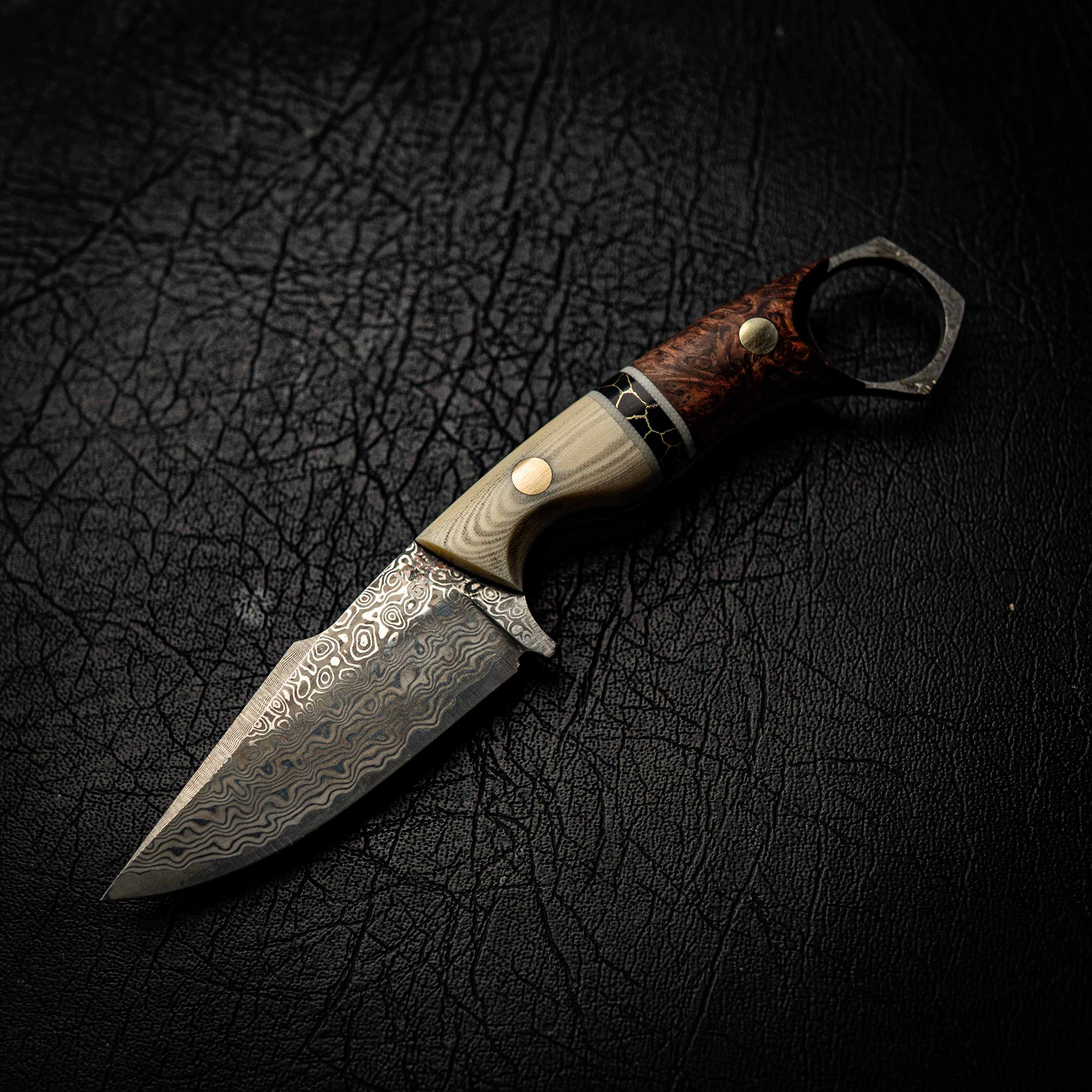 This Damascus Mini Hunter is a stunning blend of classic materials and premium craftsmanship.