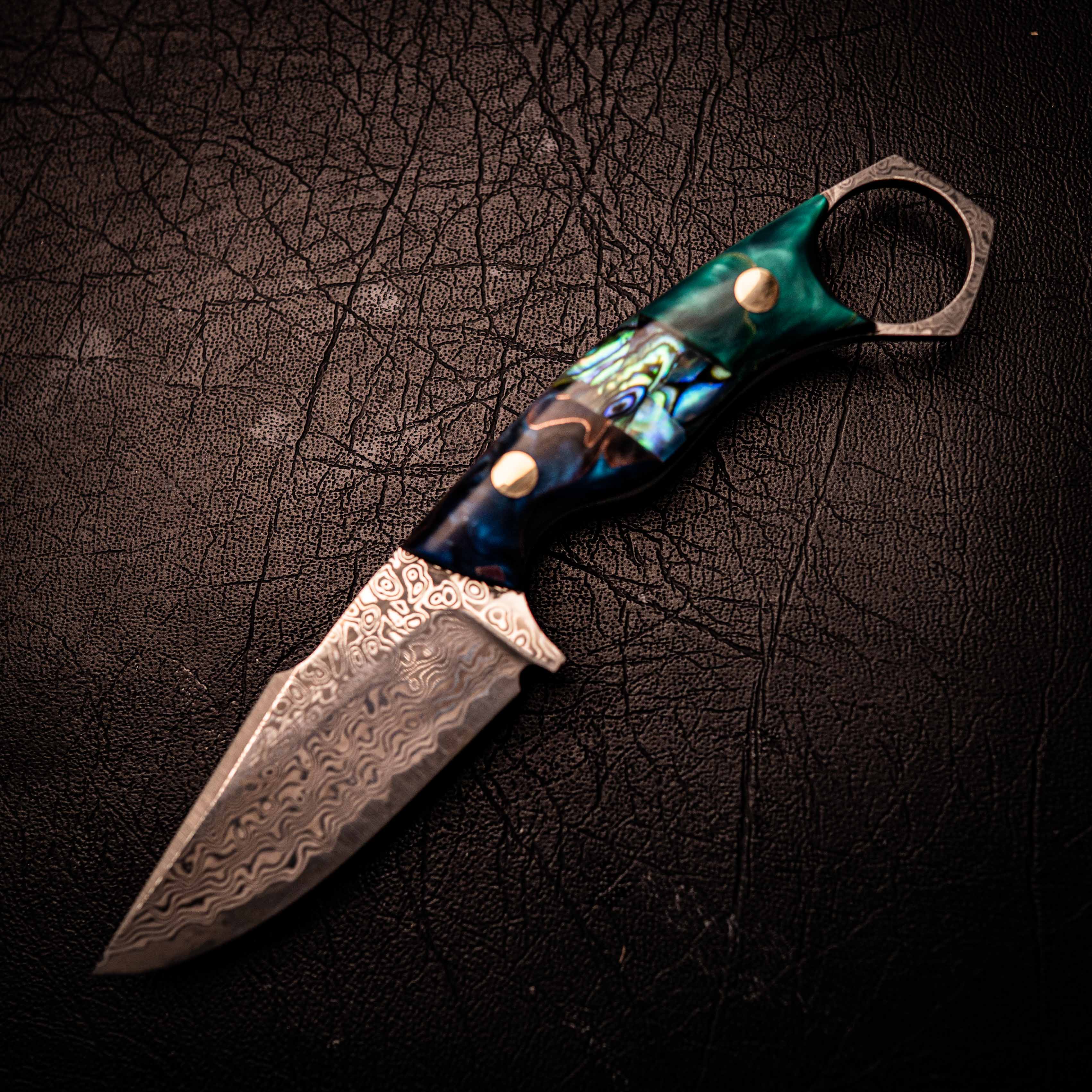 Damascus Mini Hunter – Epoxy Hybrid with Abalone Shell Inlay