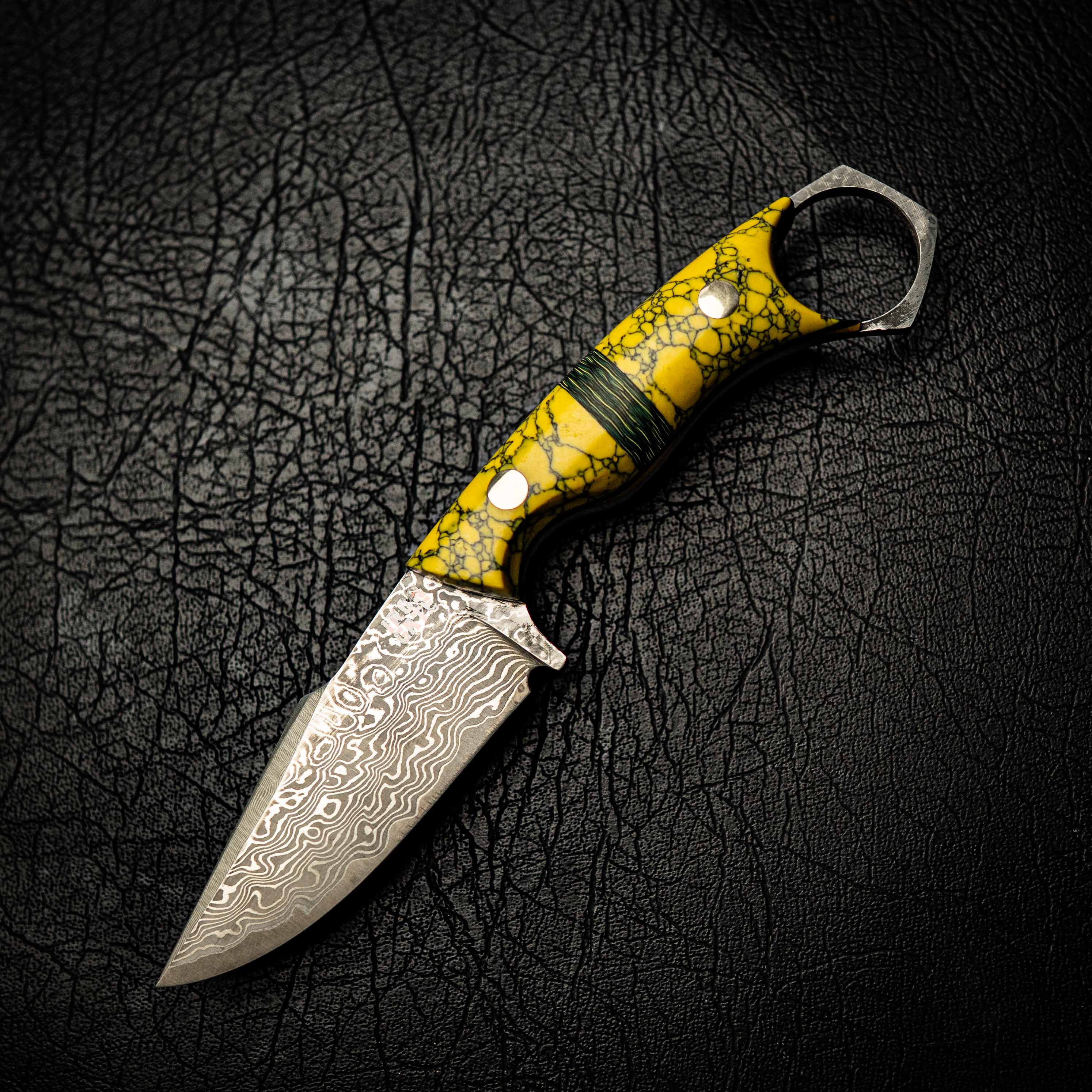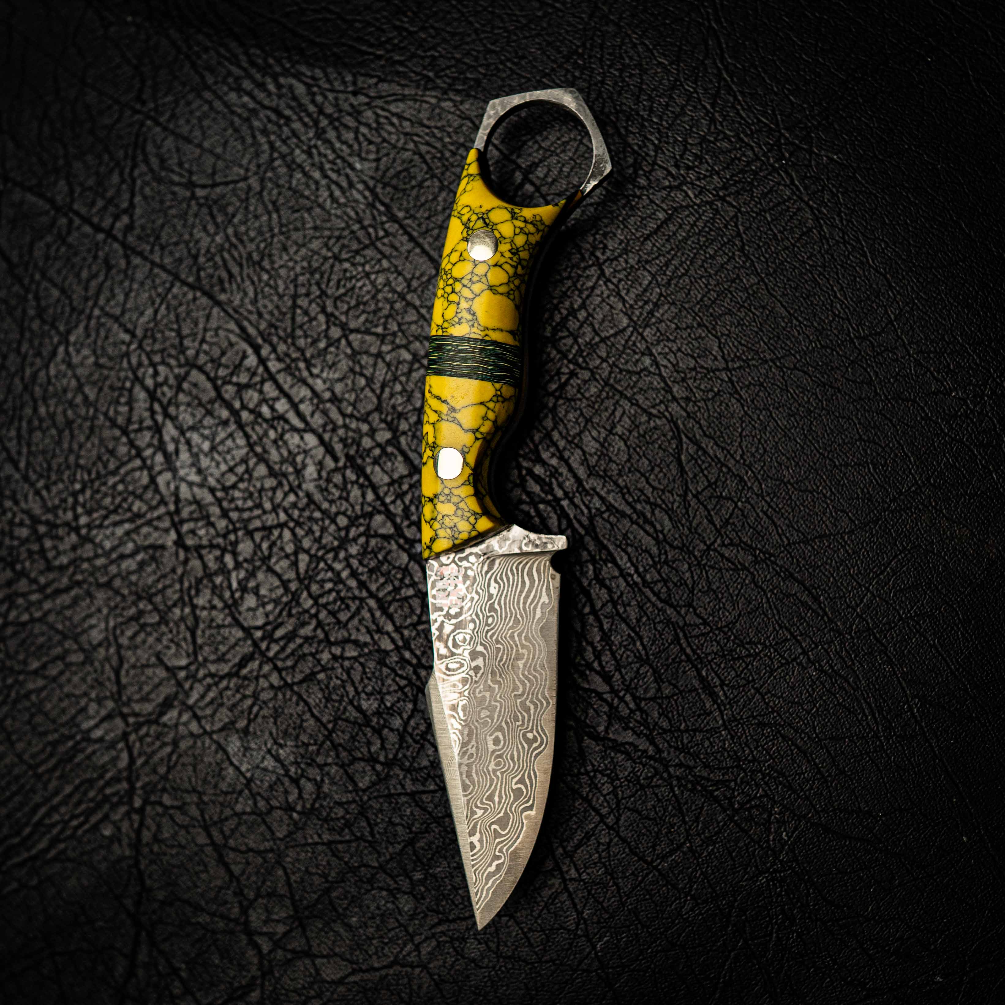 Damascus Mini Hunter – Yellow Restone & Carbon Fiber Inlay