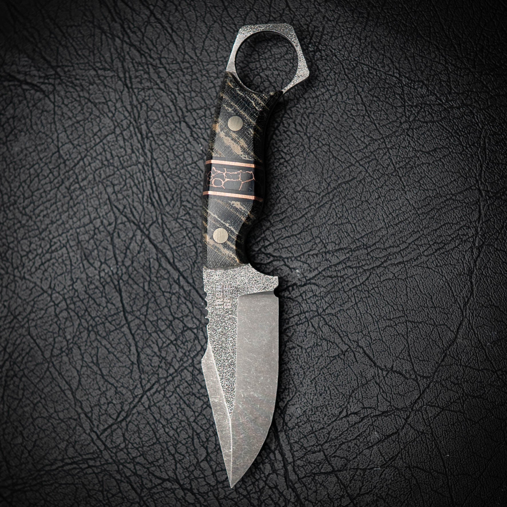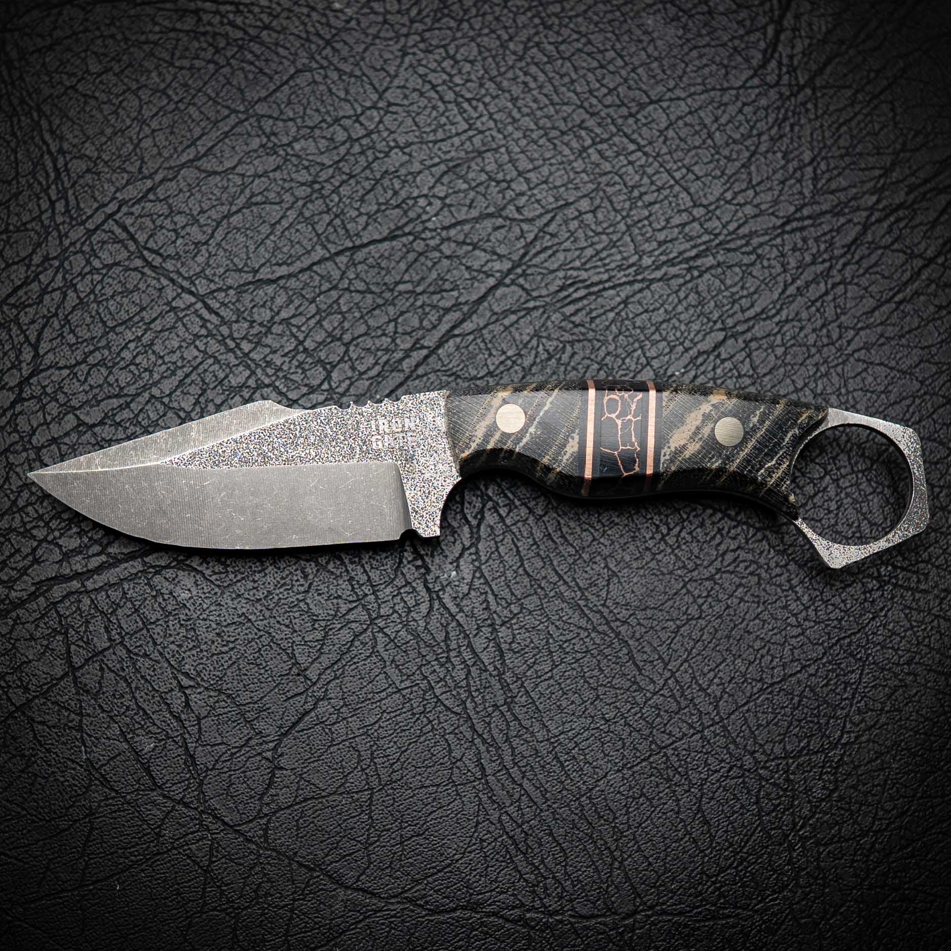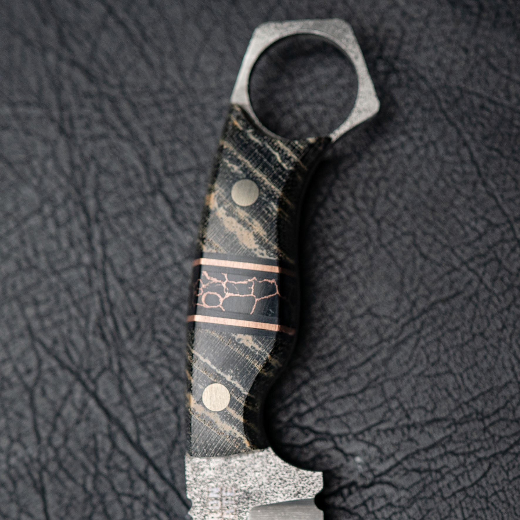 Handmade in Anna Bay, it features a stonewashed N690 stainless blade matched with a black-dyed, stabilised Pagoda handle and a Copper Trustone spacer for a subtle touch of warmth and contrast. Every detail shaped by hand, every line built with intention.