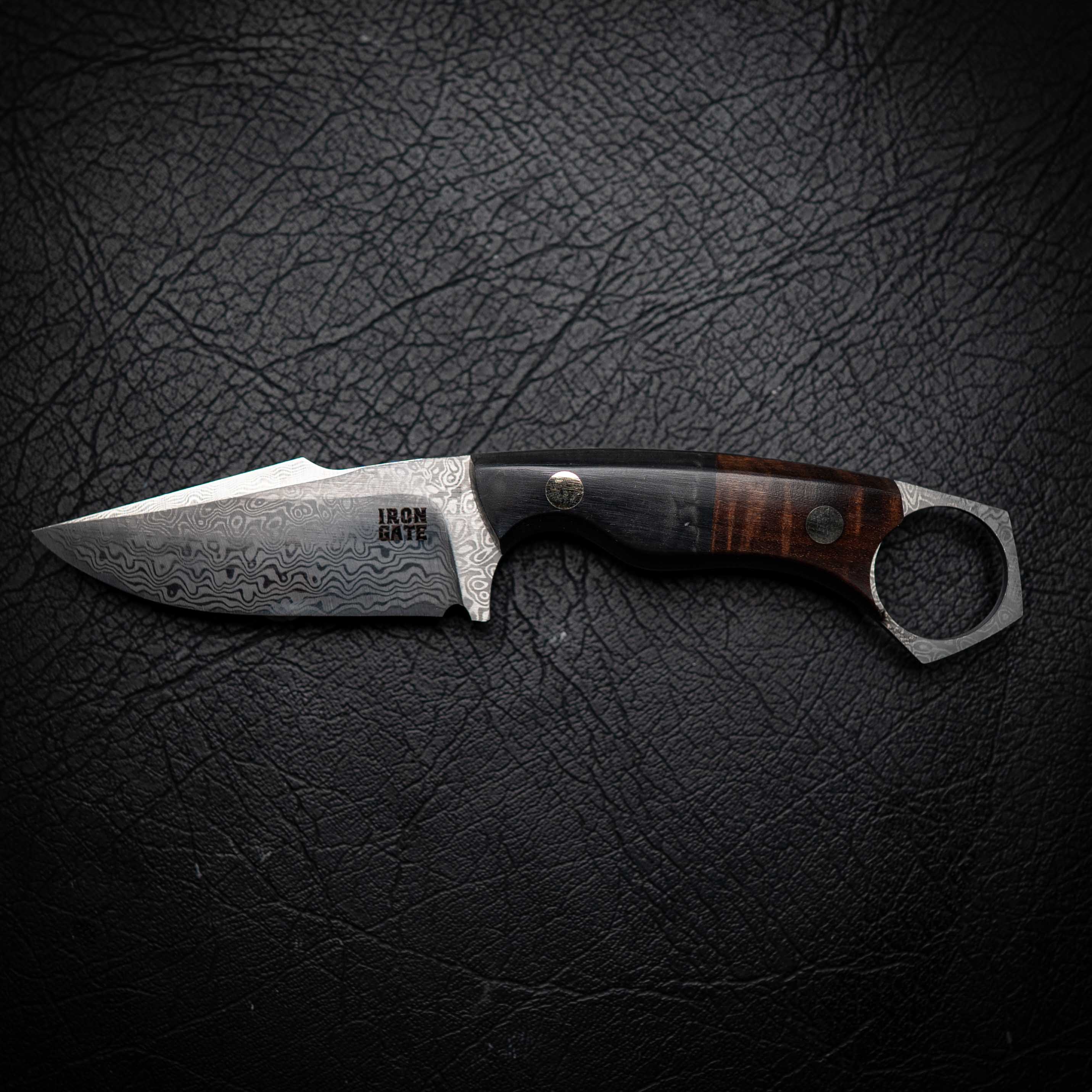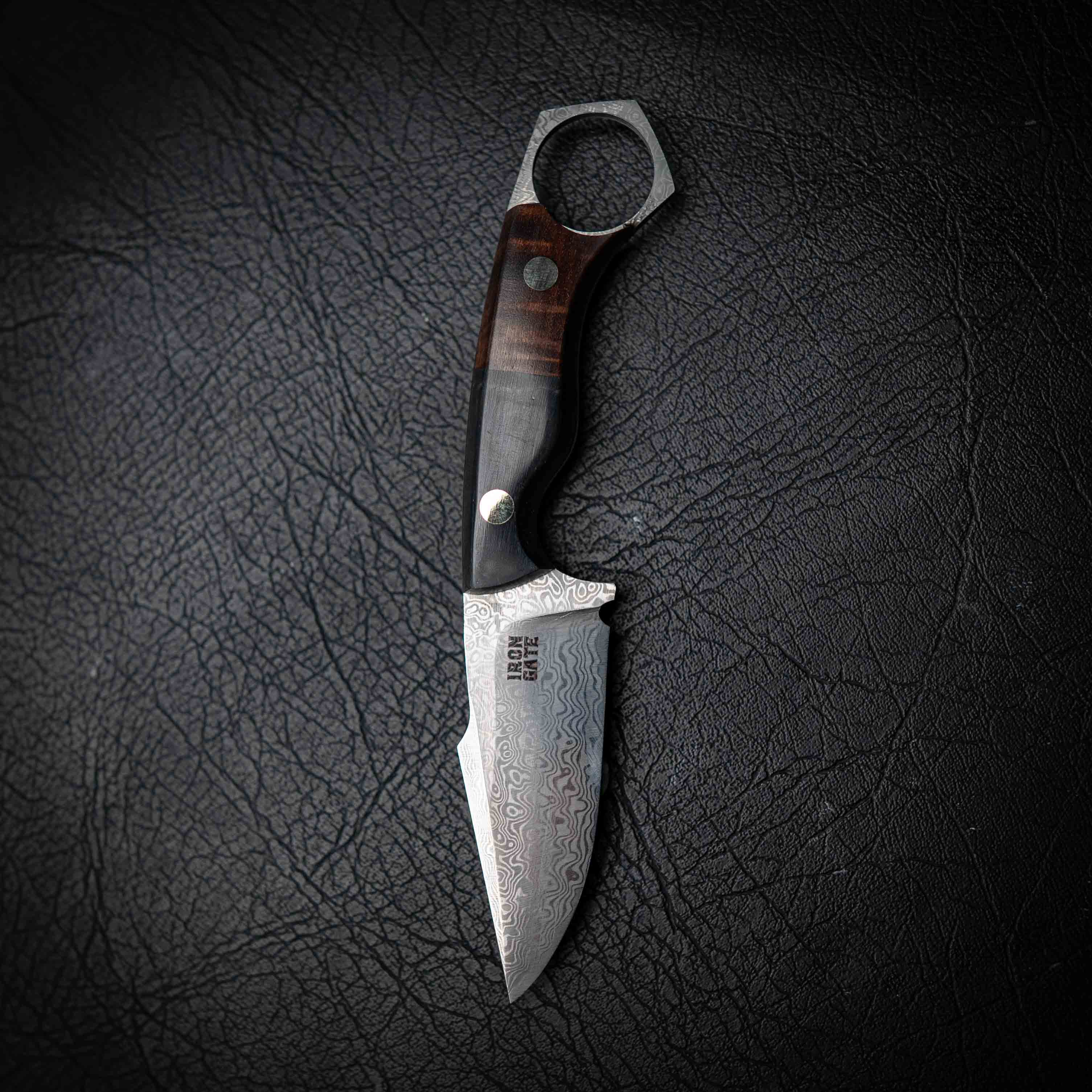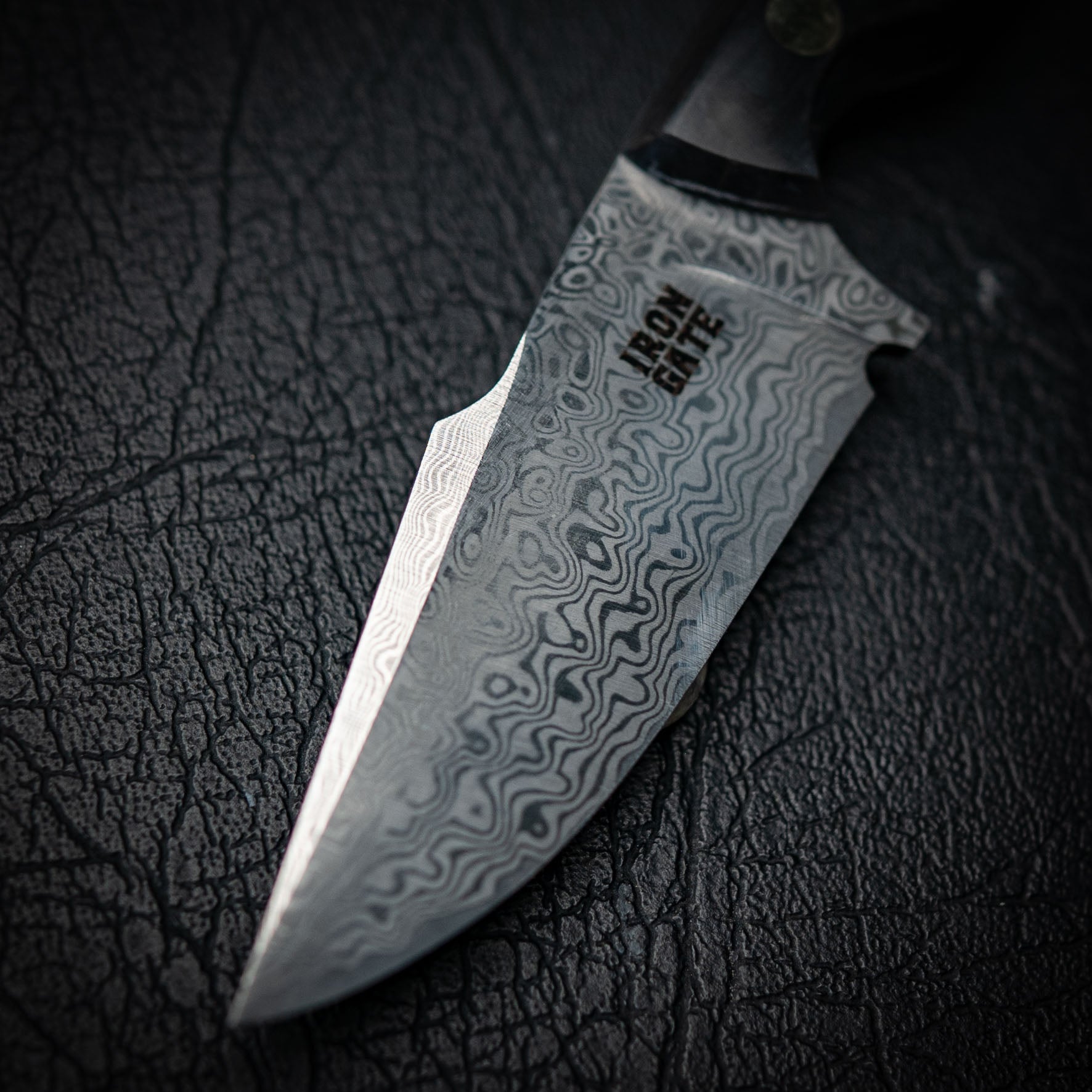 This Mini Hunter features a stainless Damascus San Mai blade with a unique, random-layered pattern, paired with a Ringed Gidgee and black-dyed, stabilised Birch wood handle. The contrast between rich timber grain and the depth of Damascus steel makes each knife one of a kind.