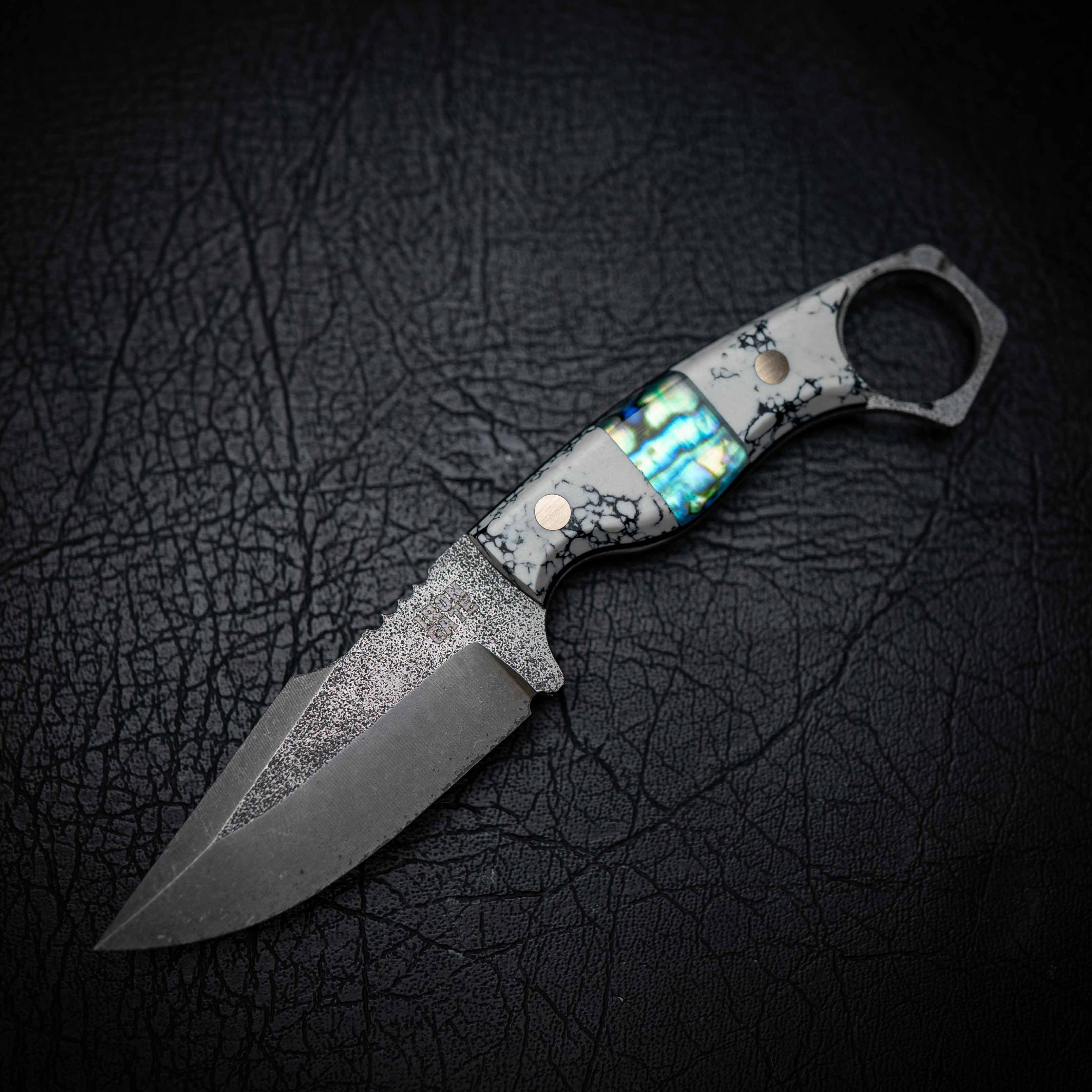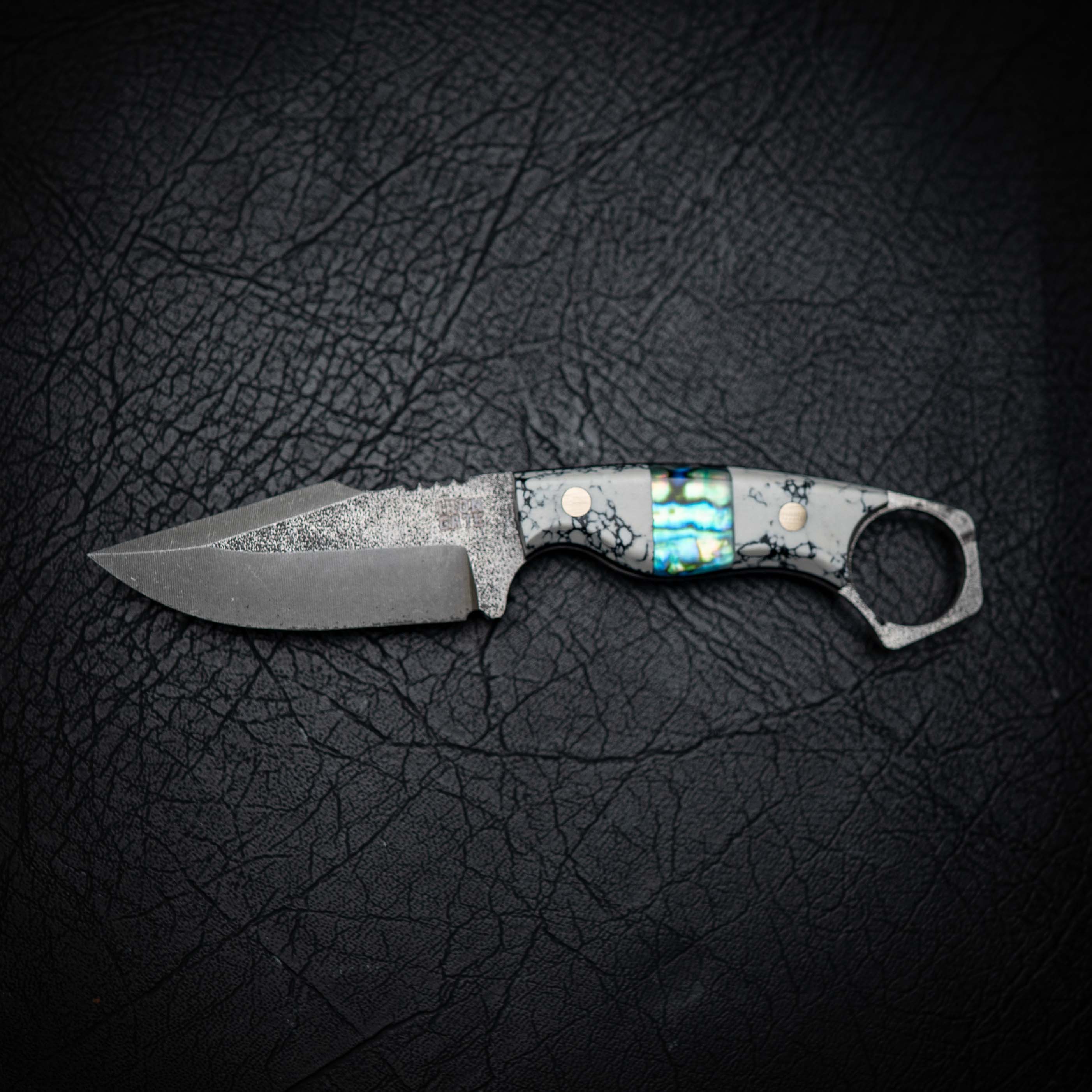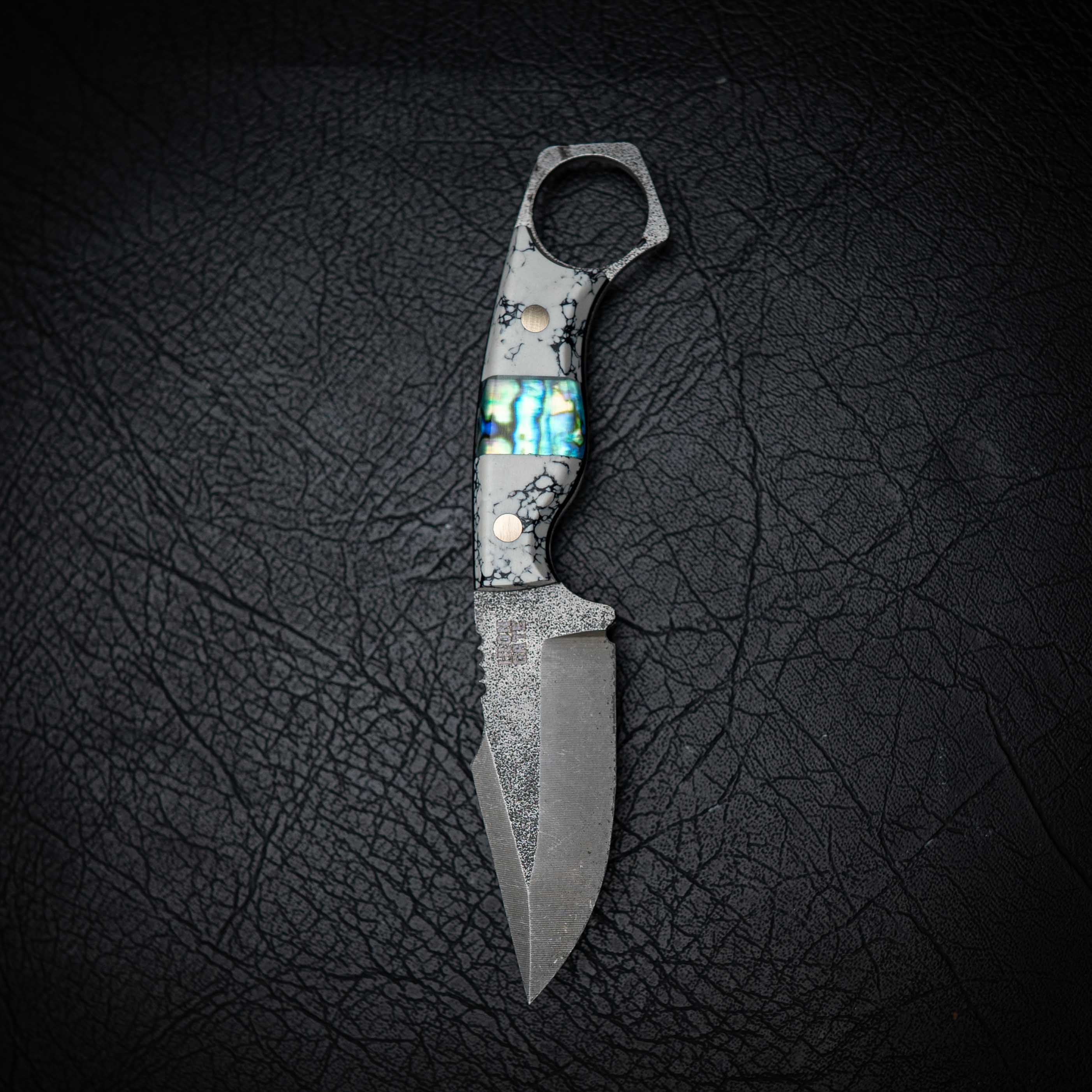 This Mini Hunter features a White ResStone handle with a natural abalone shell inlay, bringing together clean lines and ocean-born detail. Every handle is shaped and finished by hand, giving each knife its own distinct character.