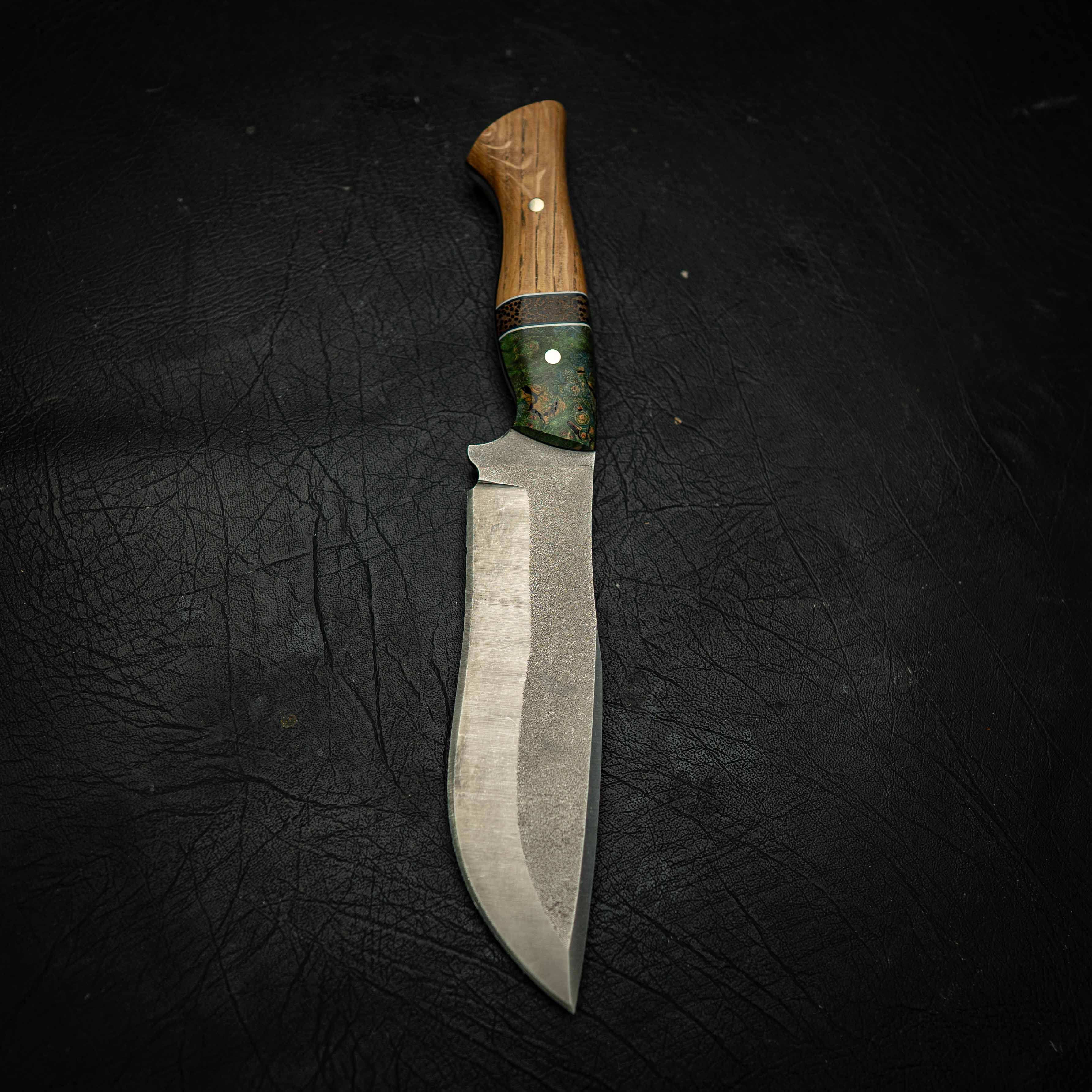 The vivid figure of dyed Amboyna burl paired with textured black palm and rich sandalwood creates a handle that is both visually striking and extremely durable for hard outdoor use.