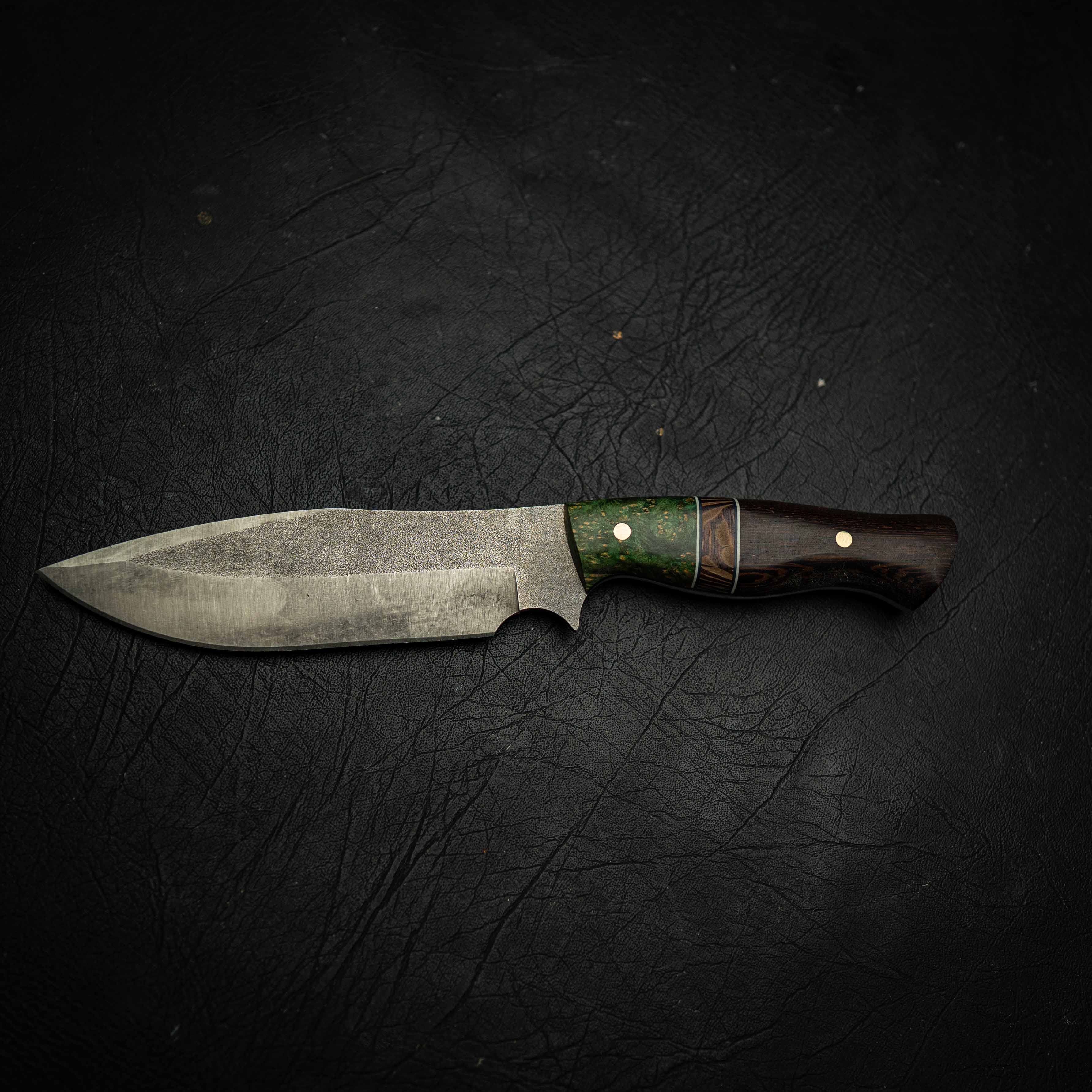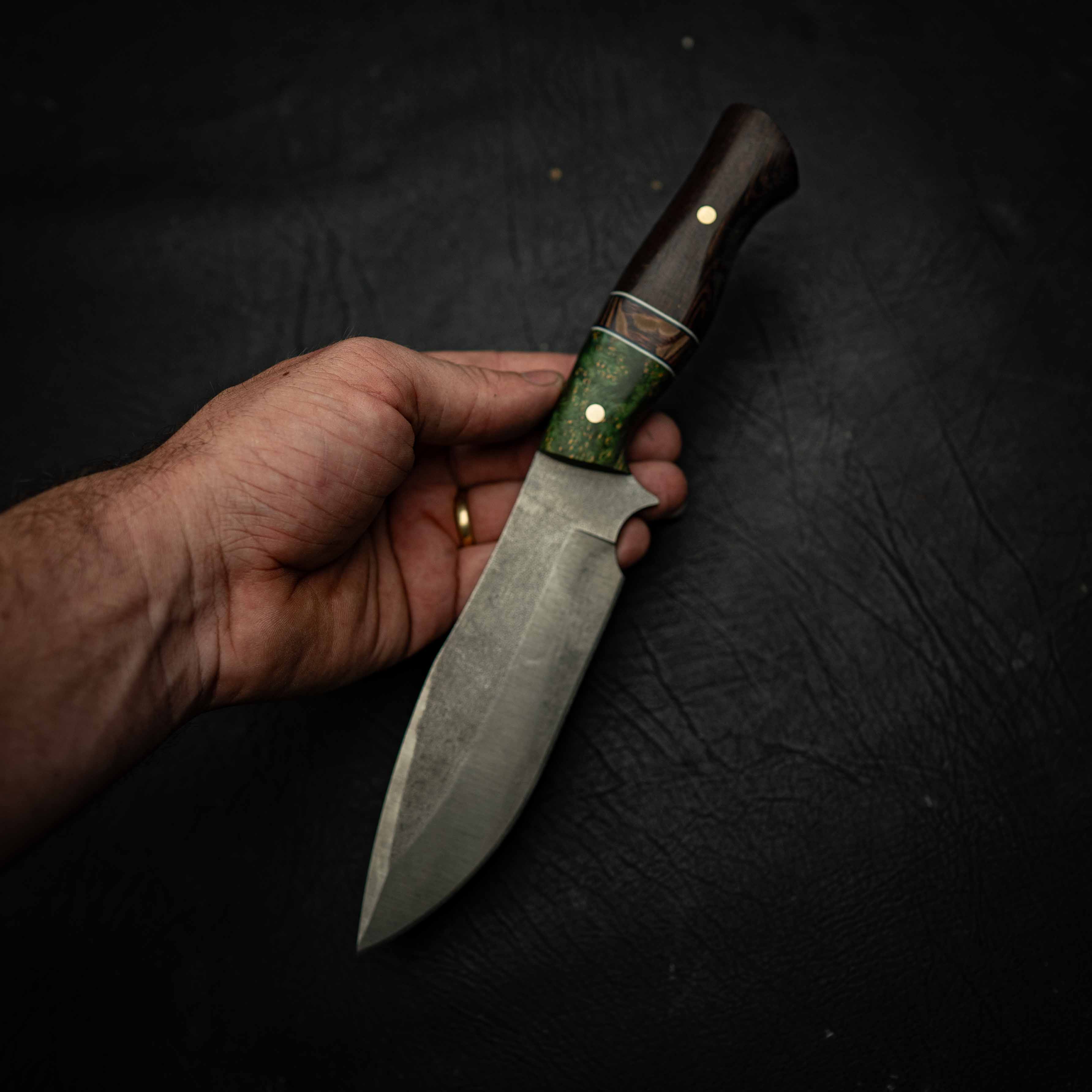 The rich figure of dyed Amboyna burl combined with textured Banksia and dark Wenge creates a handle that is both visually striking and extremely durable for hard outdoor use.