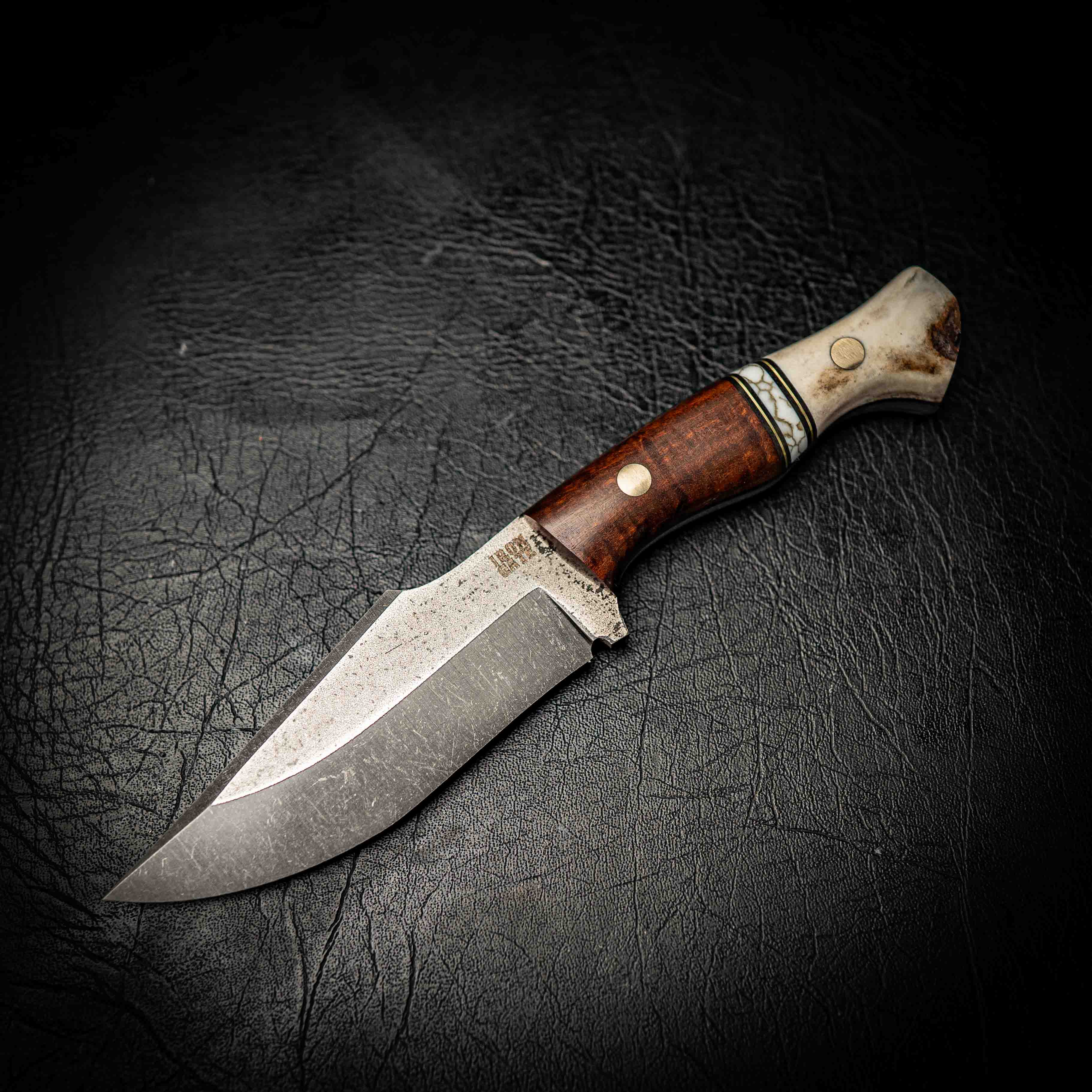 The stonewashed and acid-etched blade gives a rugged, low-glare finish that highlights every handcrafted grind line. The handle is a striking mix of Ringed Gidgee, a White TruStone spacer, and Fallow Deer antler, all hand-shaped and polished to perfection. Each knife is one of a kind, balancing natural beauty with everyday strength.