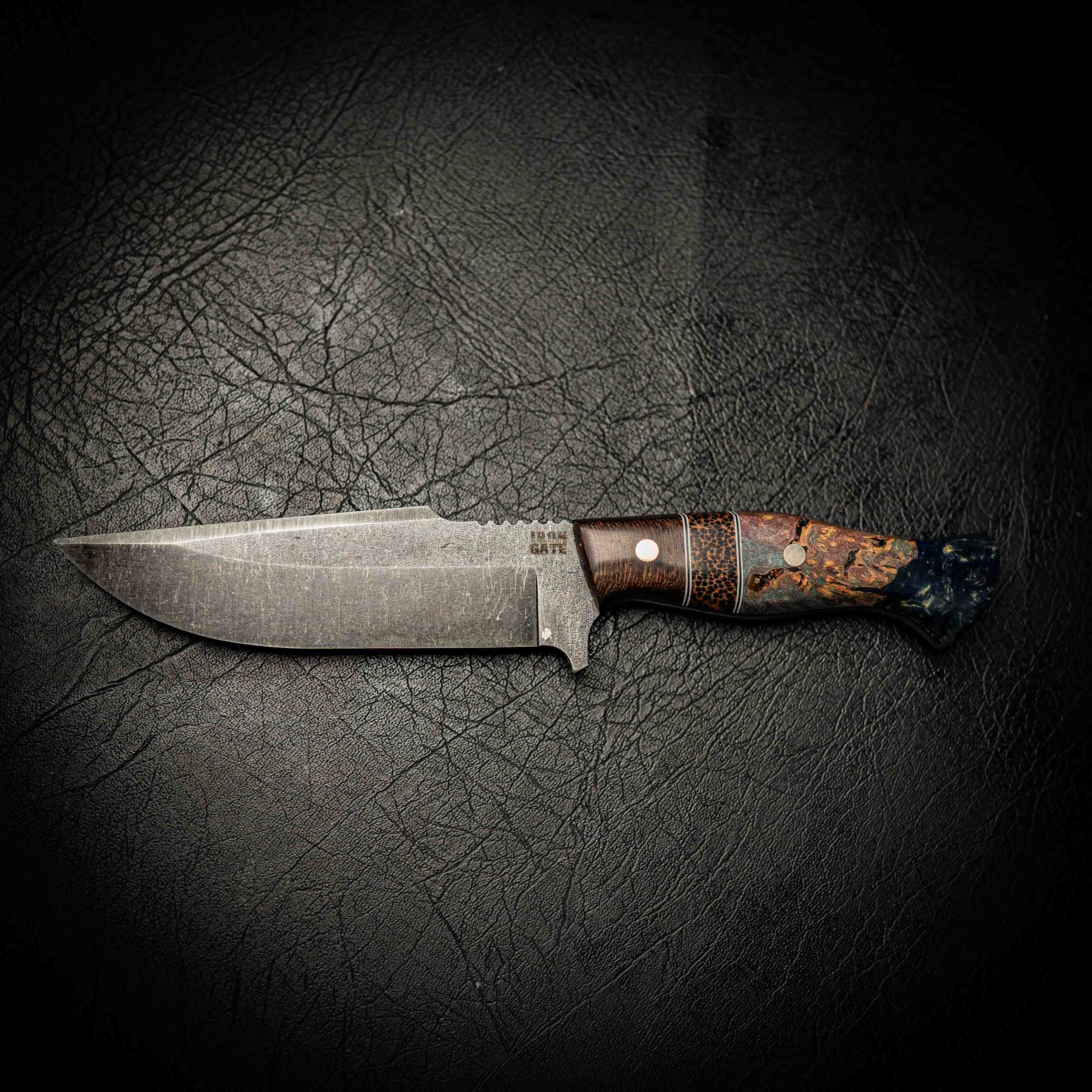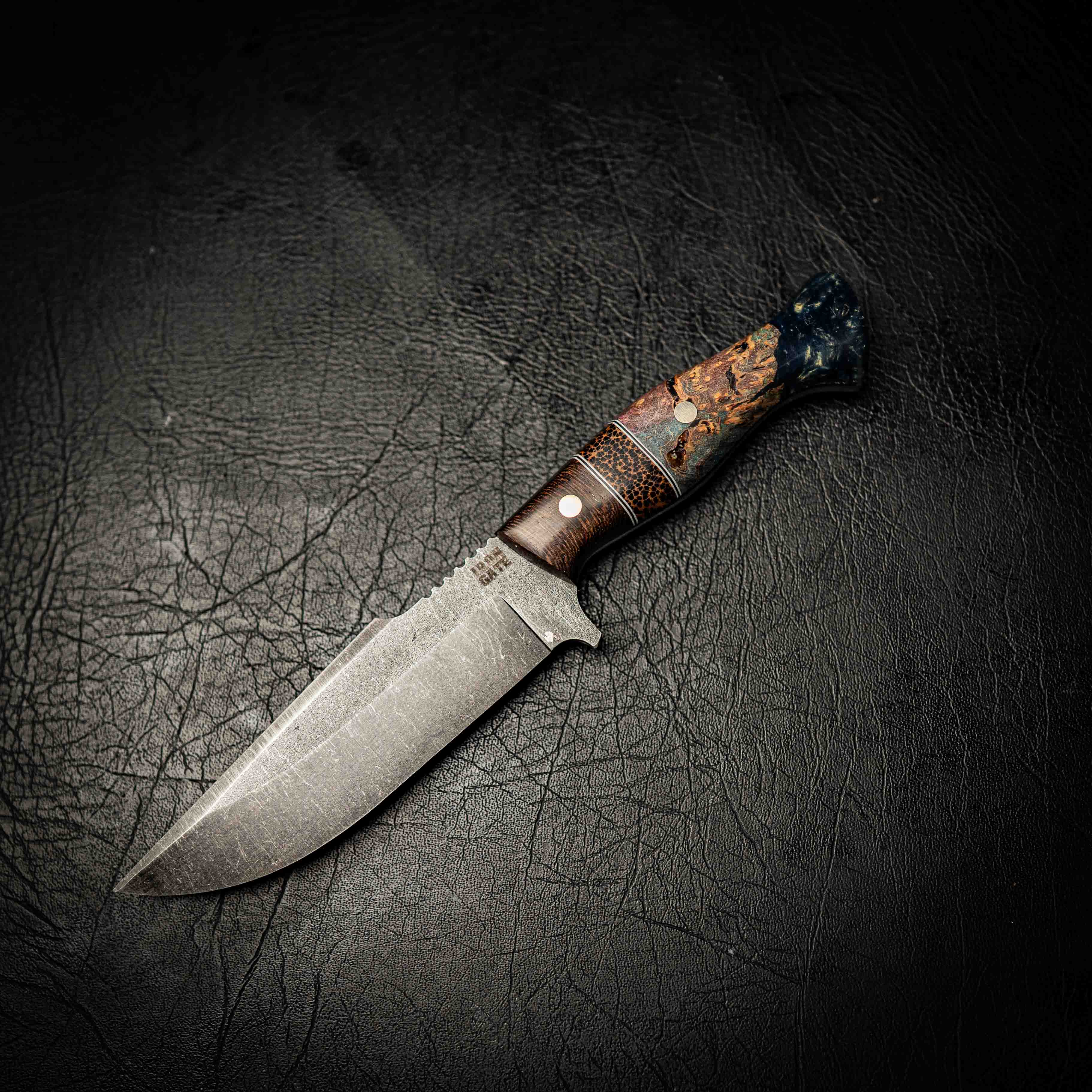 The segmented handle blends a stabilised hardwood section with a coloured epoxy hybrid, creating a striking contrast of natural grain and depth. Each handle is shaped and polished by hand, making every piece one of a kind.