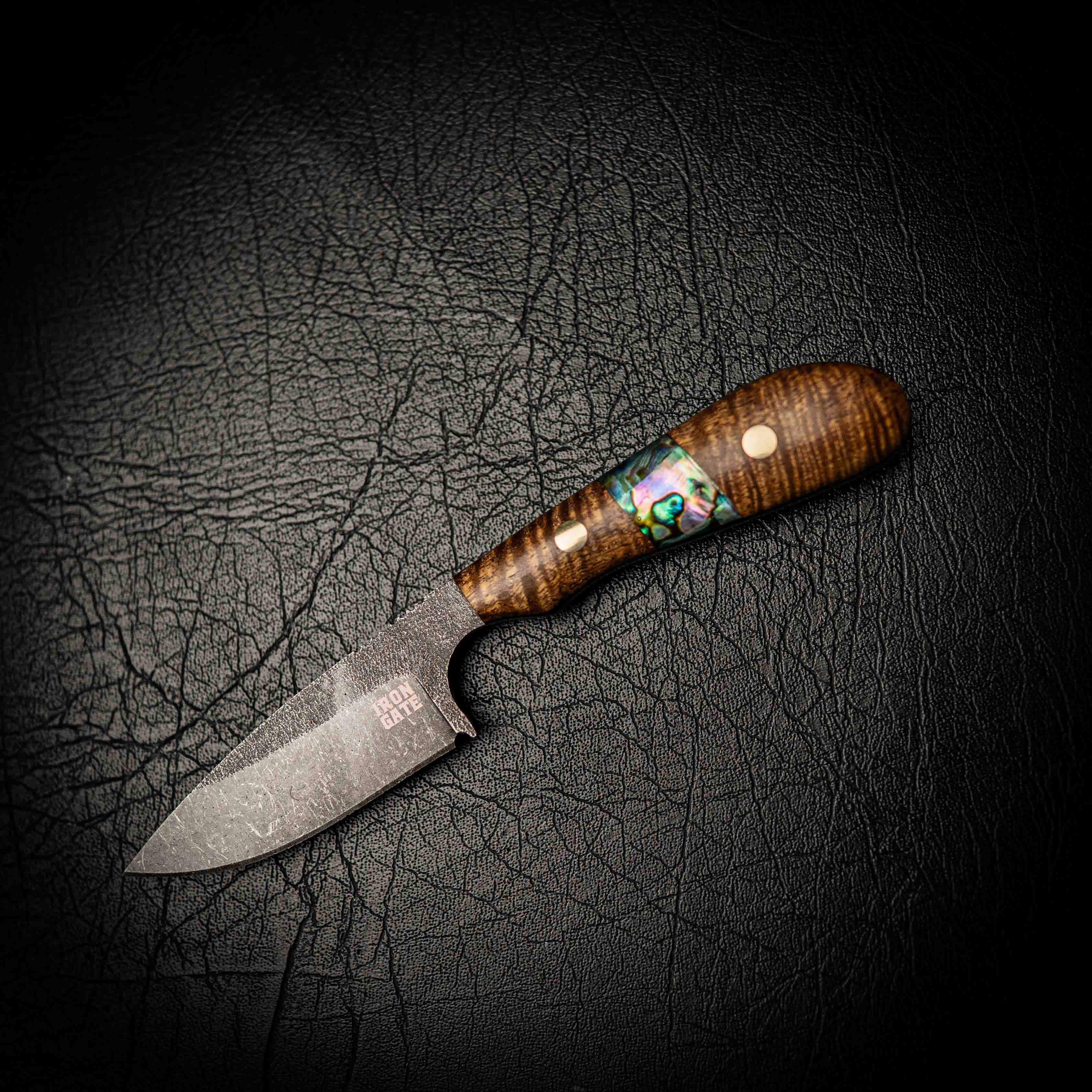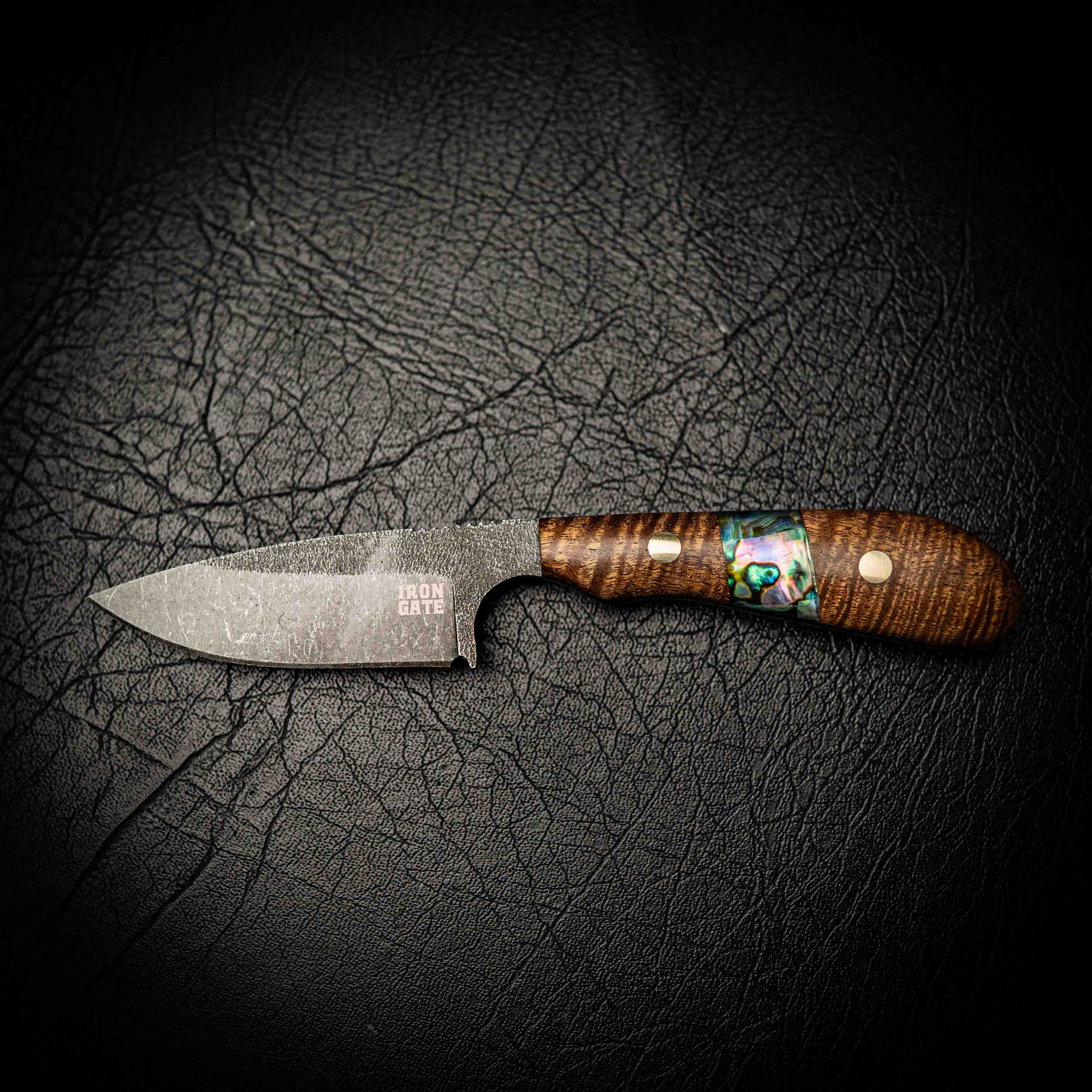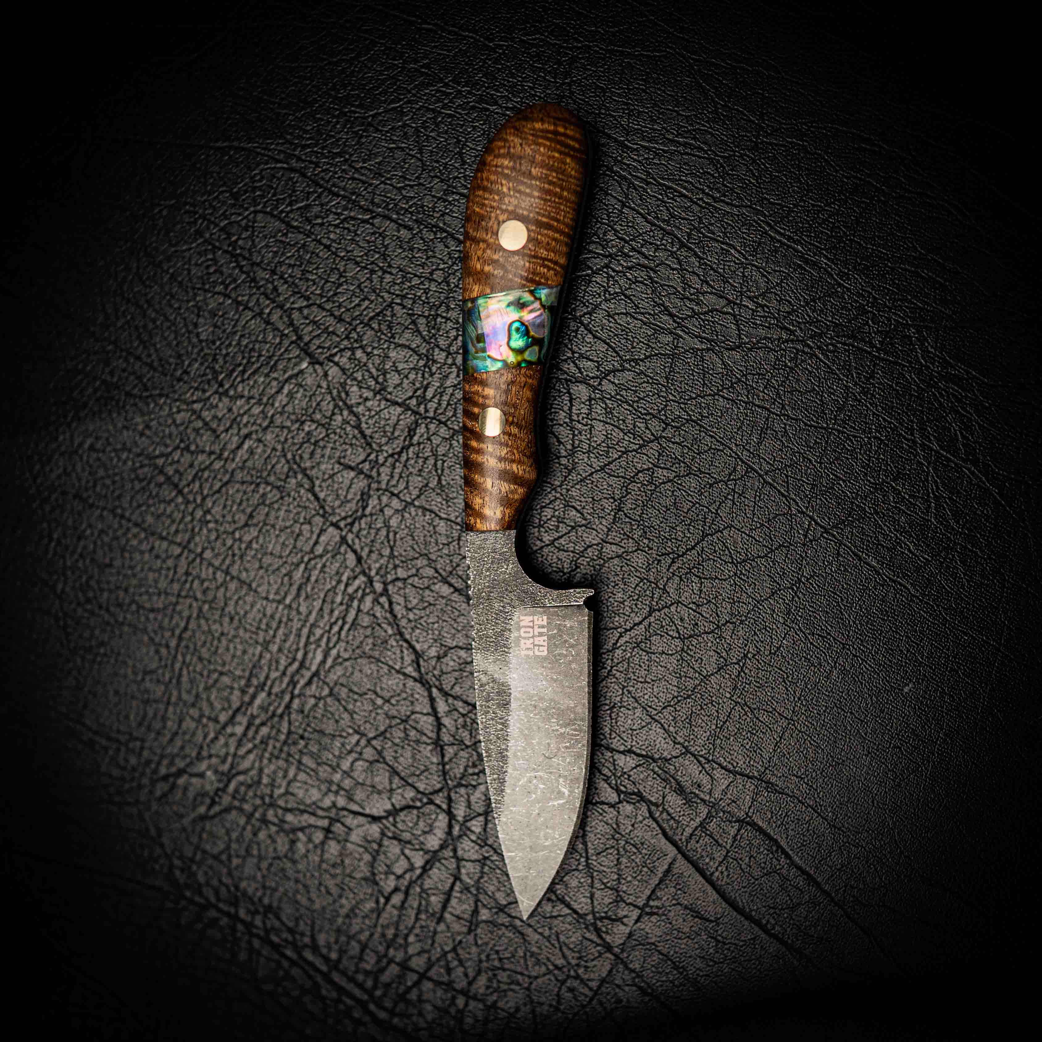 The stonewashed finish gives it a rugged, low-glare look that hides wear and brings out every handcrafted detail. The handle features Stabilised Ringed Acacia, one of Australia’s most character-rich hardwoods, finished with a shimmering Abalone shell inlay that catches the light with ocean-inspired depth. Each handle is shaped and polished by hand — no two knives are ever the same.