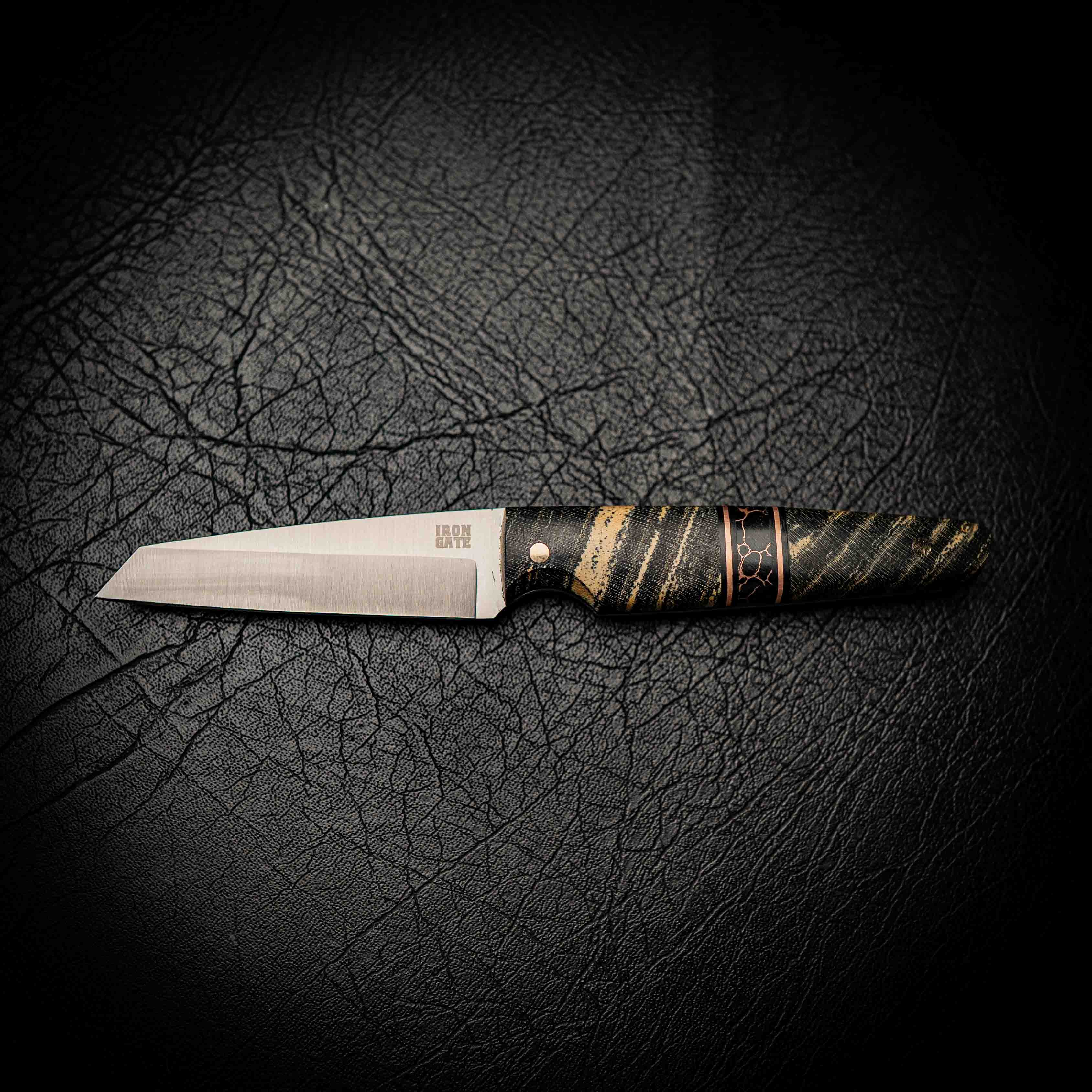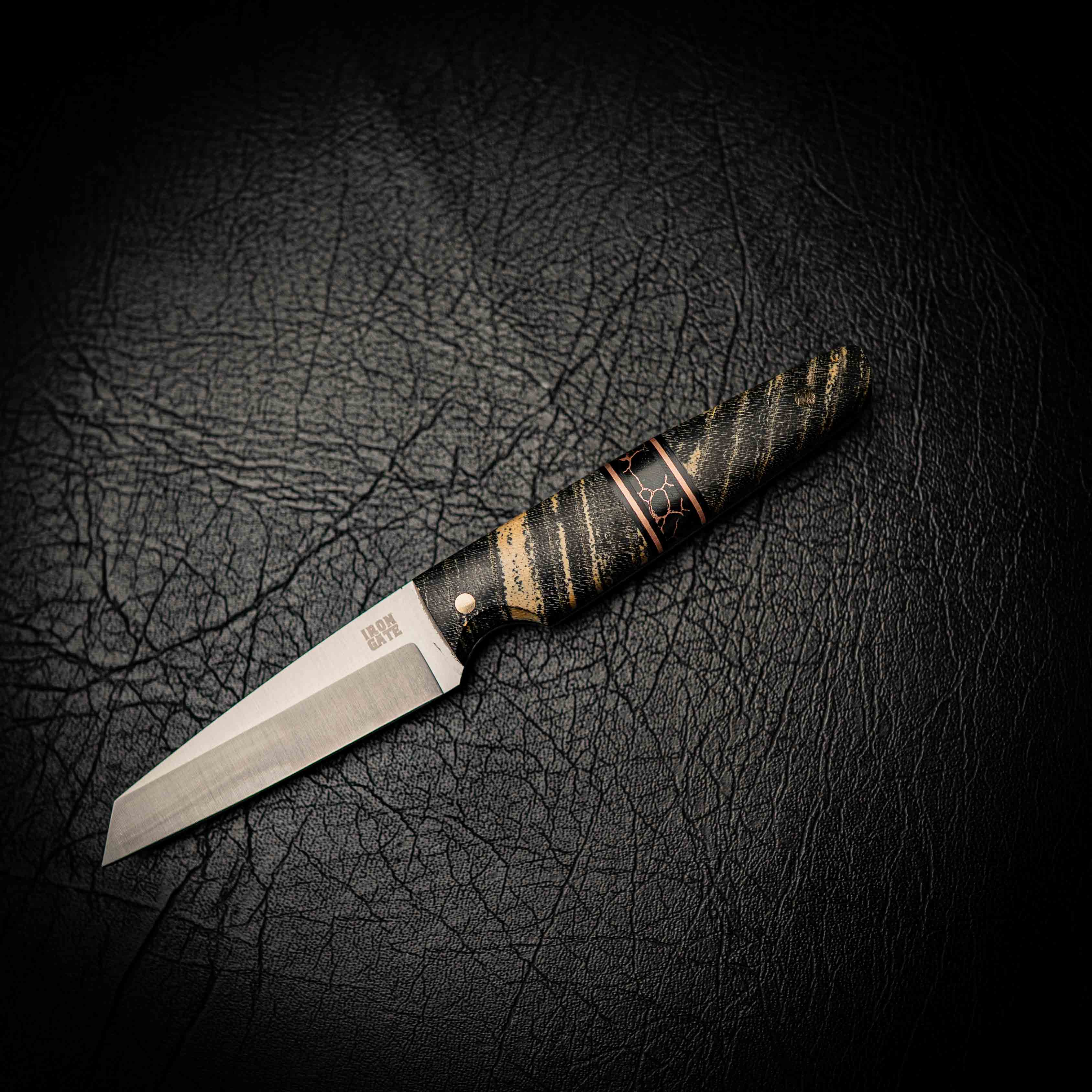 The stonewashed and acid-etched finish gives the blade a rugged, matte appearance that resists wear while showcasing every handcrafted grind line. The handle features richly stabilised Pagoda wood, paired with a Copper TruStone spacer for warmth and contrast. Hand-shaped and polished for balance and comfort, it’s a striking blend of natural texture and refined metallic detail.