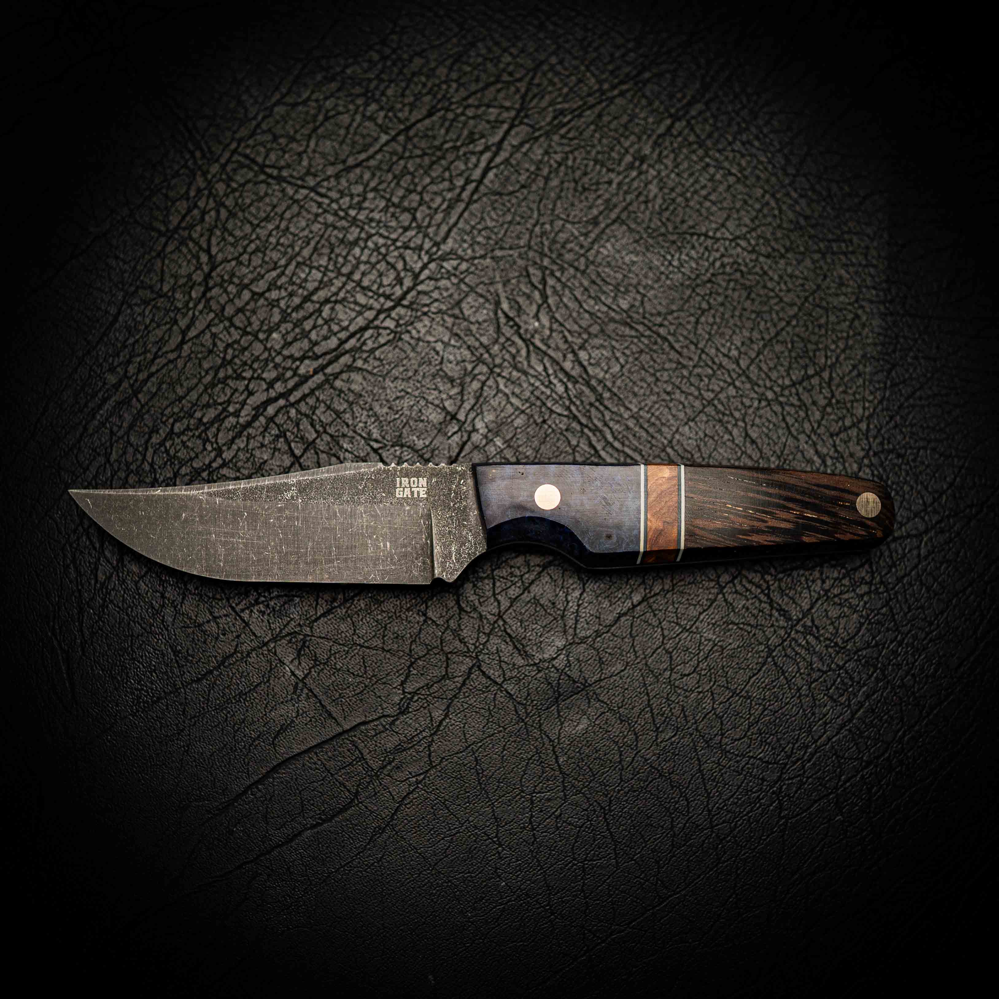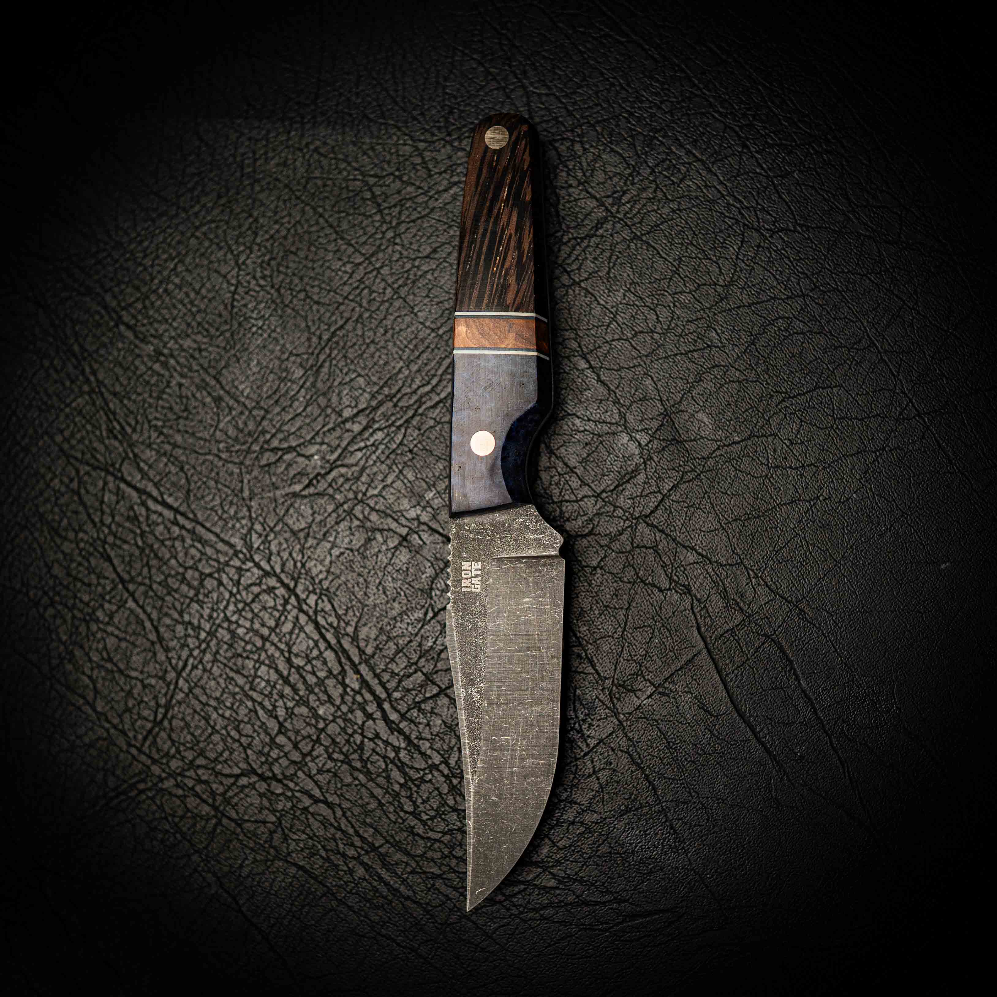 The stonewashed finish gives the blade a rugged, low-glare texture that hides wear while showcasing the handcrafted grind lines. The segmented handle pairs dark, textured Wenge hardwood with a crisp Maple spacer and vibrant Blue Dyed Amboyna Burl, each piece hand-shaped and polished for perfect balance, comfort, and a truly unique finish.