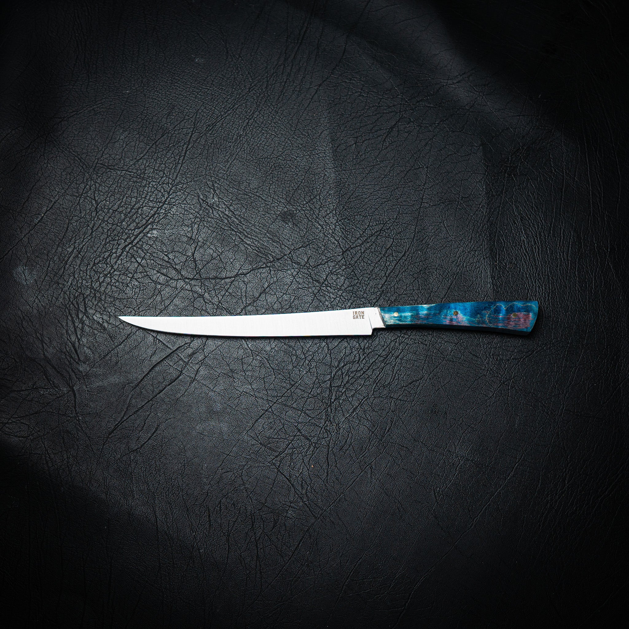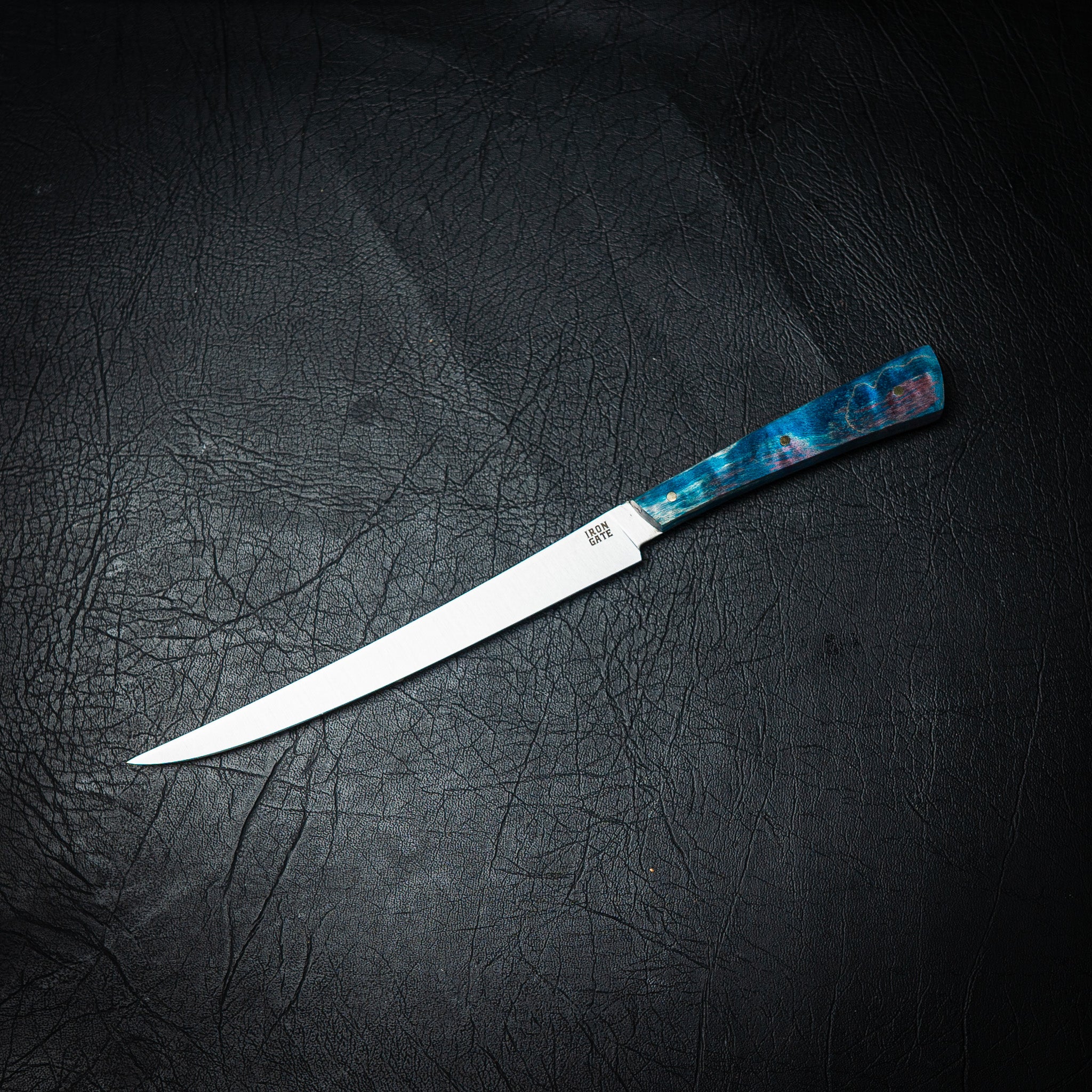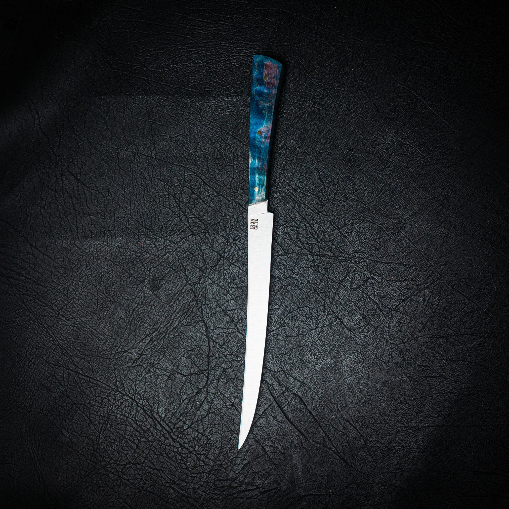 The handle is made from purple and blue dyed curly maple, stabilised to lock out moisture and add strength — making it far more water-resistant than natural timber. Each one is shaped, sanded, and polished by hand right here in Anna Bay, giving every knife its own unique character.