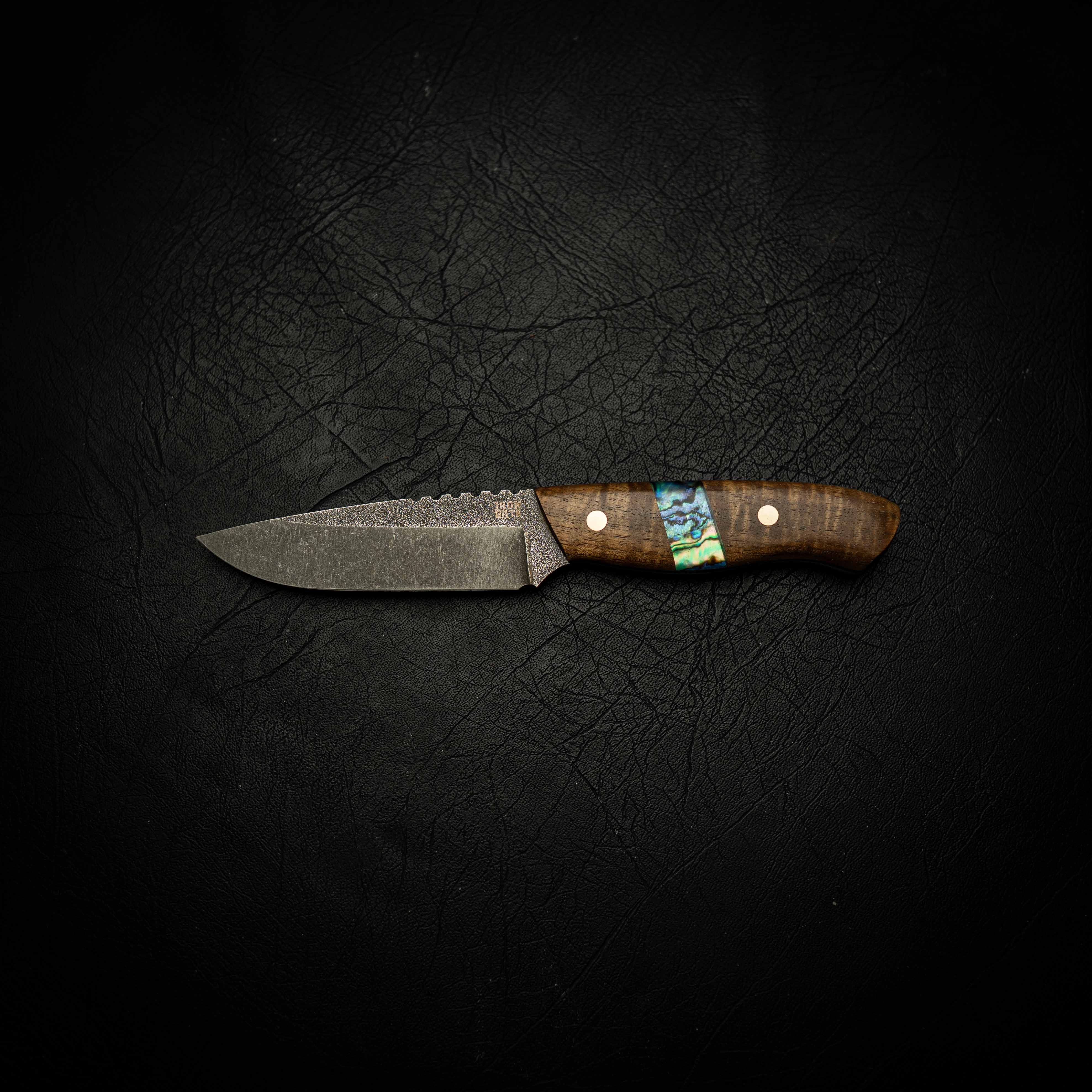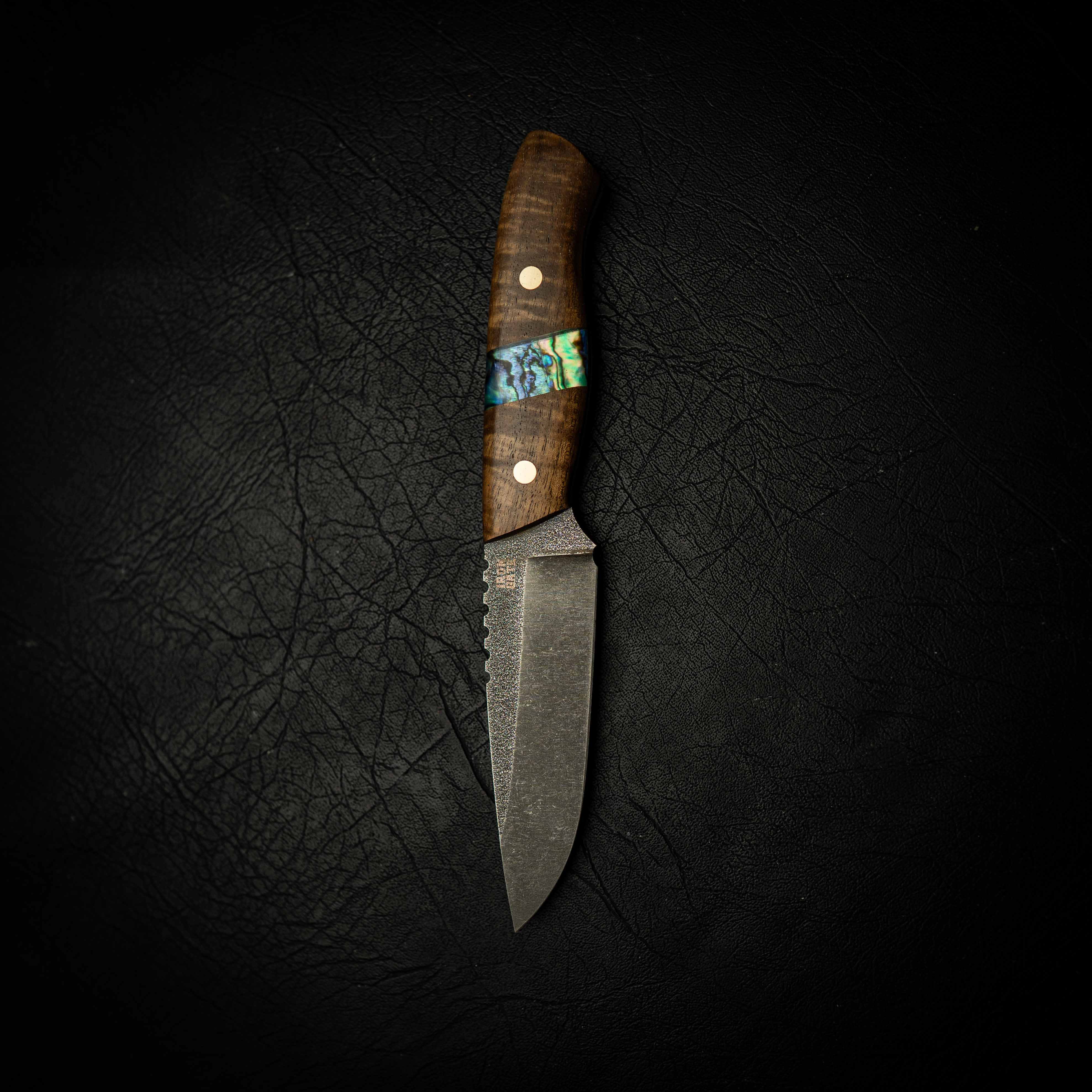 The handle is made from stabilised Tasmanian Blackwood, finished with a natural abalone inlay for a subtle contrast and touch of detail. The timber is stabilised for durability, then hand shaped, hand sanded, and finished to feel secure and comfortable during extended use.