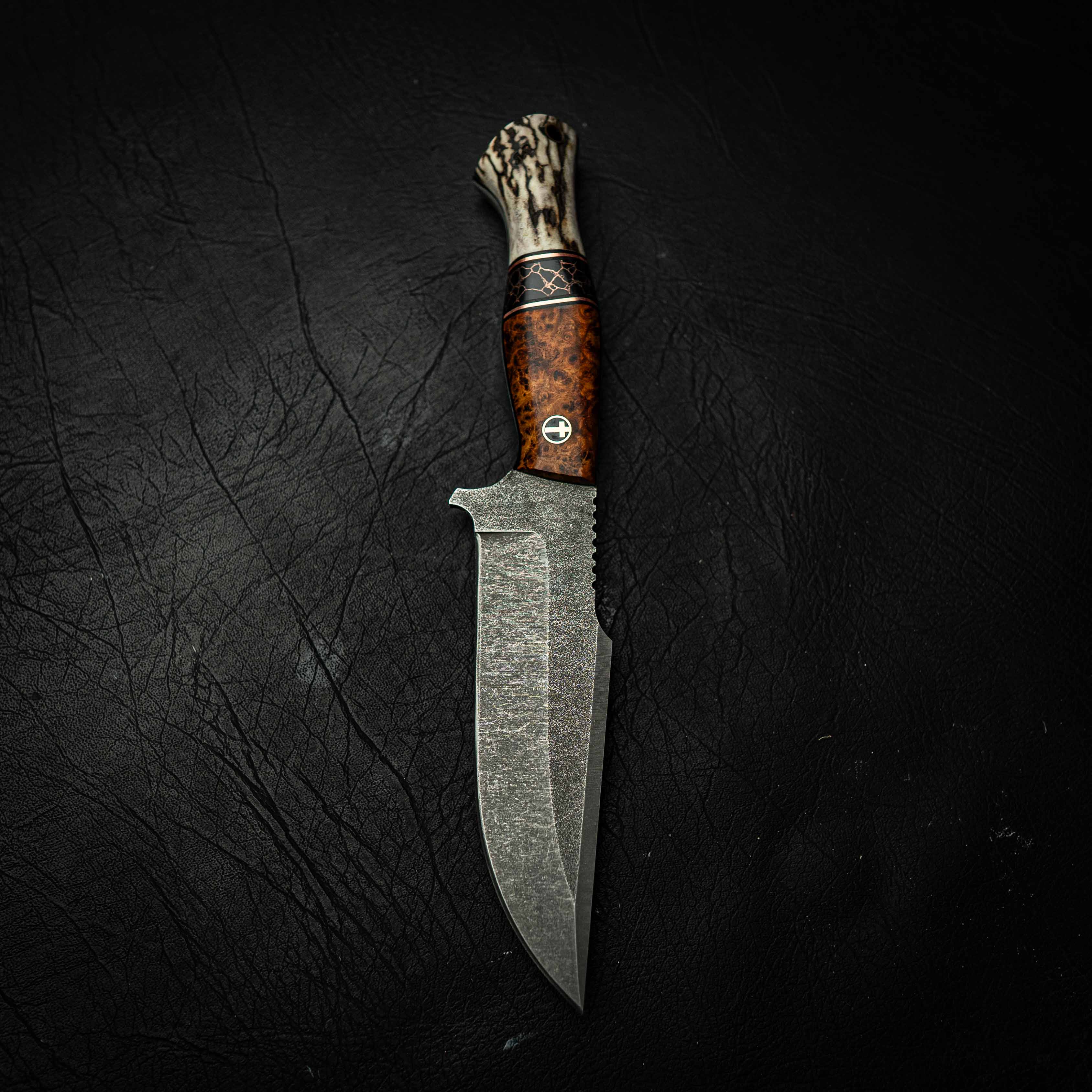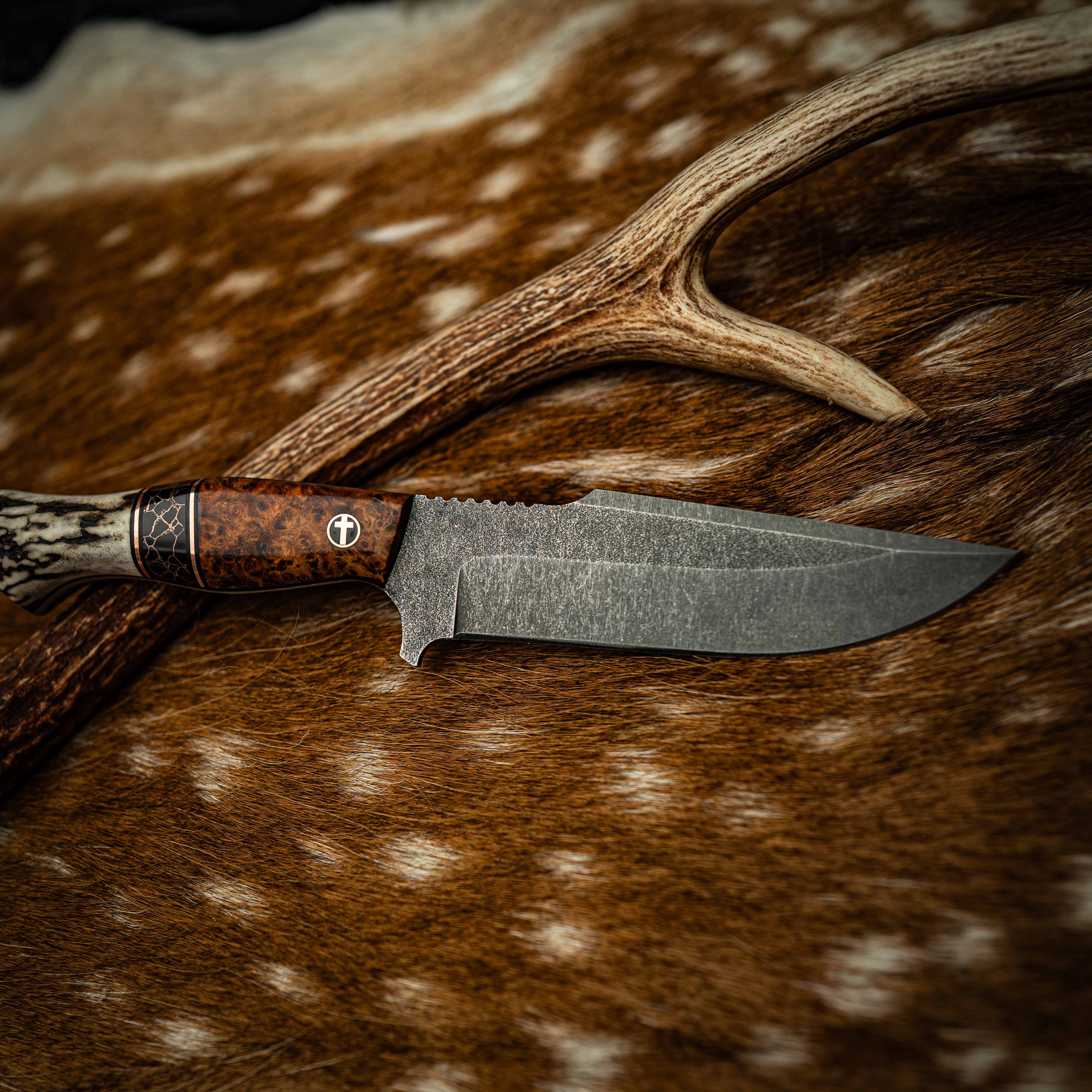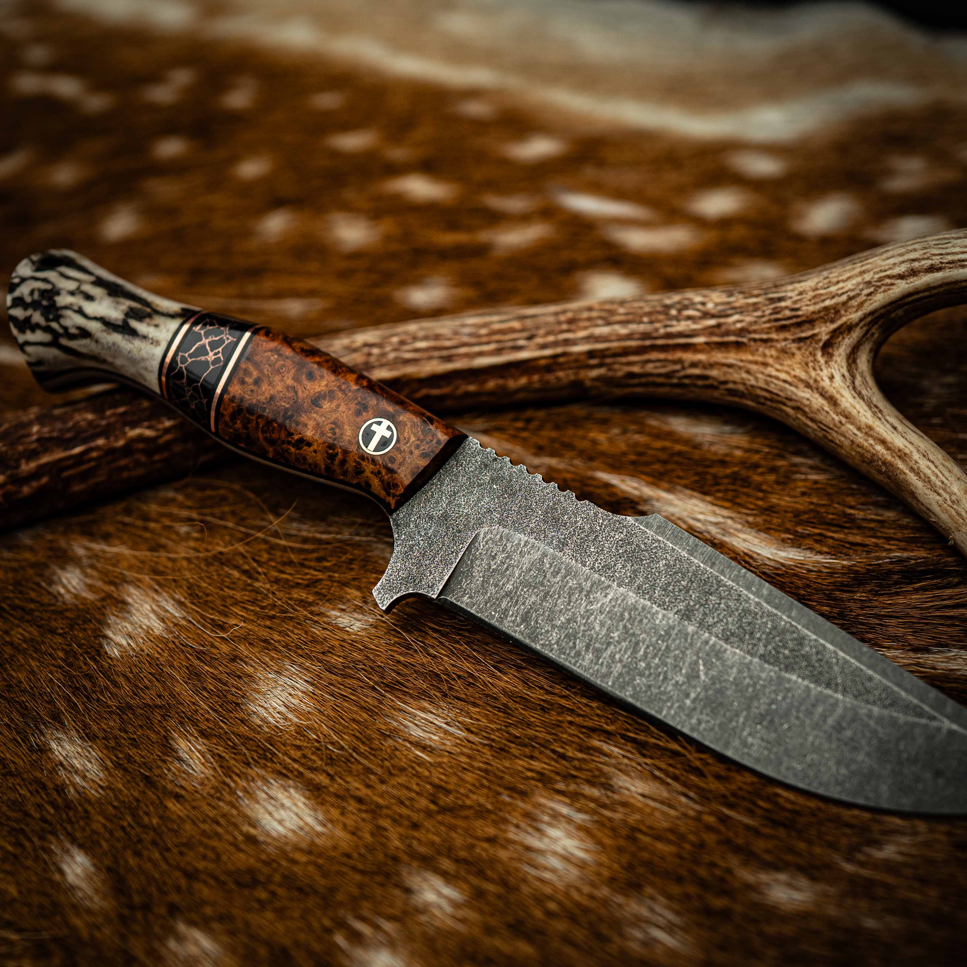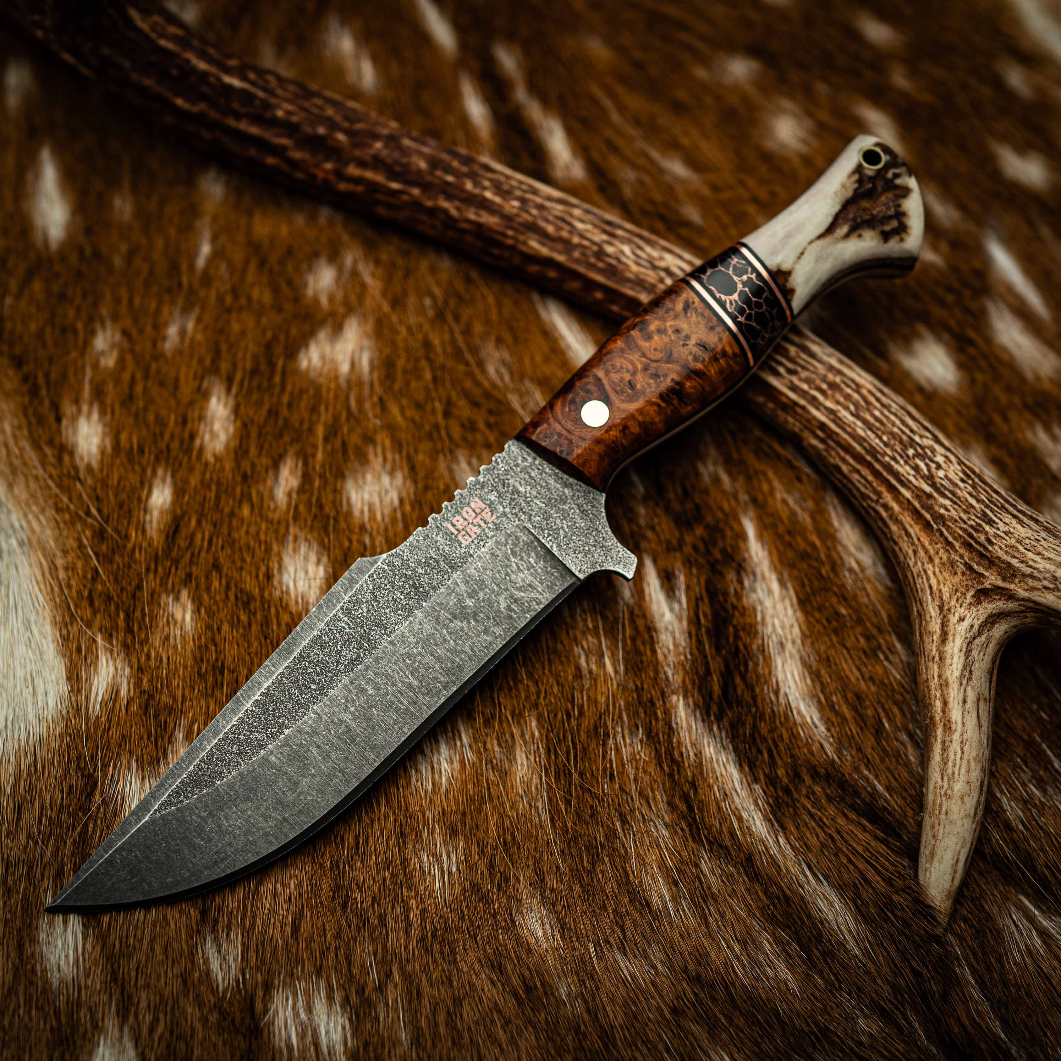 The deep figure of golden Amboyna burl paired with copper accents, TruStone, and natural deer antler creates a handle that is both striking and rugged enough for serious outdoor use.