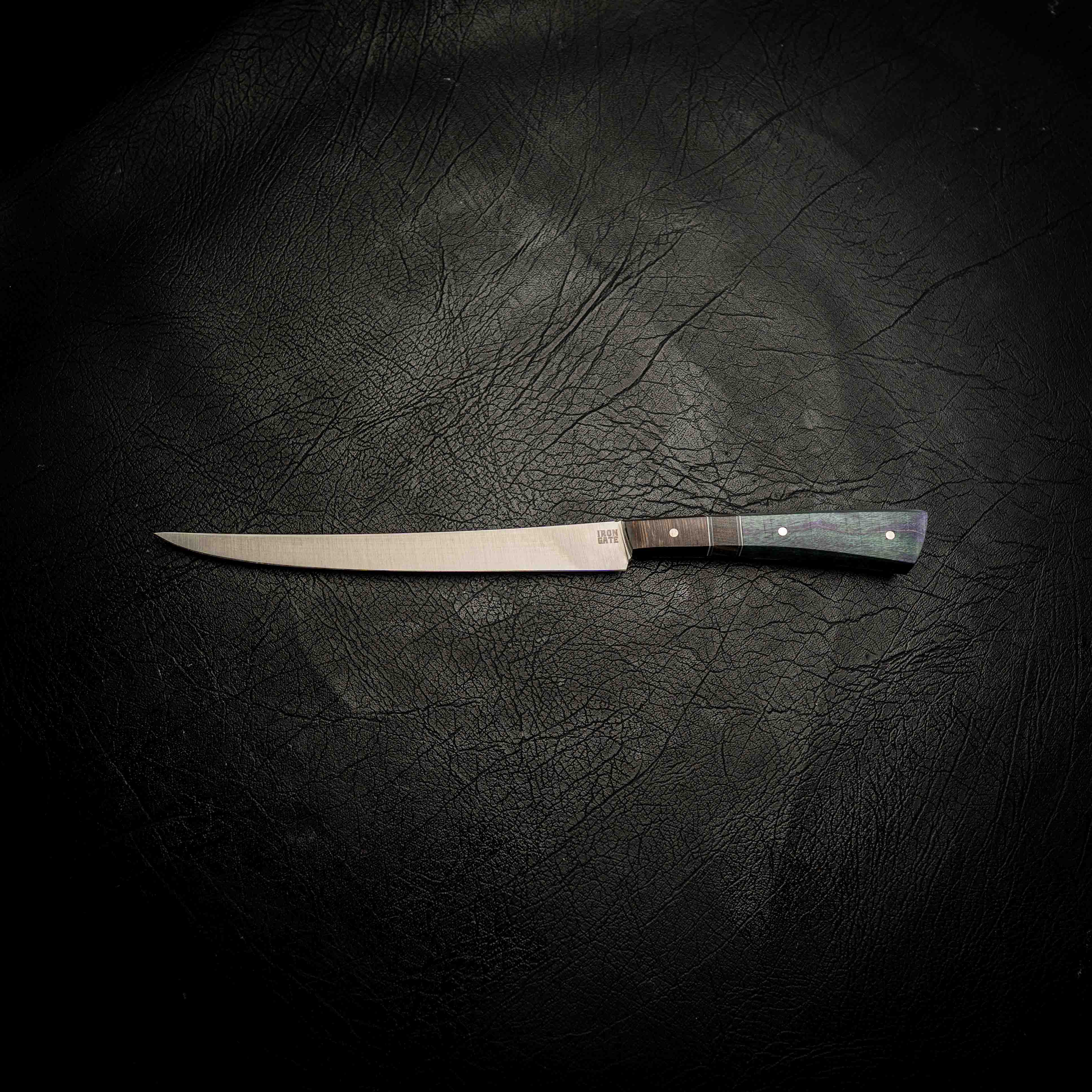 This version features a segmented handle of Wenge, Black Palm and Dyed Maple. The Wenge brings strength and dark grain, the Black Palm adds bold texture, and the dyed Maple gives the handle colour and unique character. Each one is shaped by hand and completely one-of-a-kind.