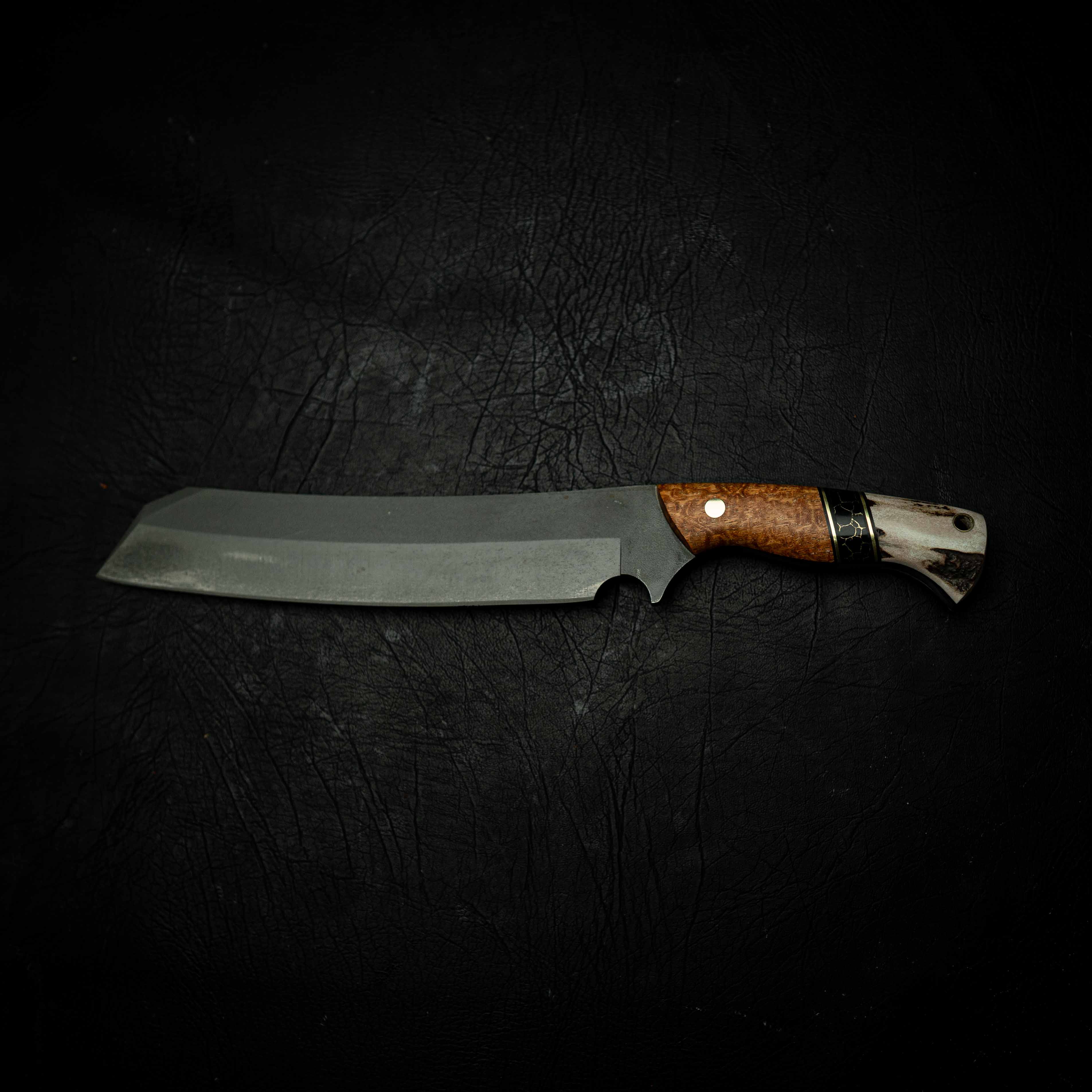 The handle features stabilised Afzelia Xylay paired with brass TruStone and natural Deer Antler, finished with a solid brass lanyard tube. The stabilisation process strengthens the timber and enhances its rich natural figuring, while the combination of brass accents and antler creates a rugged yet premium look suited to a hard-use chopper.
