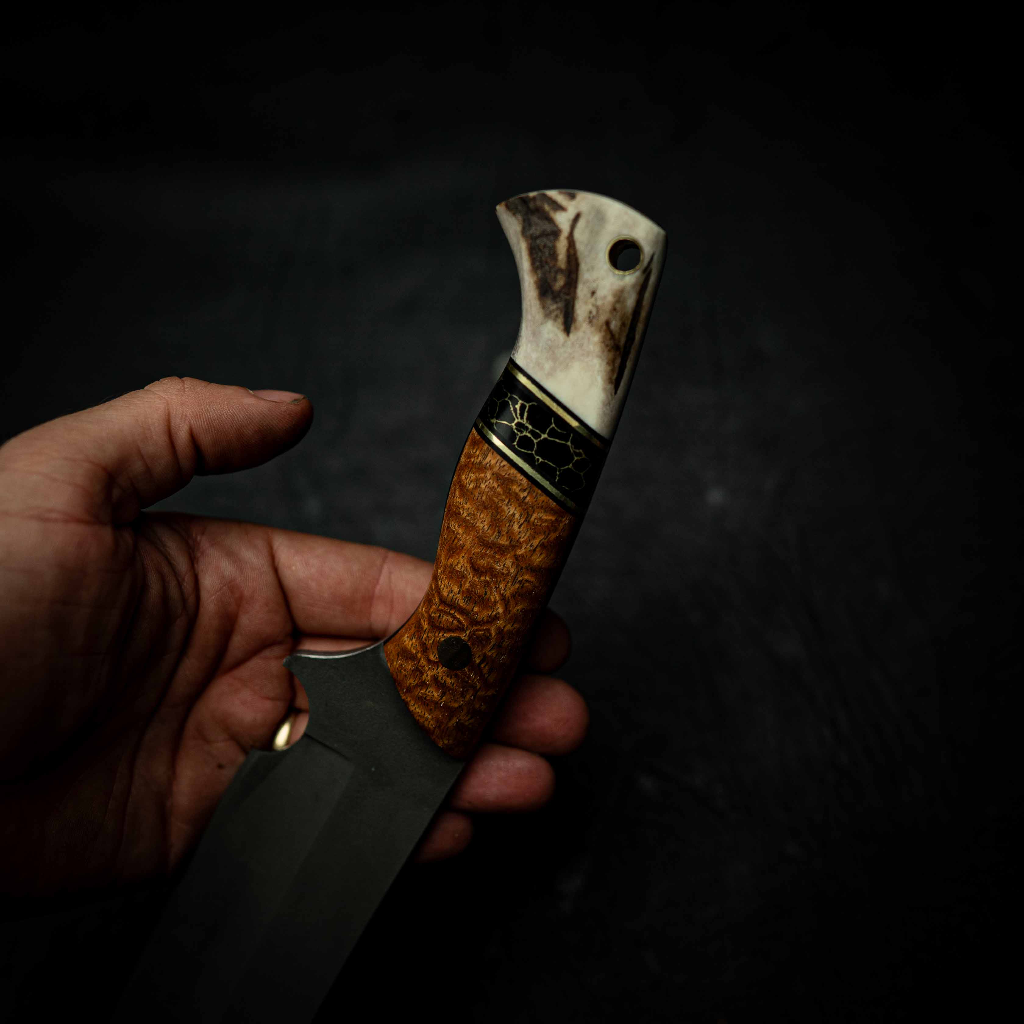 • Stabilised Afzelia Xylay handle with brass TruStone and Deer Antler