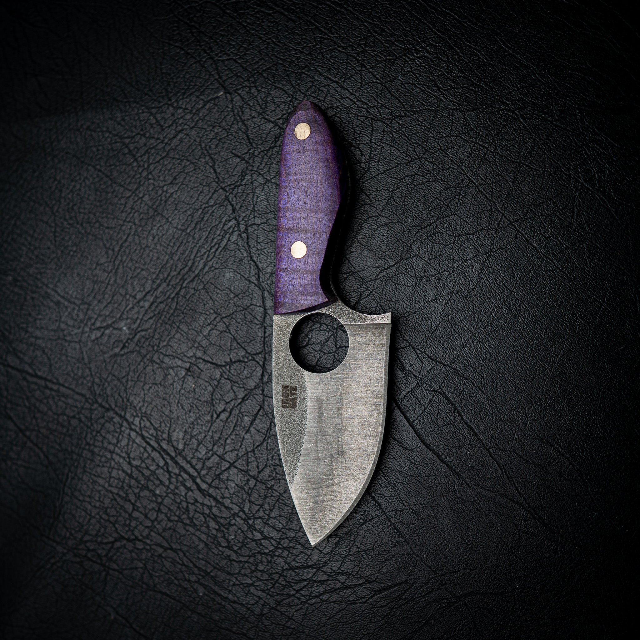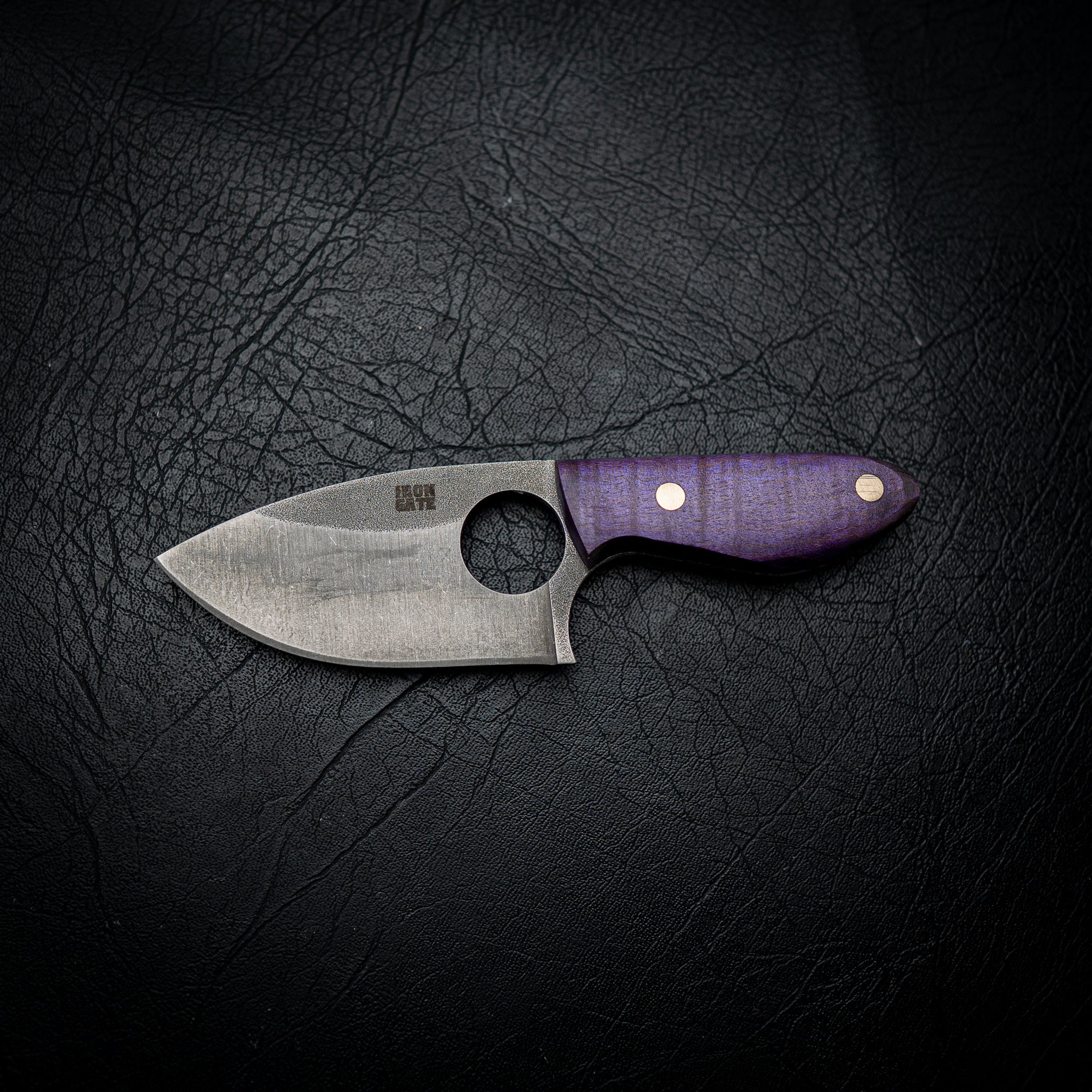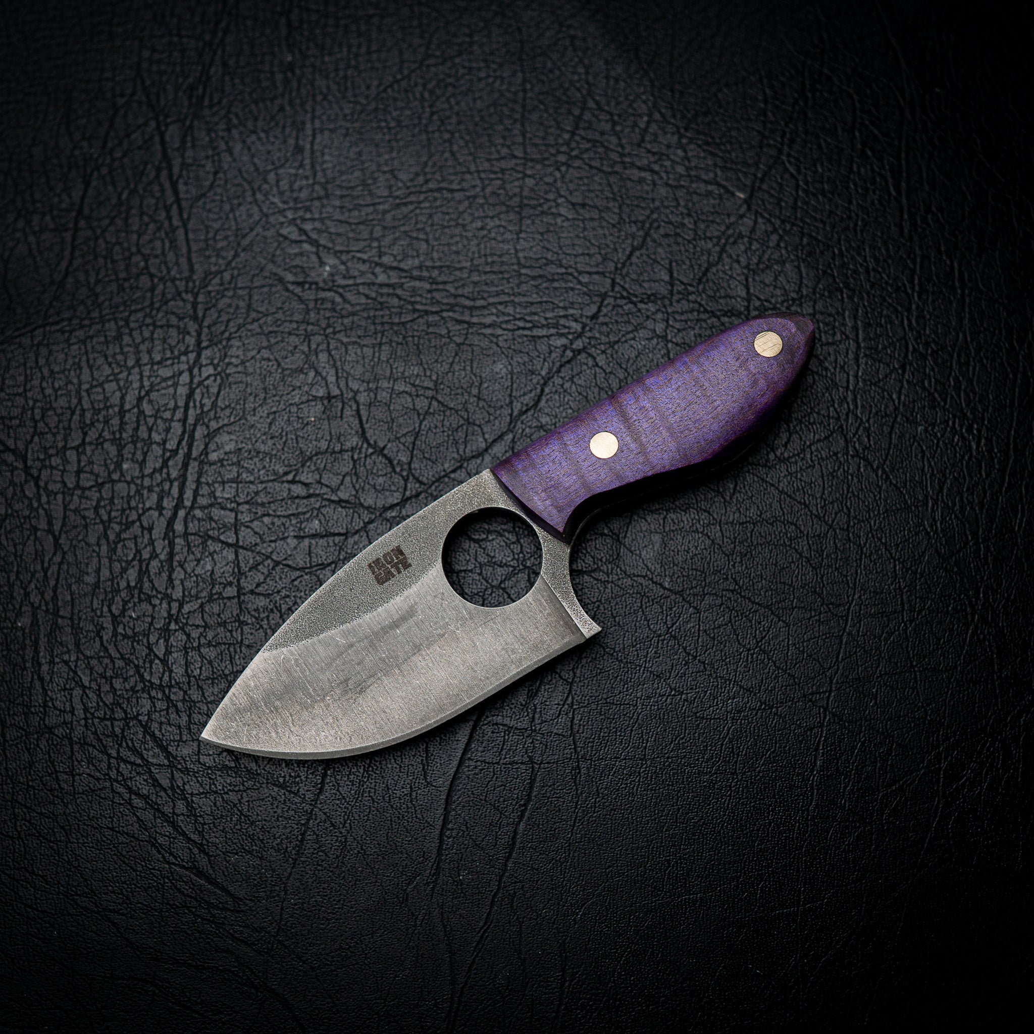 This version features a Purple Dyed Curly Maple handle, offering a vibrant burst of colour with rich natural figure. Each handle is hand-dyed, shaped, and polished by hand — no two are ever the same.